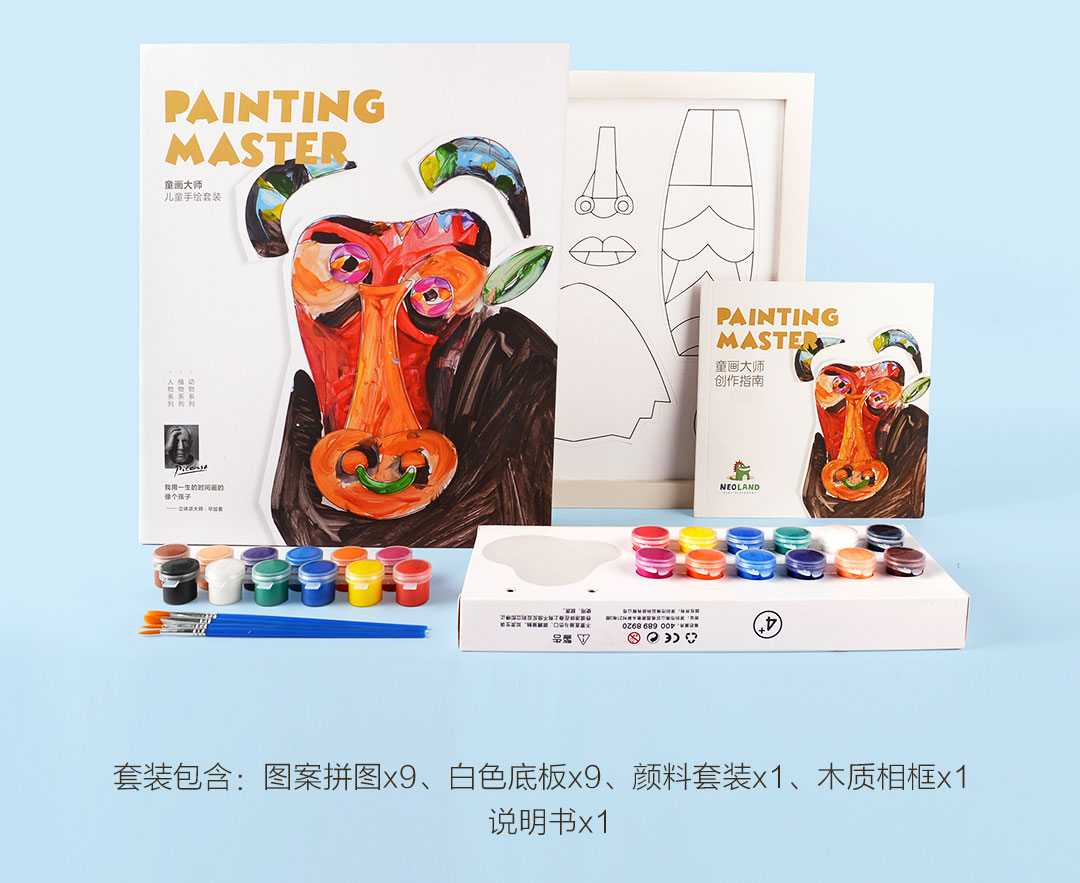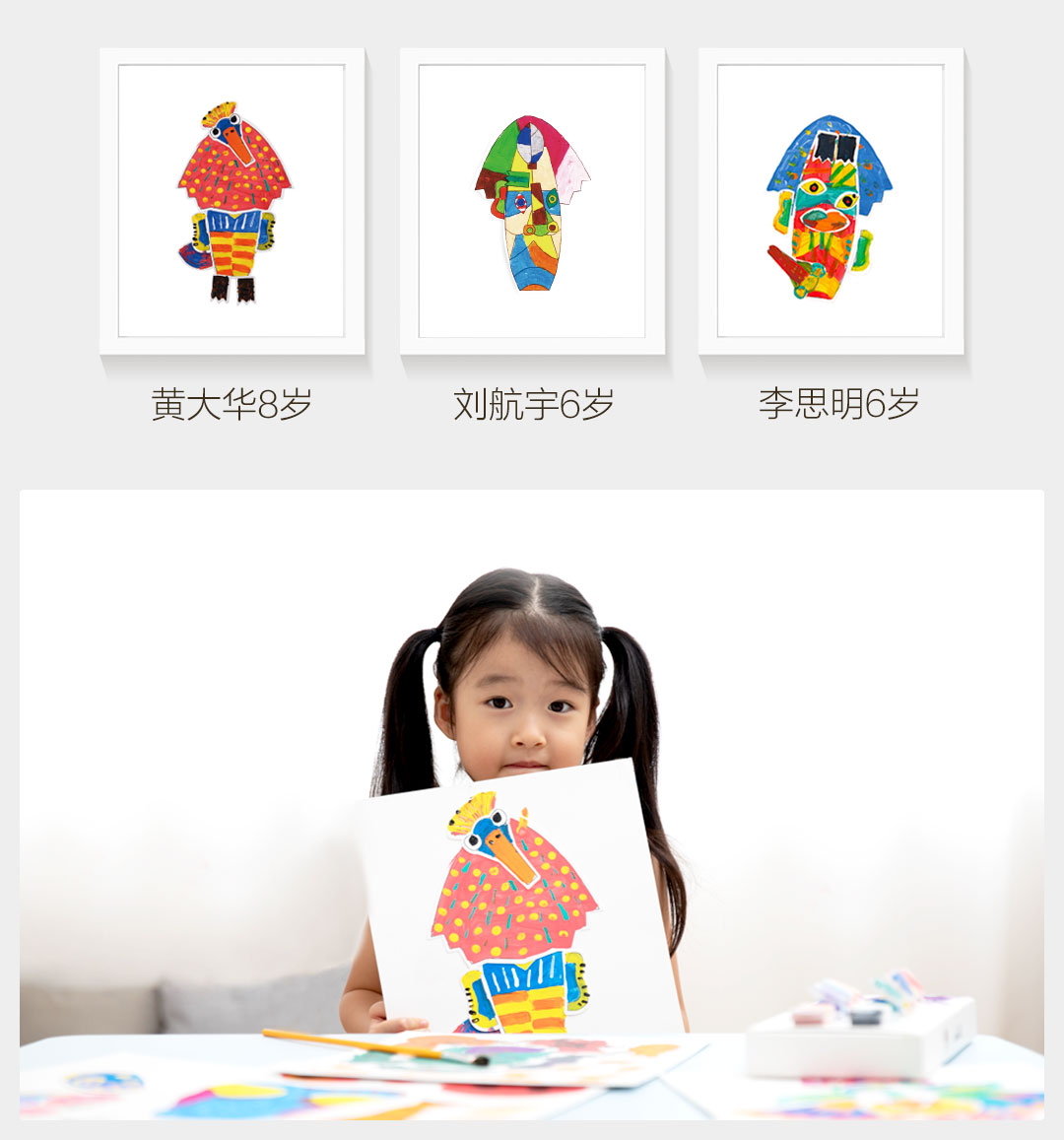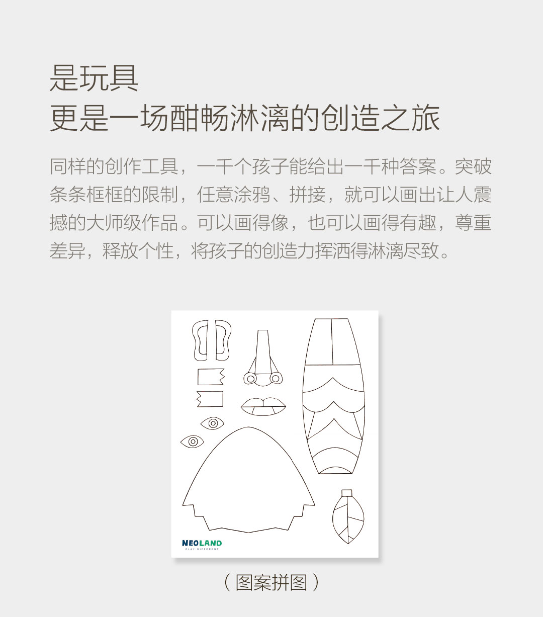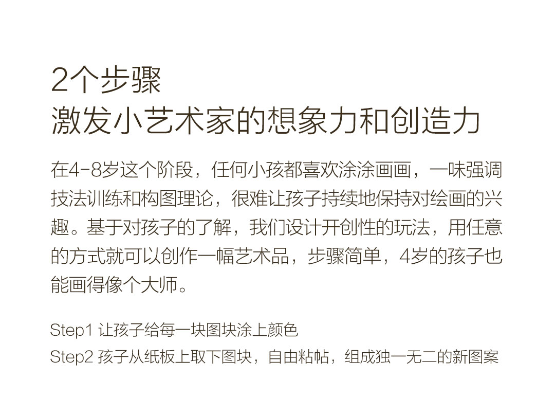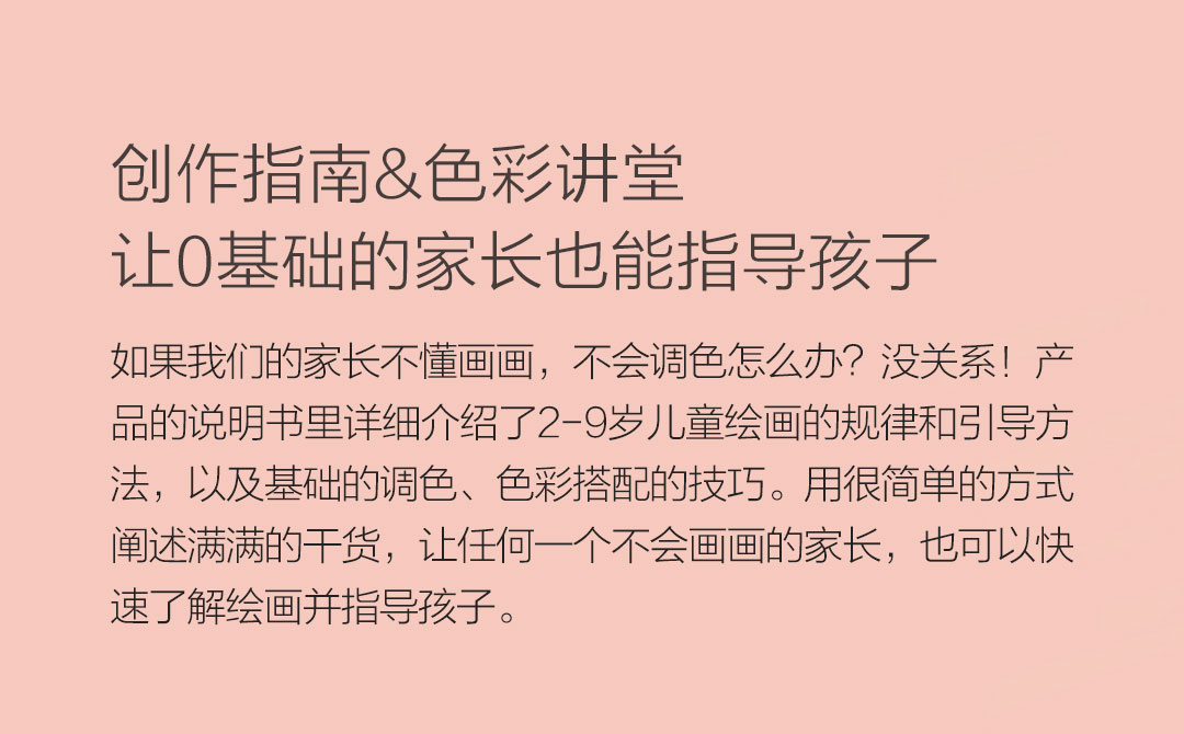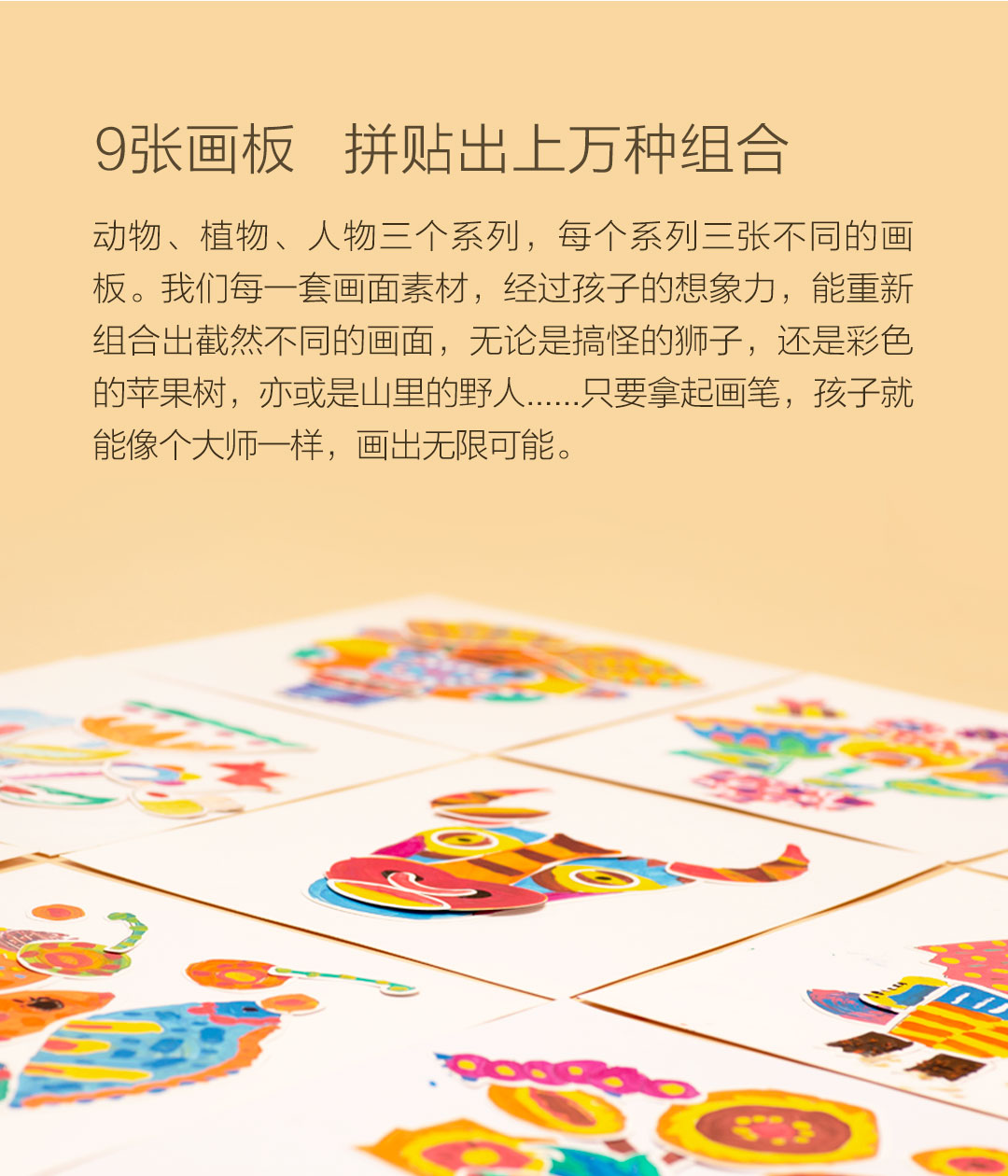 产品玩法:9张画板,拼贴出上万种组合。说明书详细介绍了2-9岁儿童绘画的规律和引导方法,以及基础的调色、色彩搭配的技巧。