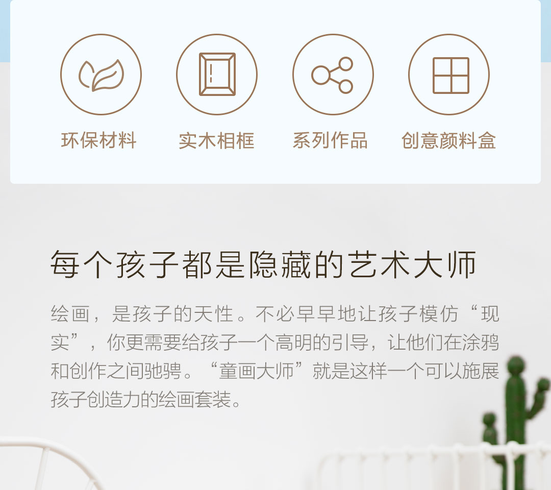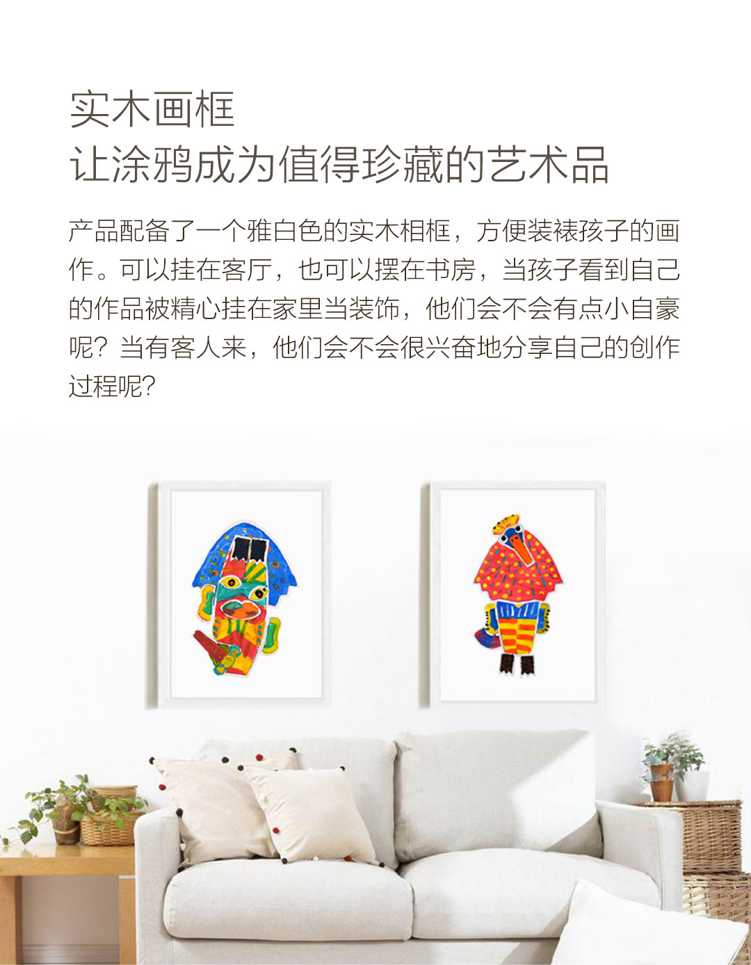 产品配备了一个牙白色的实木相框,方便装裱孩子的画作。