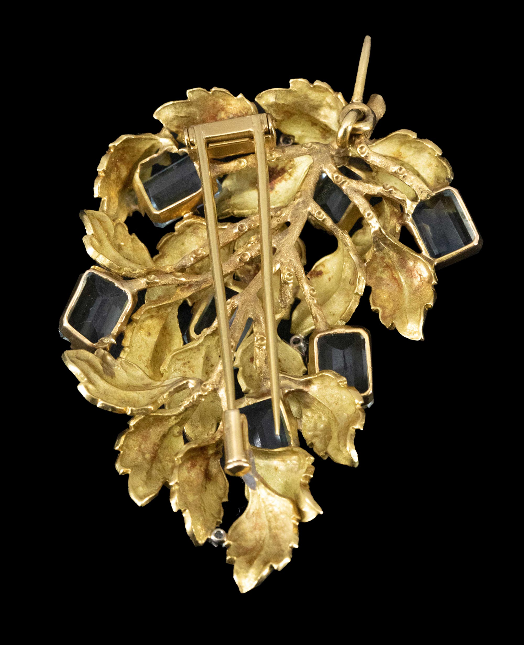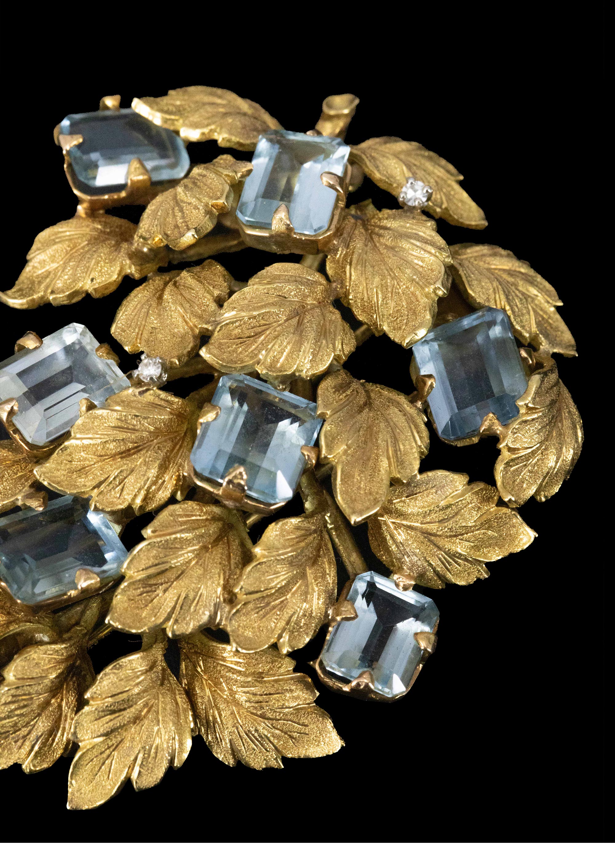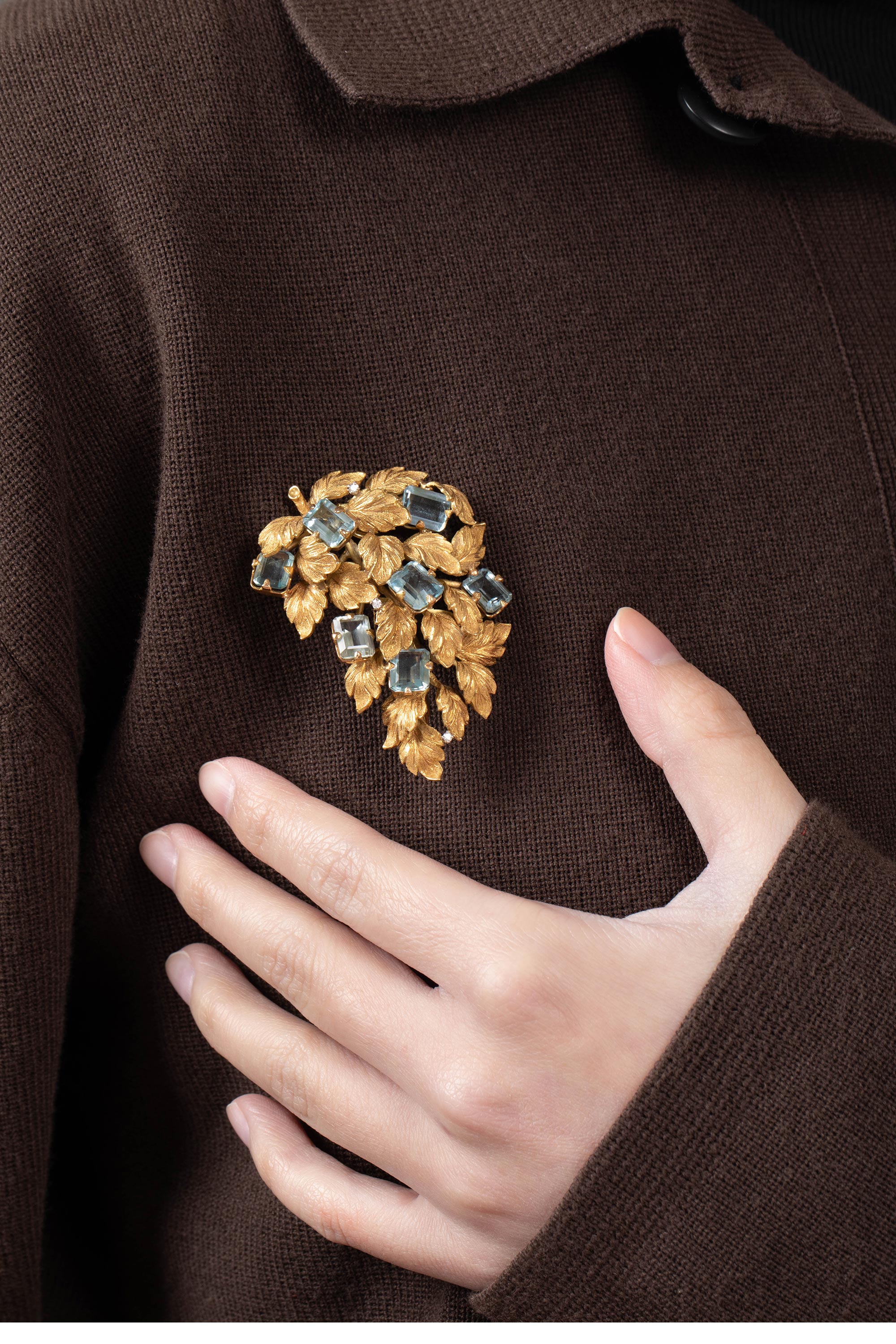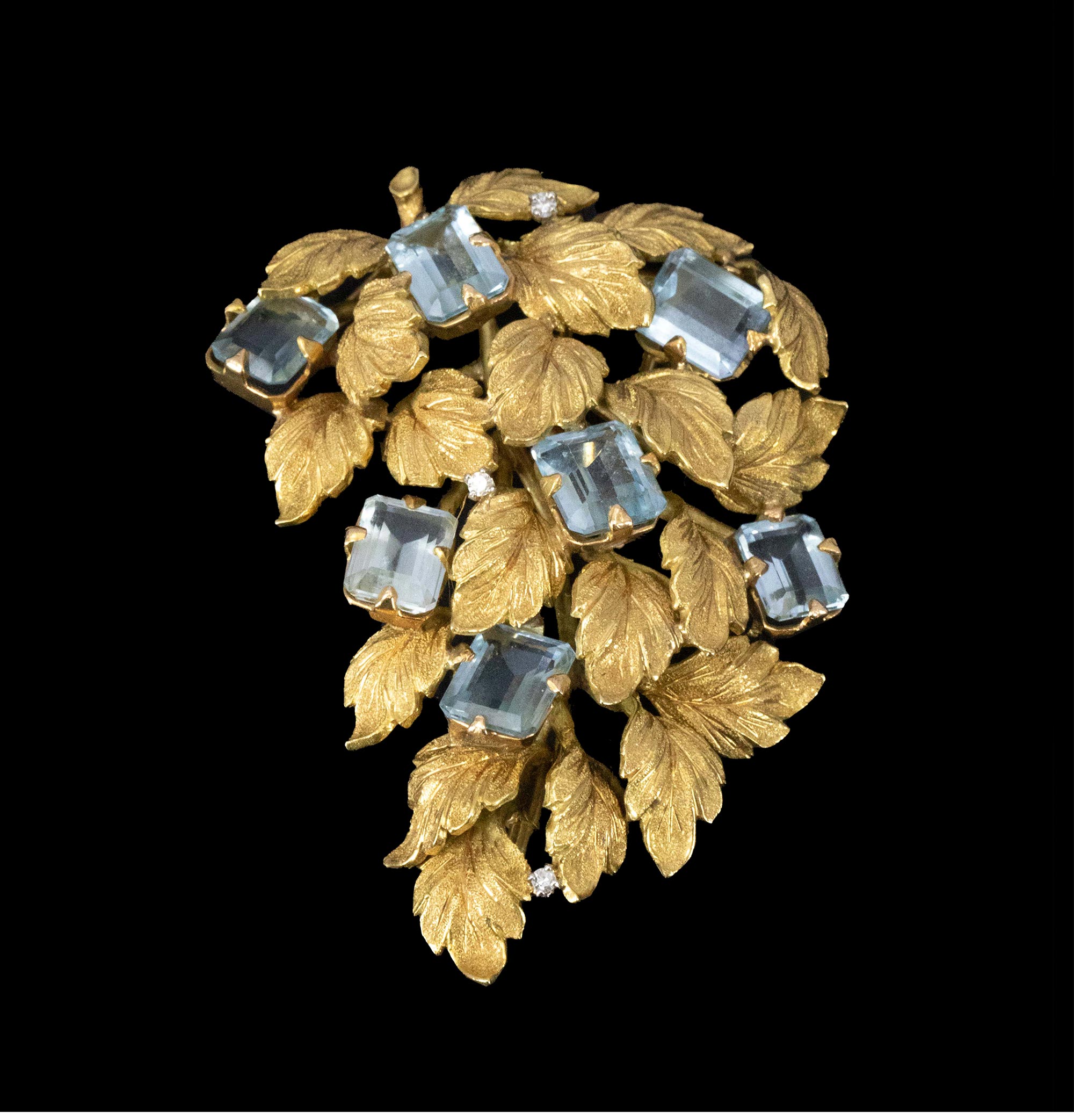 1950年代法国出品叶片造型18K黄金镶嵌海蓝宝石及钻石胸针