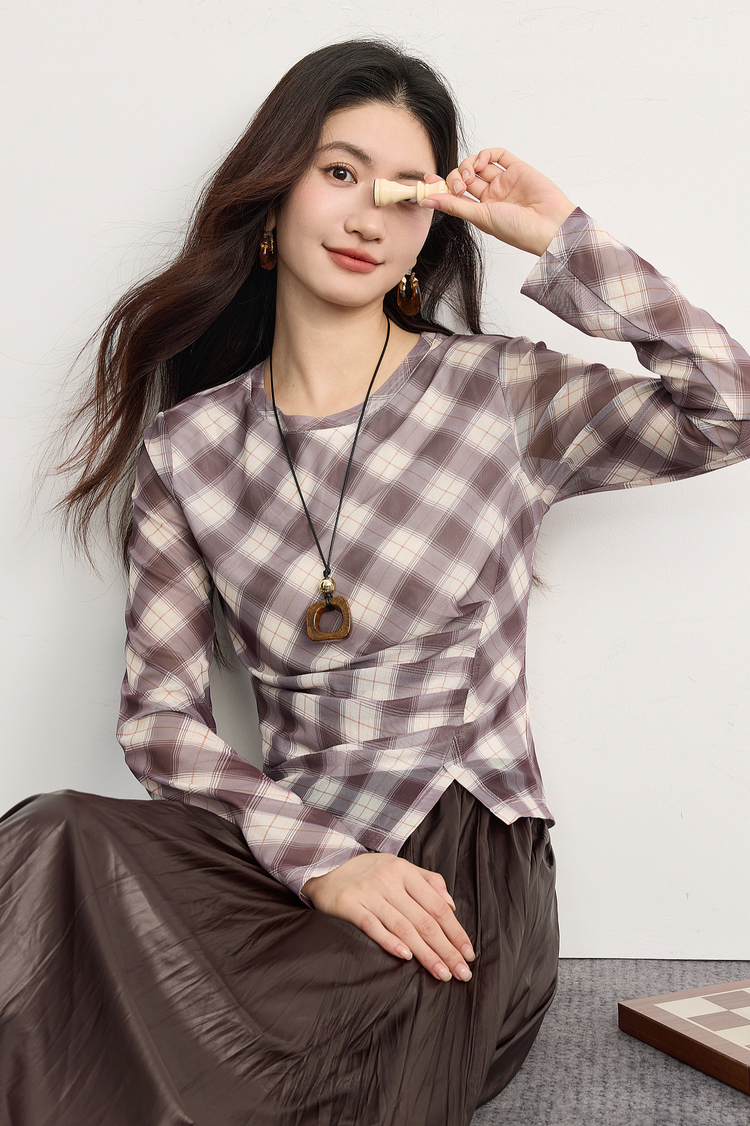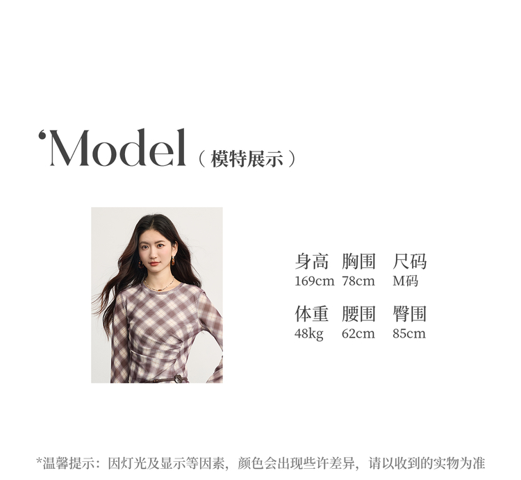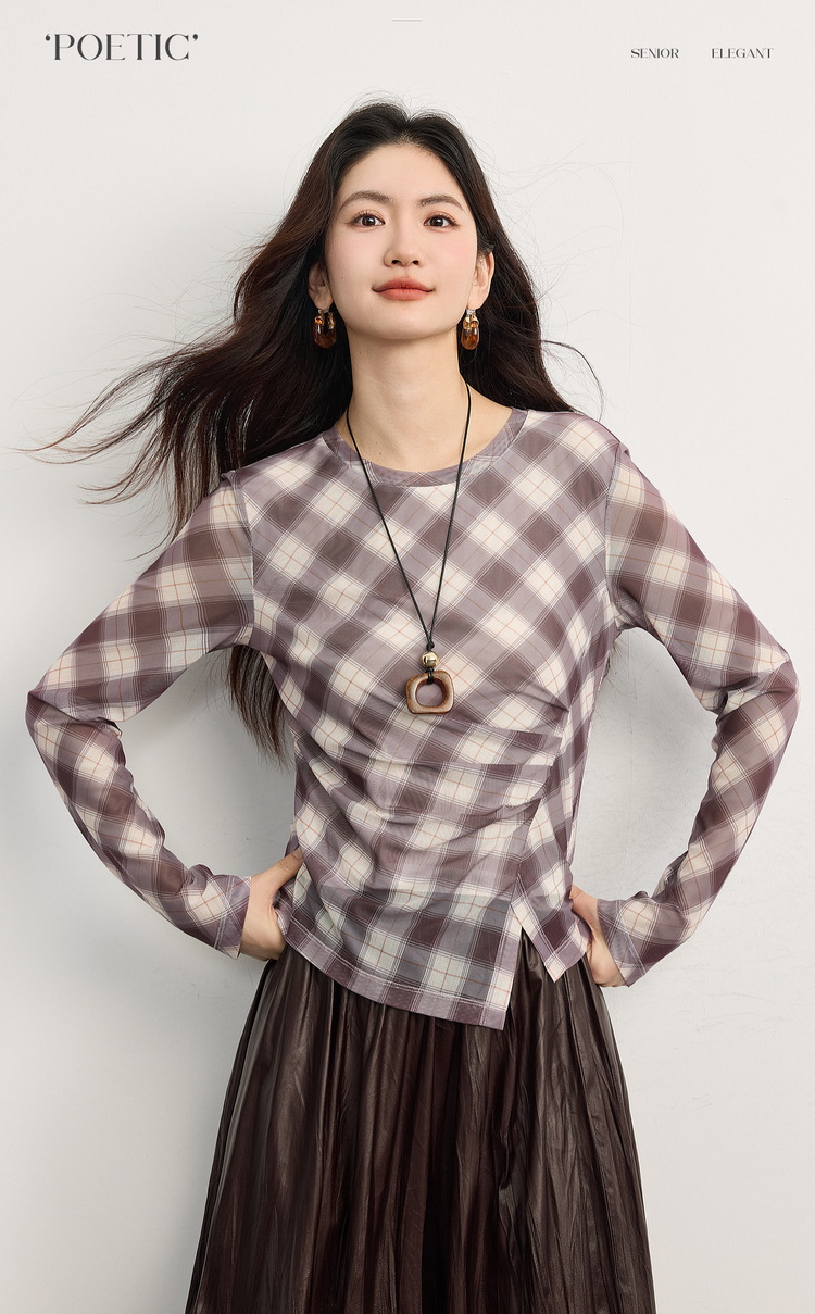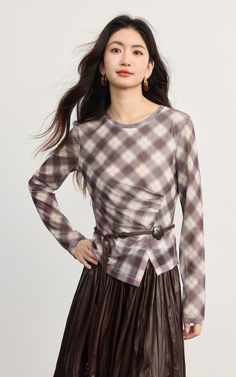 【10/1新品】熙世界可露丽风格纹T恤女长袖秋季设计感不规则收腰网纱打底上衣