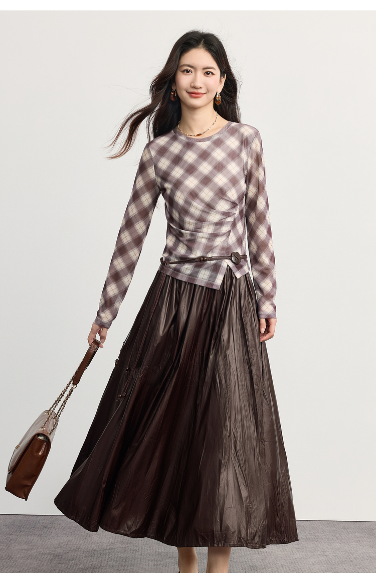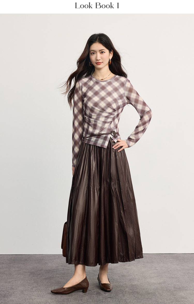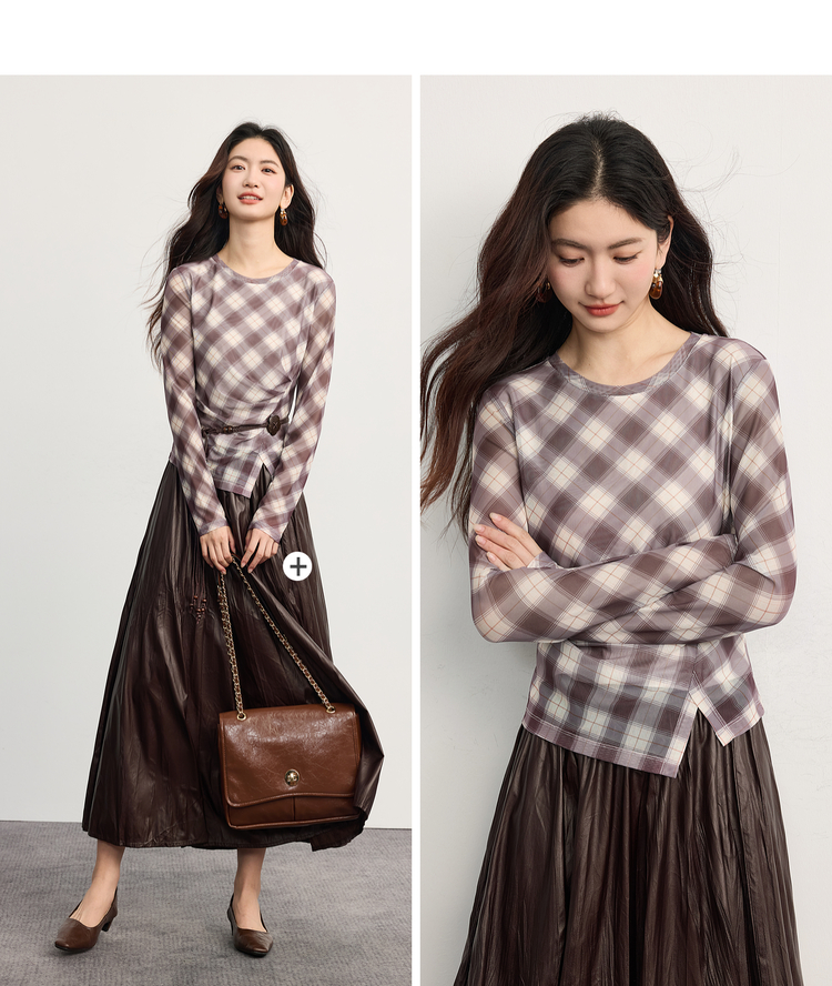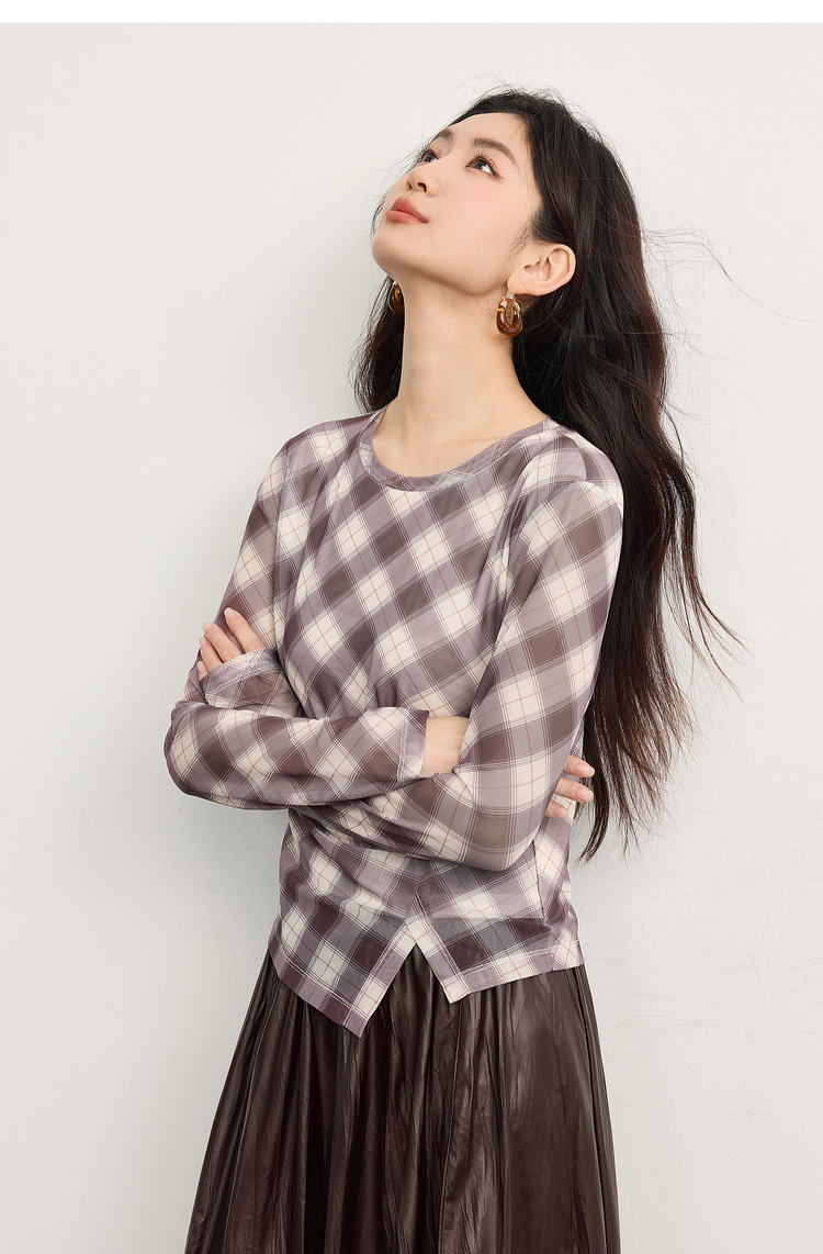 【10/1新品】熙世界可露丽风格纹T恤女长袖秋季设计感不规则收腰网纱打底上衣