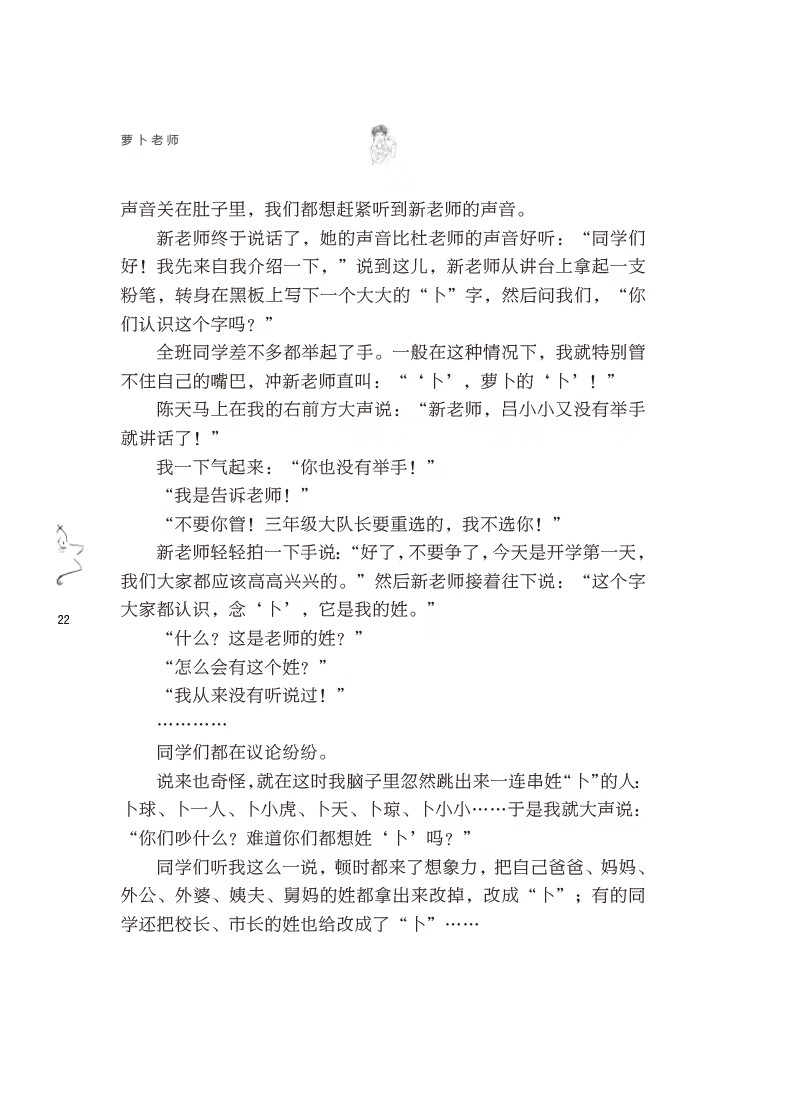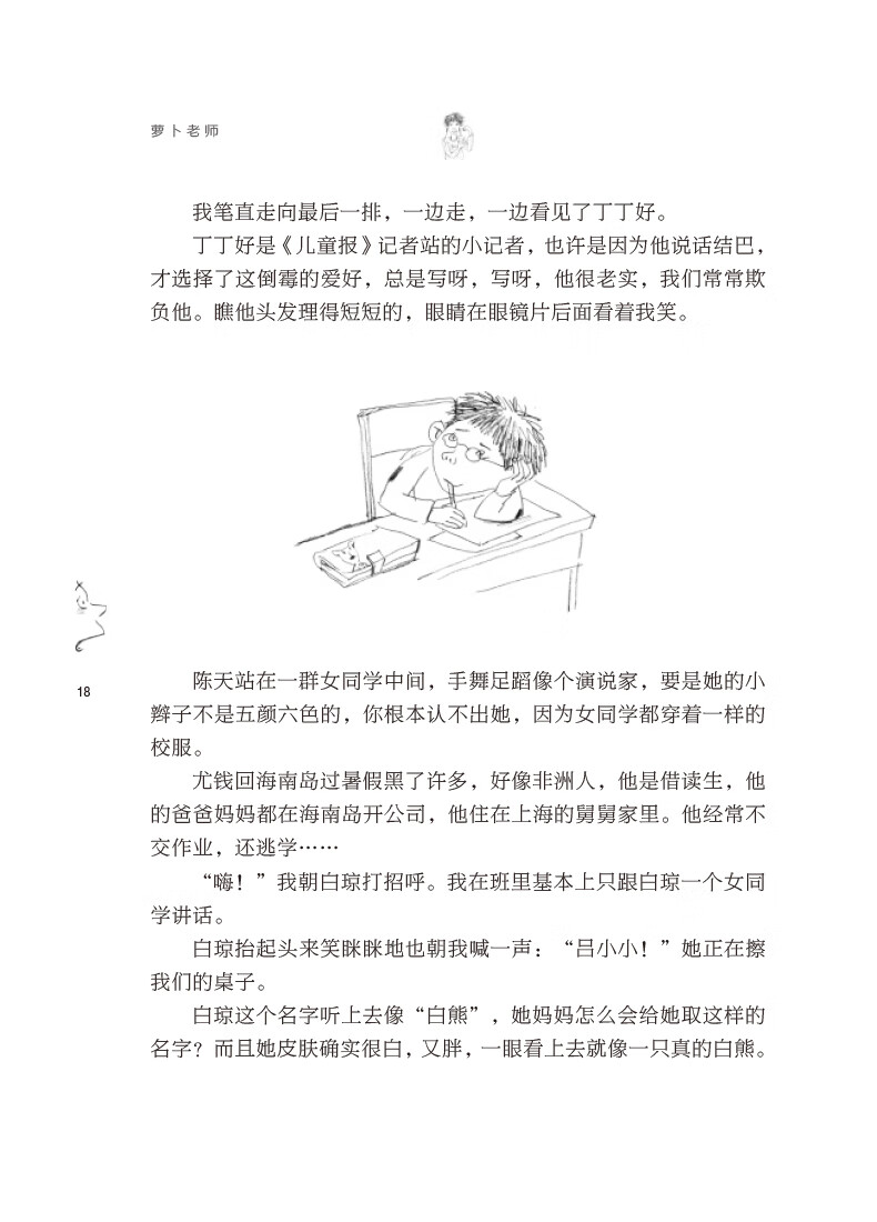 《萝卜老师》是一部校园类长篇儿童小说。讲述的是孩子们与新来的班主任萝卜老师之间发生的一系列事情。这个萝卜老师与你知道的任何老师都不一样!她带着大家一起踢足球,跟孩子们一起笑一起哭。孩子们的天真活泼,善良心地,萝卜老师的与众不同,热爱孩子、关心孩子、真心为孩子着想的一番热忱,必定能够打动你。