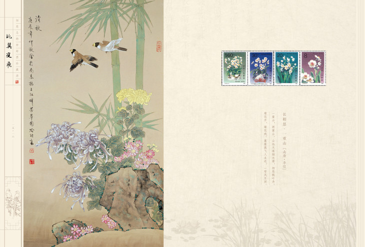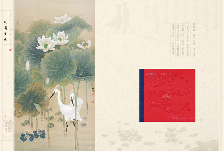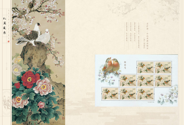 此册汇集了喻继高大师的工笔花鸟绘画,邮册封面“比翼双飞”由喻老亲自题词,攫取喻老作品中成双的花鸟作品,配合《比翼双飞》的寓意,结合爱情主题诗词,配以《相思鸟》特种邮票,在大师细腻的笔触、巧密的诗意中体会爱情如梦幻般的意境。