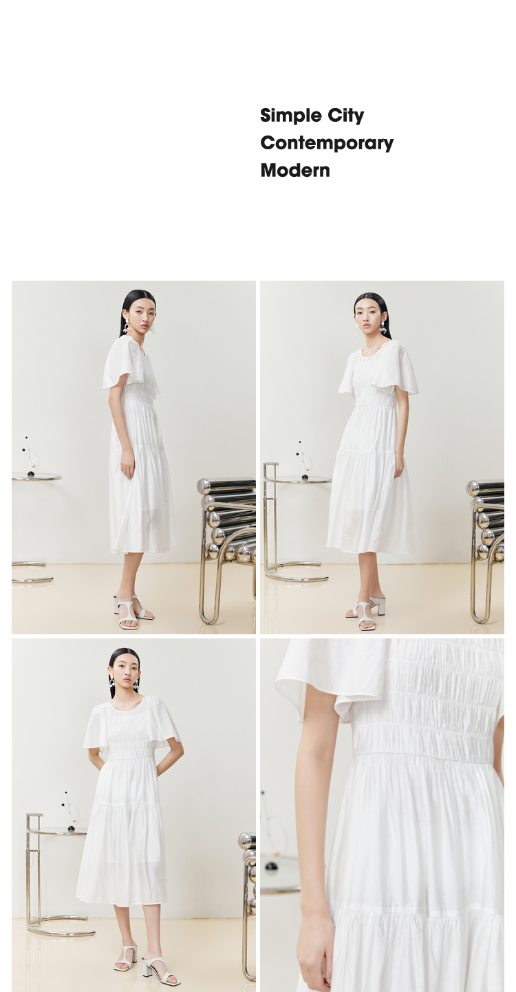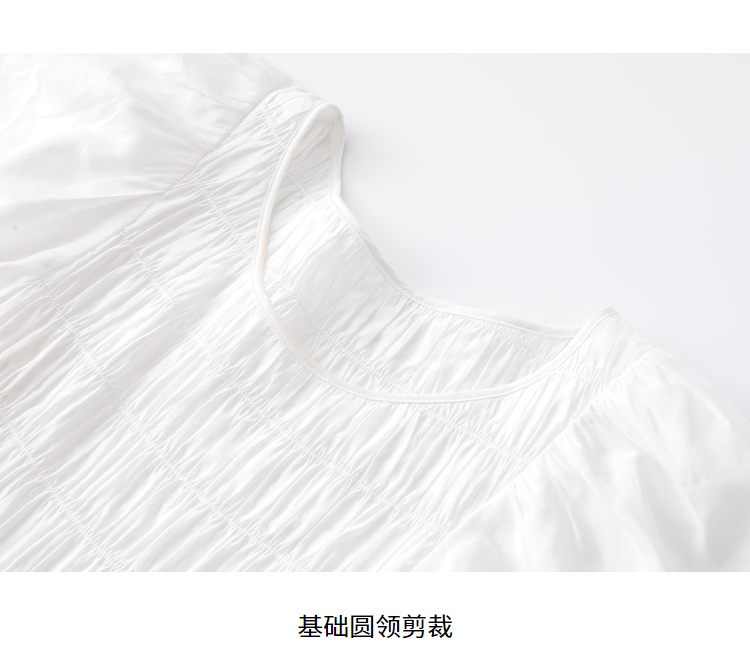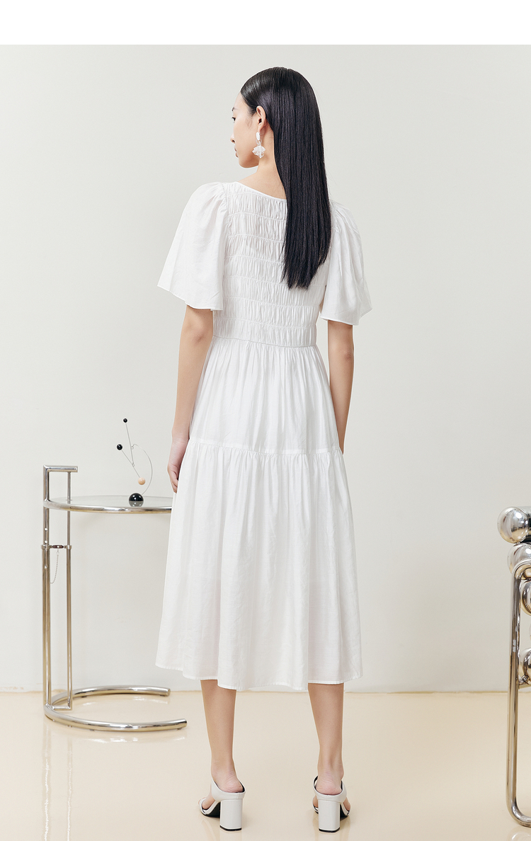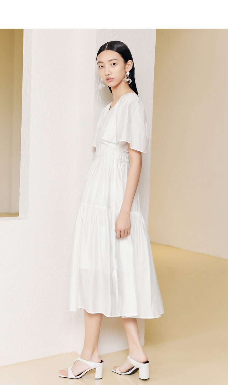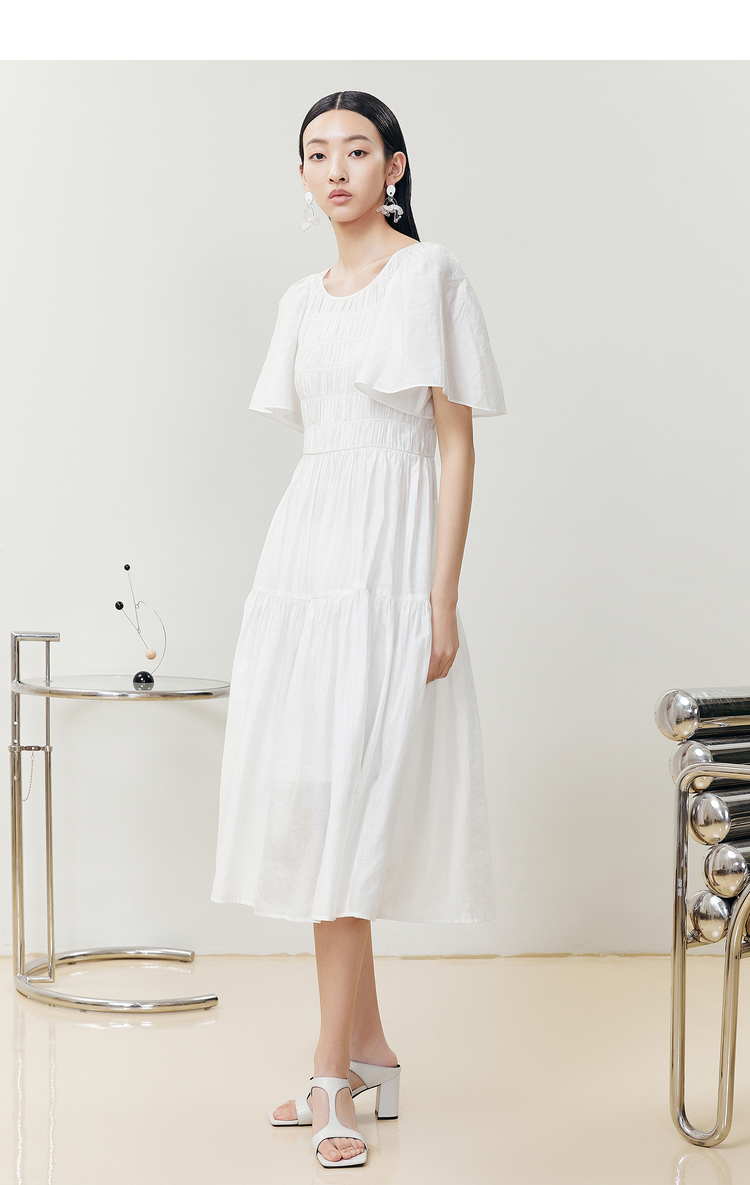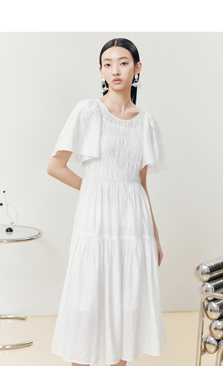 NEELLY纳俪商场同款气质白色连衣裙女松紧褶皱设计显瘦收腰A字裙
