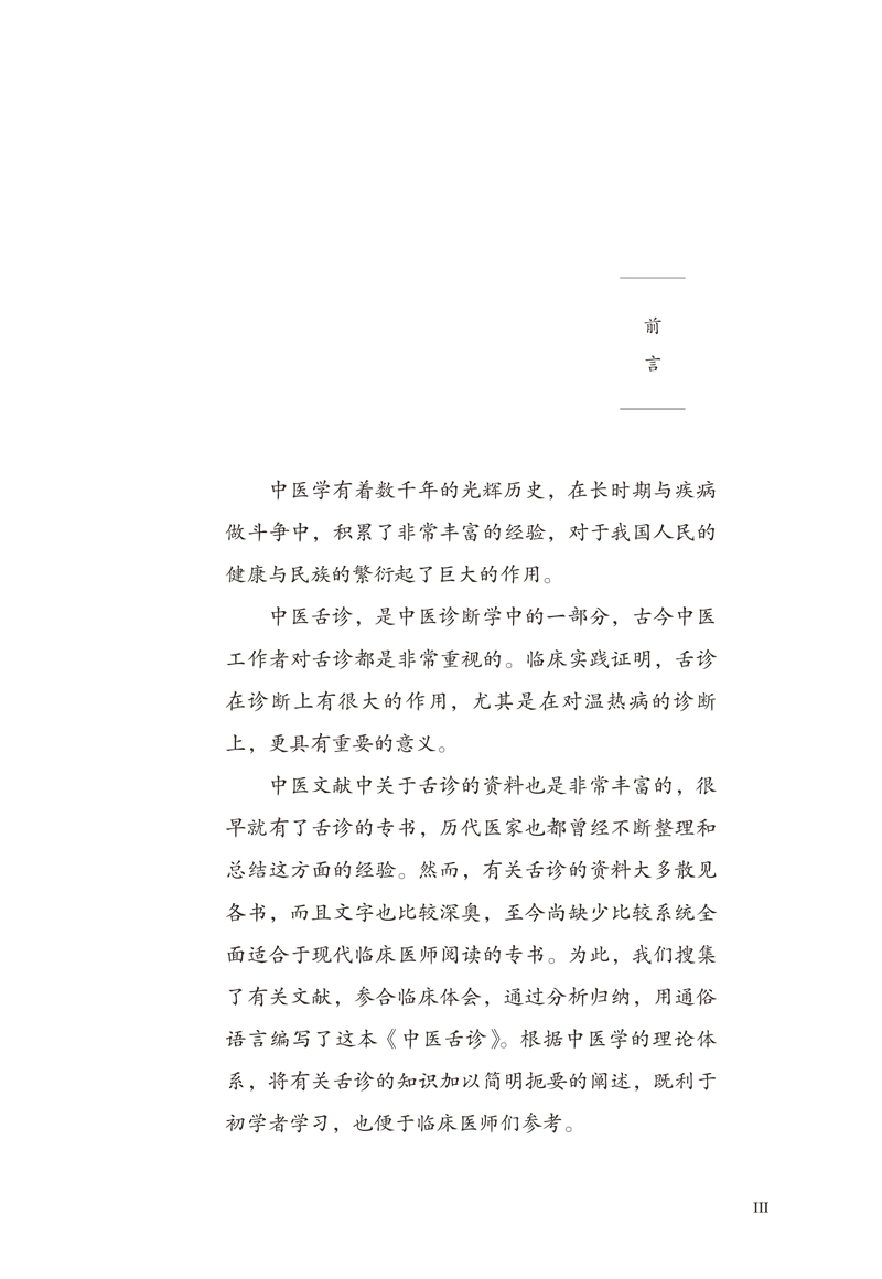 中医文献中关于舌诊的资料也是非常丰富的,很早就有了舌诊的专书,历代医家也都曾经不断整理和总结这方面的经验。然而,有关舌诊的资料大多散见各书,而且文字也比较深奥,至今尚少比较系统全面适合于现代临床医师阅读的专书。为此,我们搜集了有关文献,参合临床体会,通过分析归纳,用通俗语言编写了这本《中医舌诊》。根据祖国医学的理论体系,将有关舌诊的知识加以简明扼要的阐述,既利于初学者学习,也便于临床医师们参考。