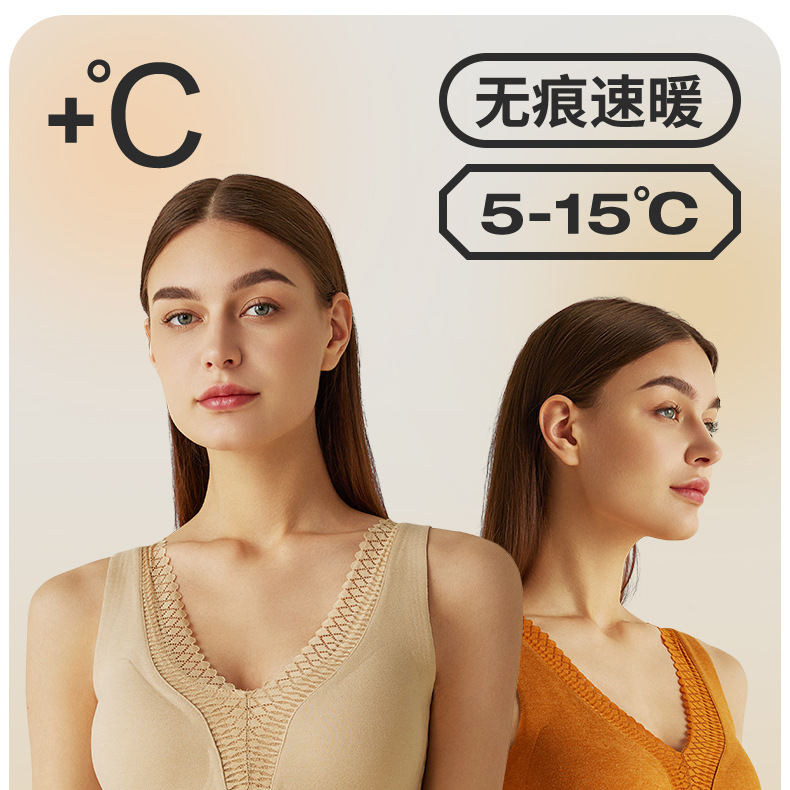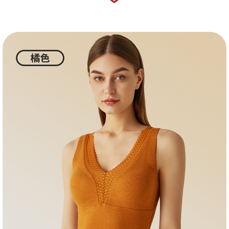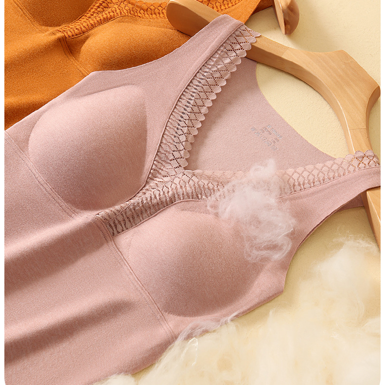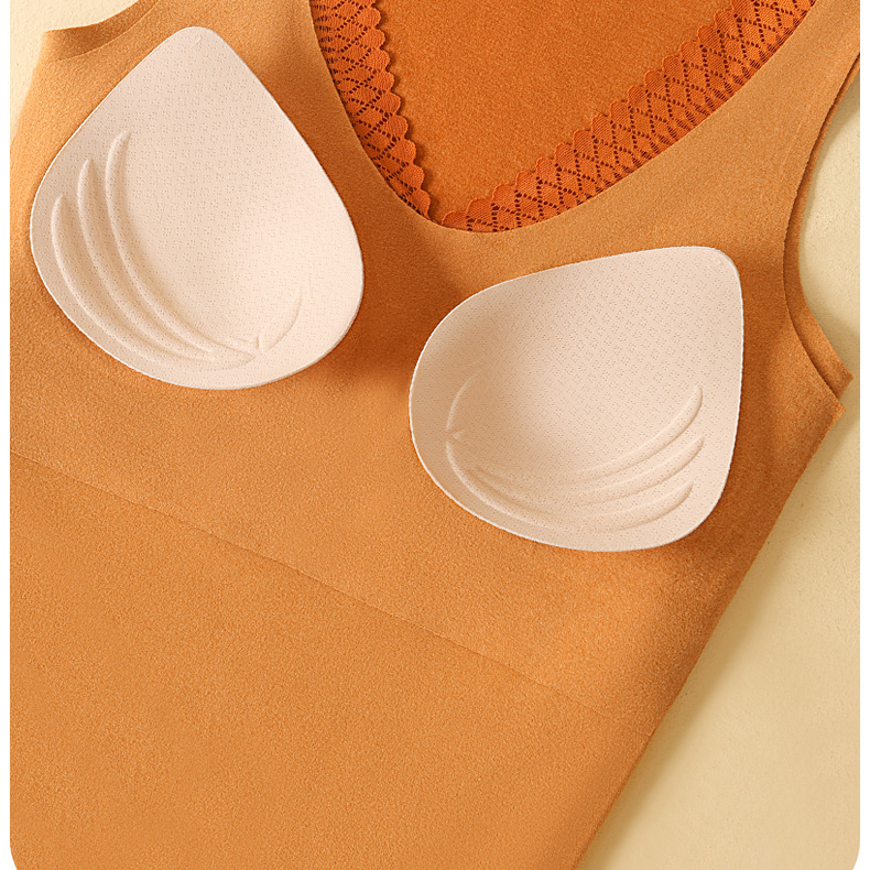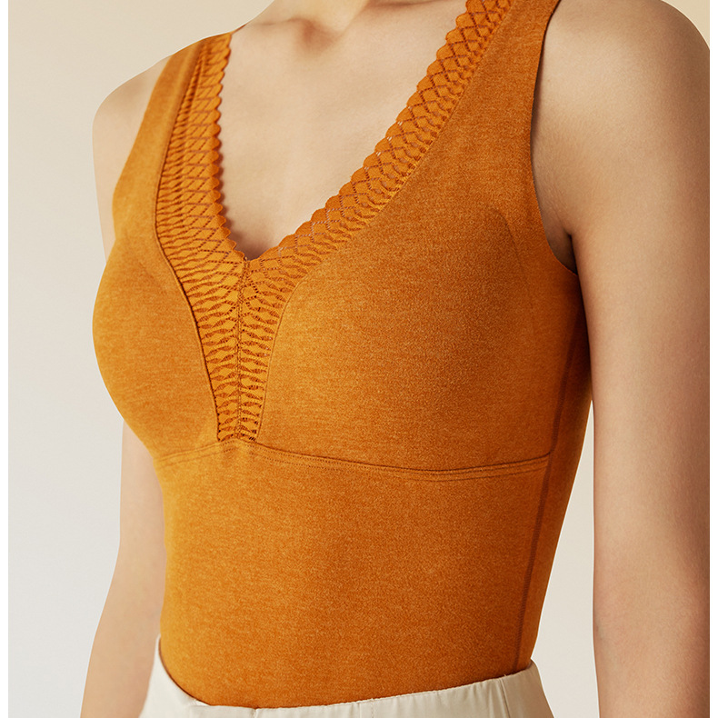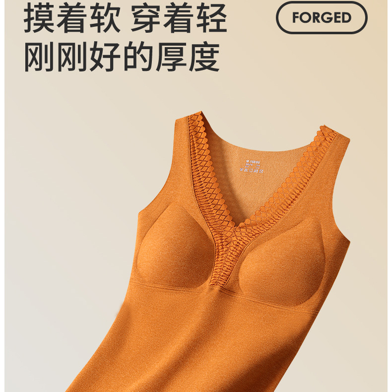 秋冬新款锻彩绒保暖背心带胸垫女士V领花边无痕内搭保暖