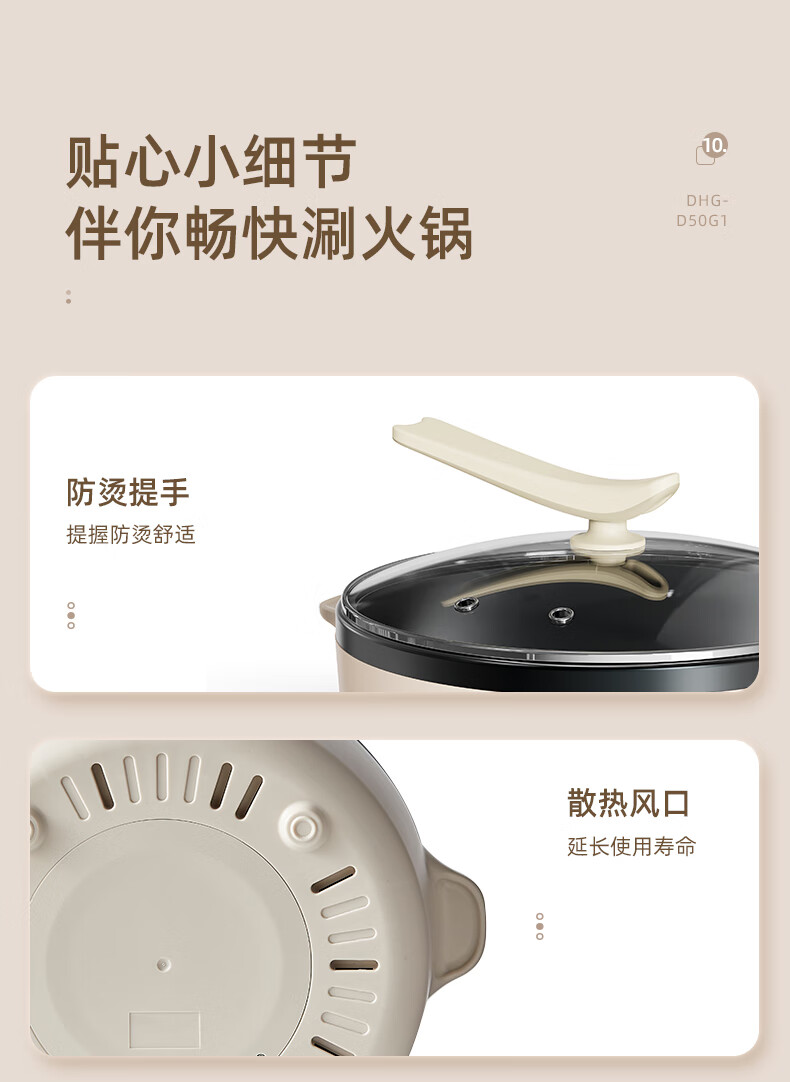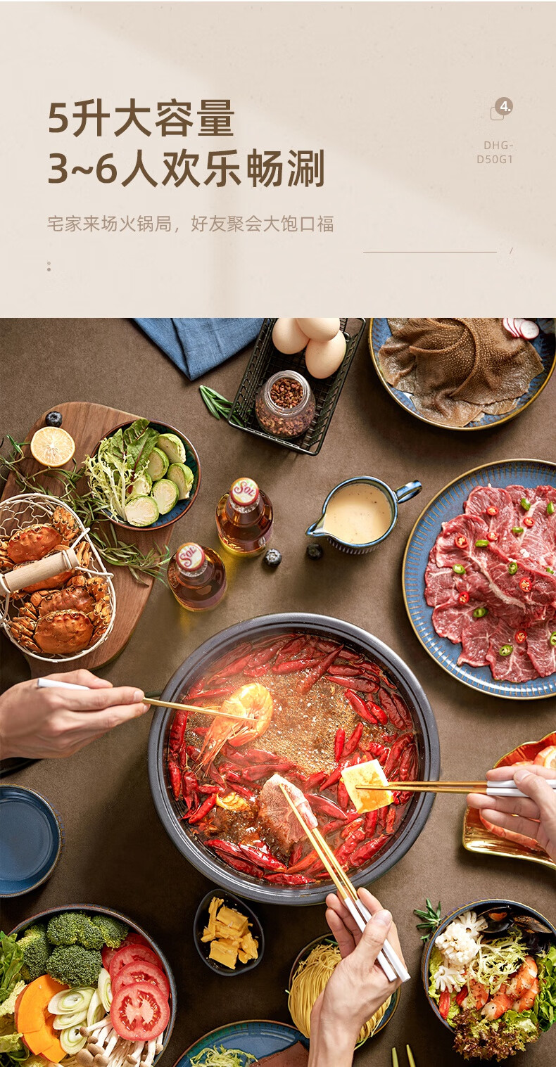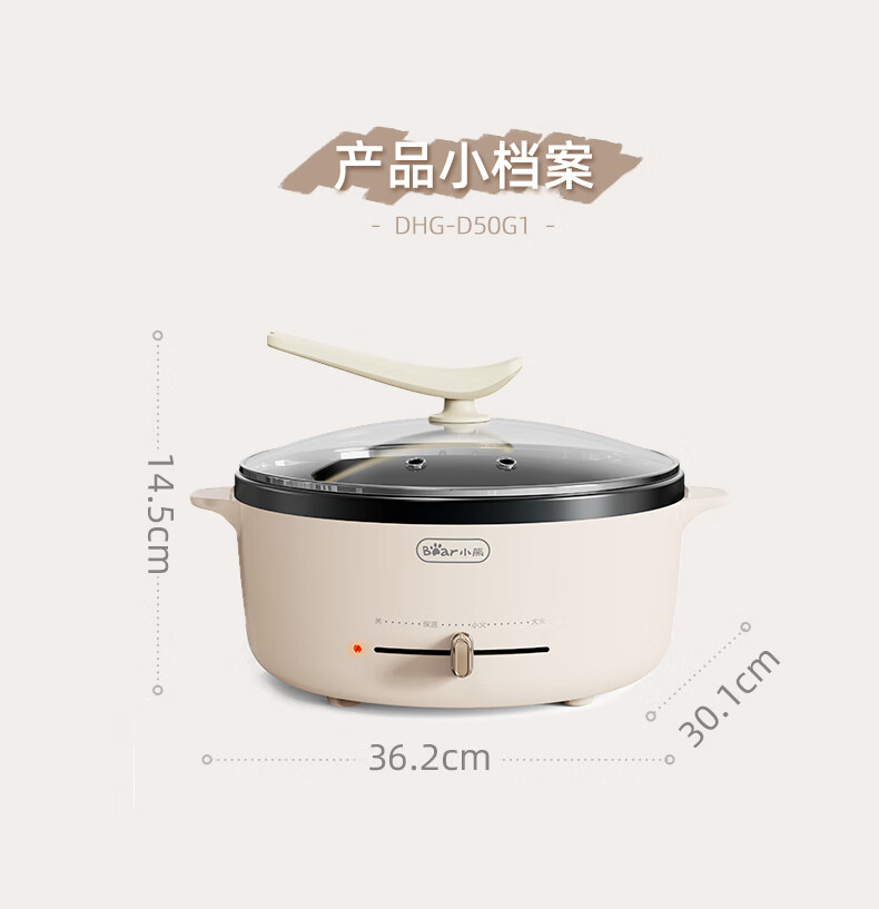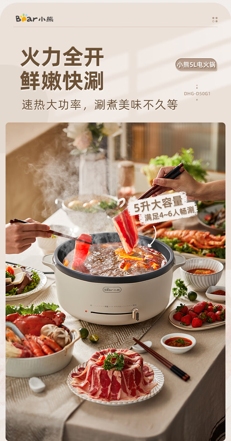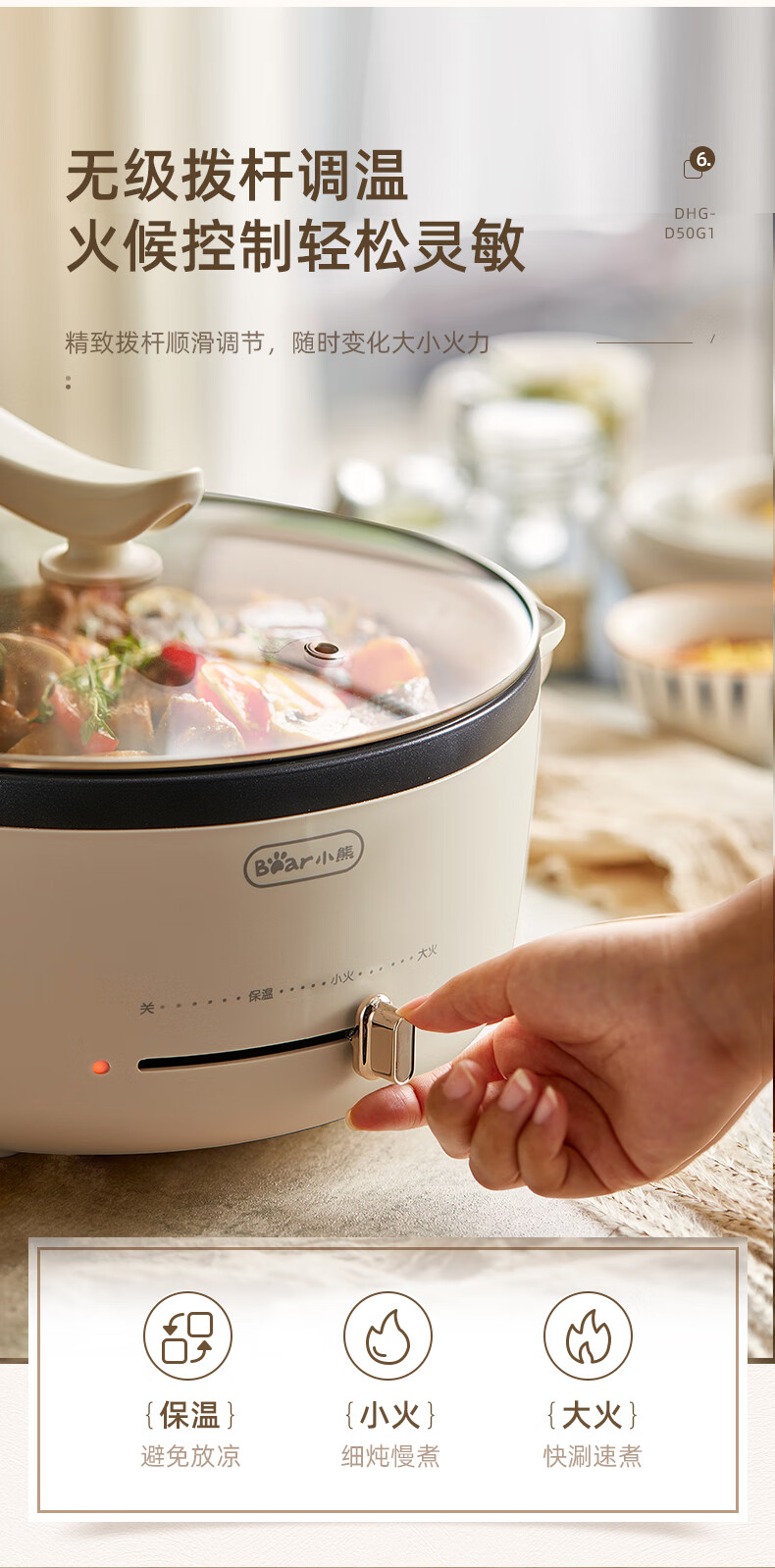 小熊(Bear) 电火锅电炒锅涮锅家用电煮锅多功能焖锅煎锅 大容量大功率电热锅【ZMD安心系列】 【5升拔杆调温】DHG-D50G1