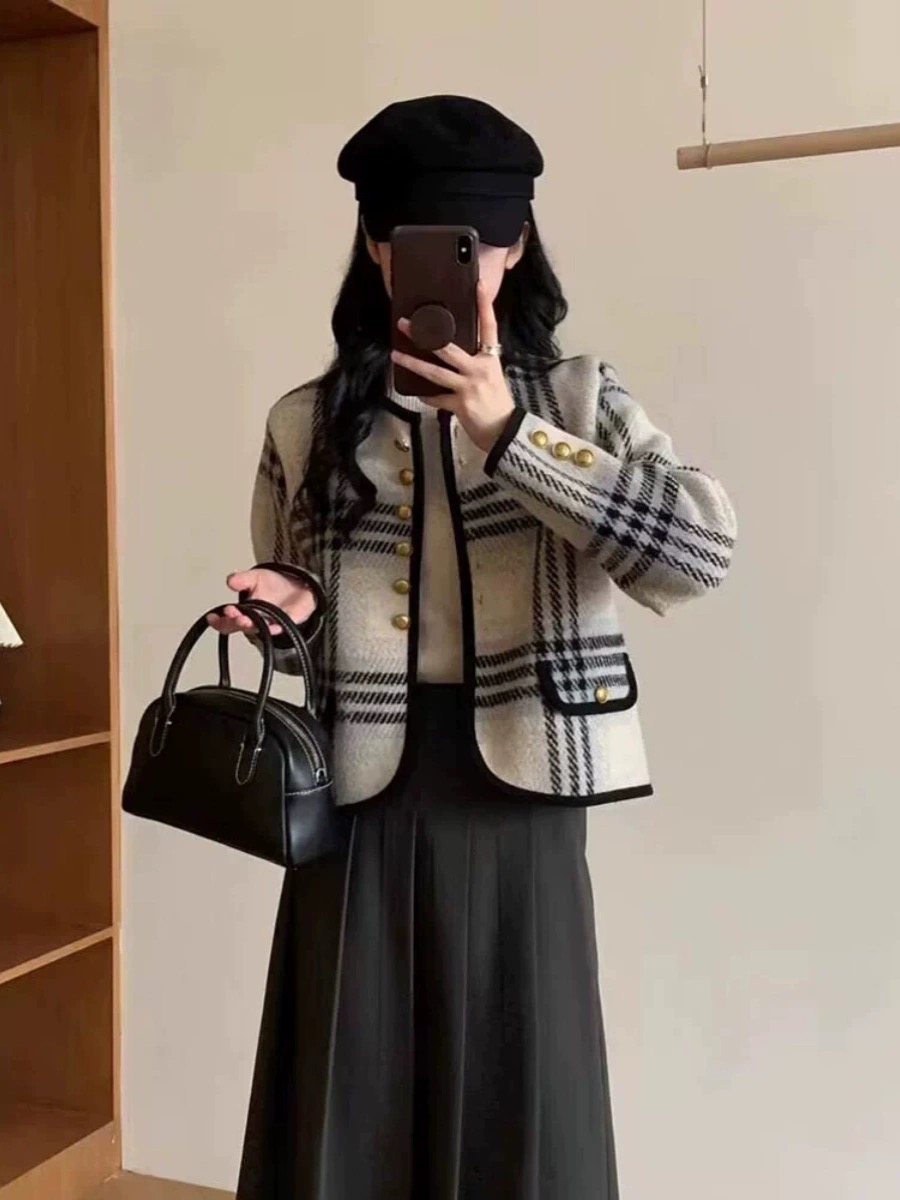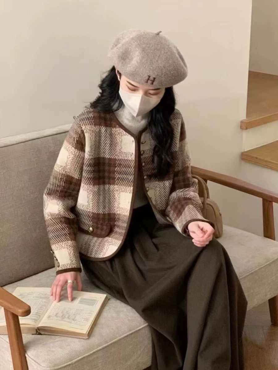 9620 # 红杏 均码 小香风格子毛呢外套女秋冬 新款复古撞色洋气小个子上衣开衫