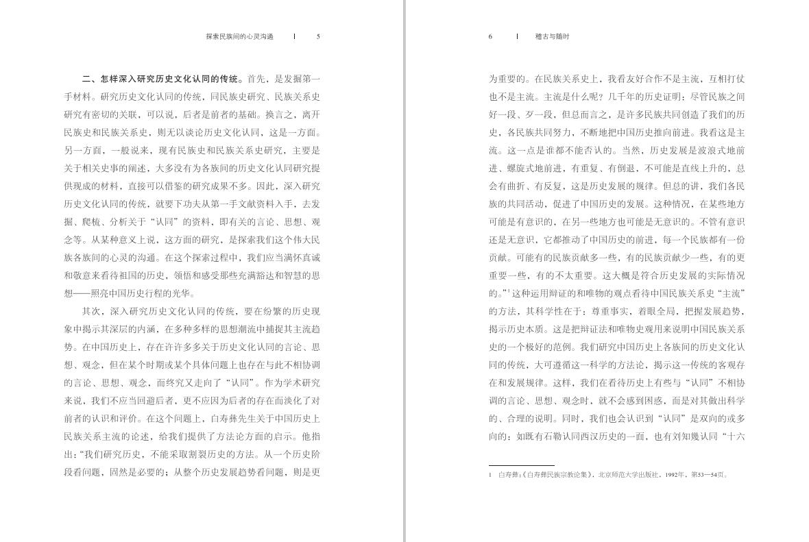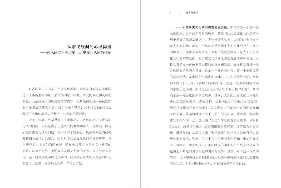 本书内容多为瞿林东先生20世纪90年代以来撰写的评论、论文及短论、随笔等,大致分为五编:第一编民族与文化。主要内容为阐述中国历史上历史文化认同的传统,以及阐发这一传统的理论价值和现实意义;阐述中华民族优秀传统文化是中华民族共有的精神家园等,其要旨则在为推进铸牢中华民族共同体意识而提出多方面的历史与史学依据。第二编历史评论。主要内容为中国古代历史理论的基本范畴、中国古代史学家思想的特点、司马迁和唐太宗等留给后人的启示等。第三编史学评论。主要内容为阐述新中国70年史学的发展大势,以及中国史学上一些有代表性的史学理论著作及重要的史学理论问题,并评论当代历史著作与史学家著作的特点。第四编治学漫谈。主要内容为作者就历史研究与历史学科建设等问题,从治学角度着眼,就史学与理论、求真与经世、稽古与随时、时代与史学以及唯物史观与史学话语体系建构、世界眼光与中国特色等问题,发表个人的观点和见解。第五编序与跋。收录了一部分作者本人论著的自序、一部分为史学前辈与同仁论著所作的序,如:《史学遗产六讲》前言、《资治通鉴介绍》再版前言、《陇史新探》序、《我的史学人生》题记与后记、《瞿林东文集》总序等。