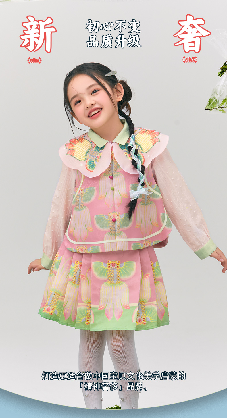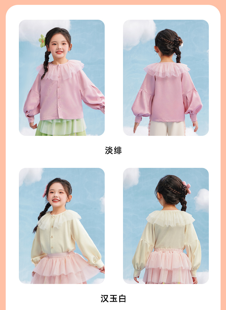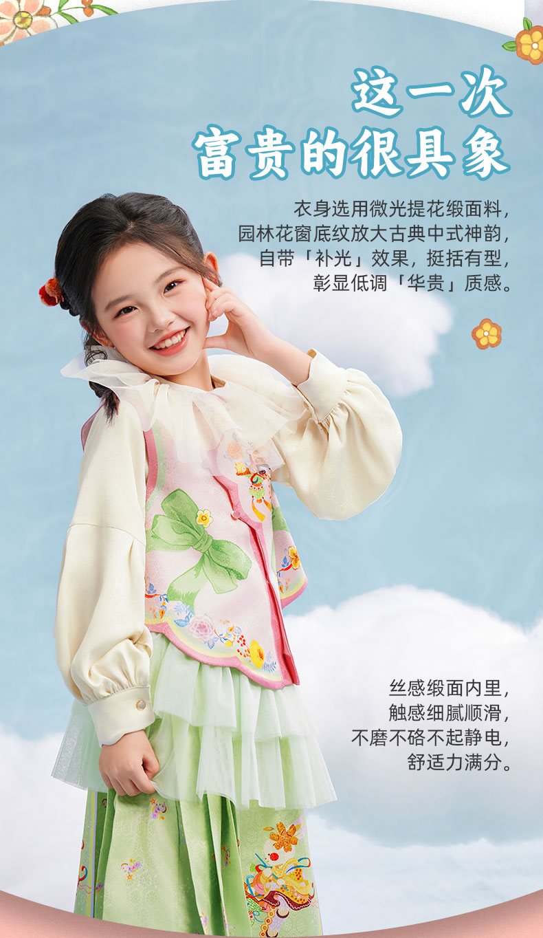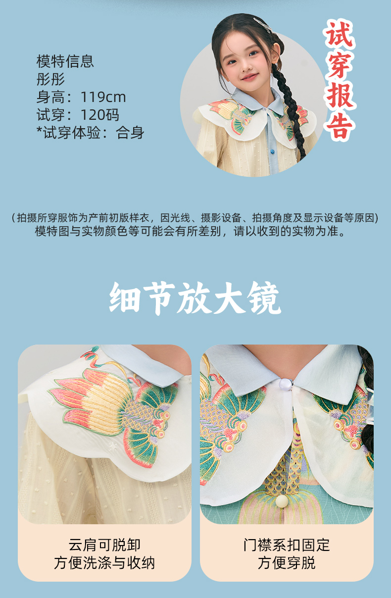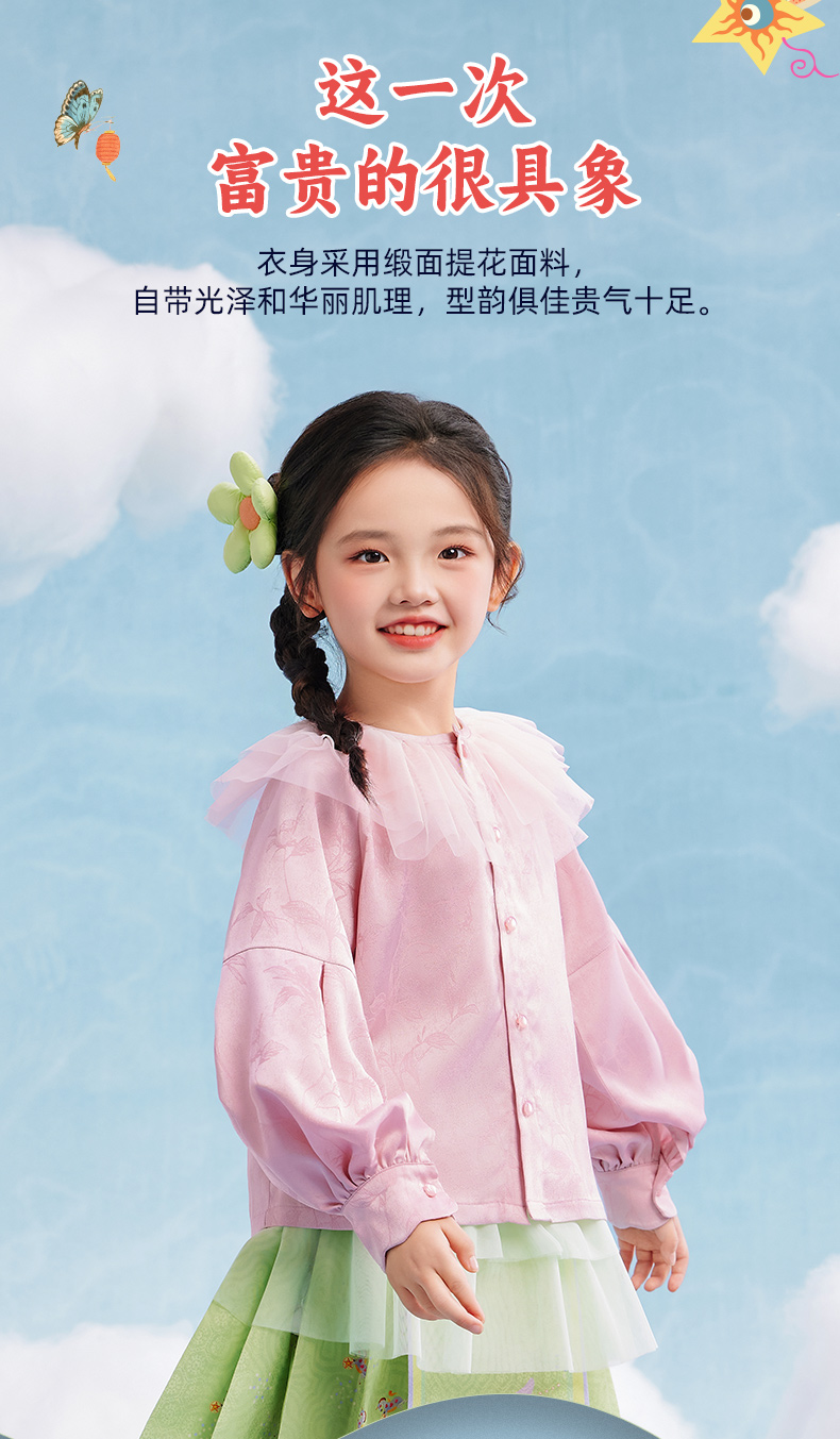【童装服饰丨年衣 儿童国风汉服系列】衣身选用优质面料,微弹属性包容度高,质感丝滑细腻触感柔软,做工走线紧密, 款式设计潇洒灵动富有古典神韵,垂坠流畅更显优雅,上身挺括有型,可满足多场景造型需求