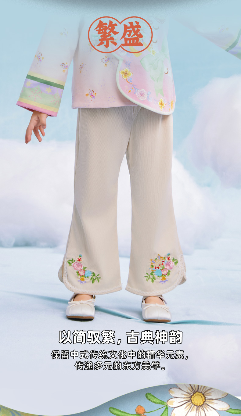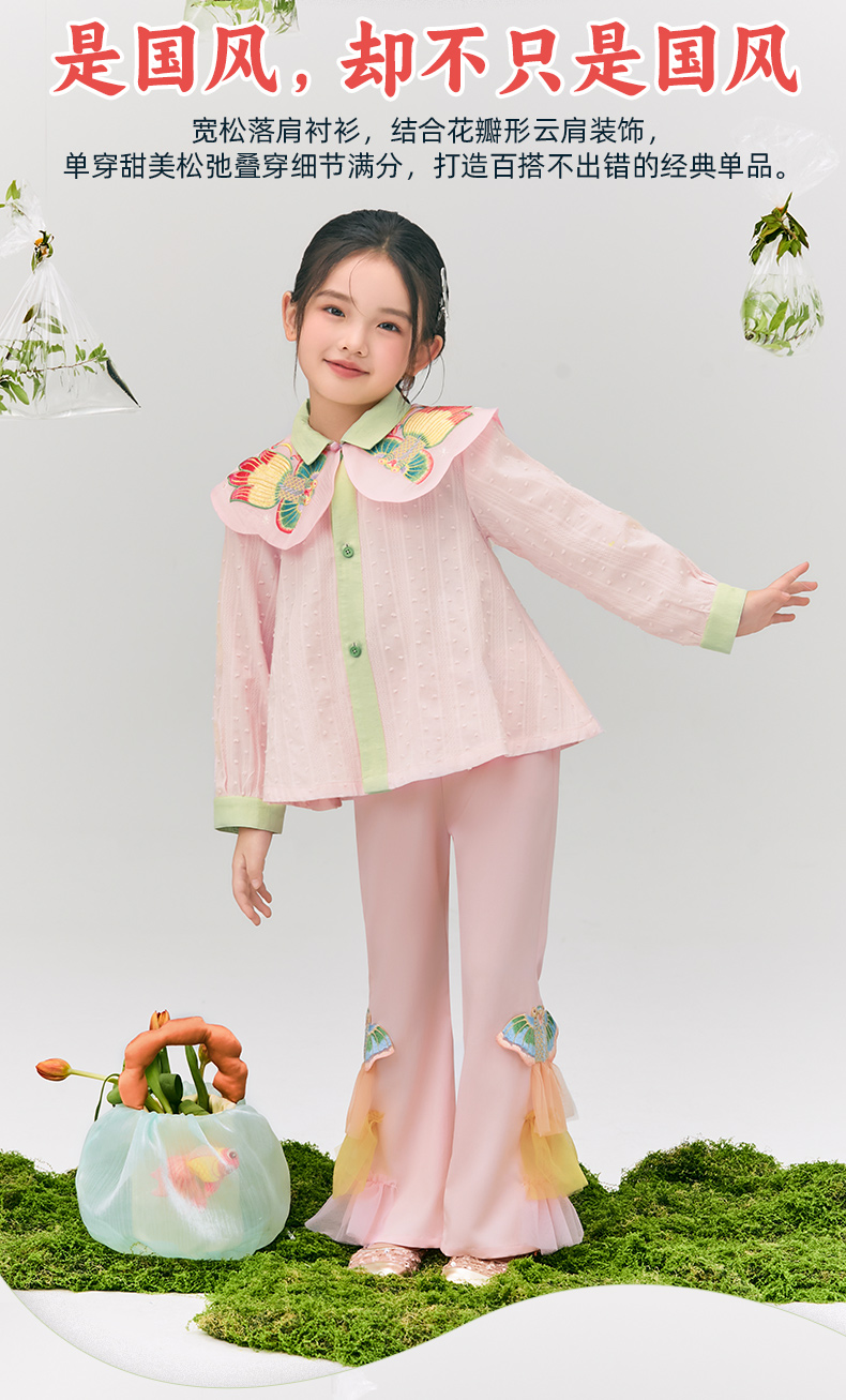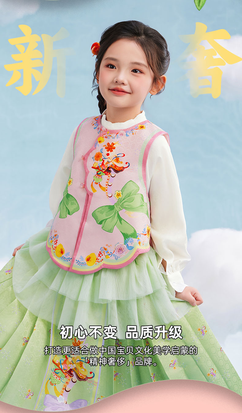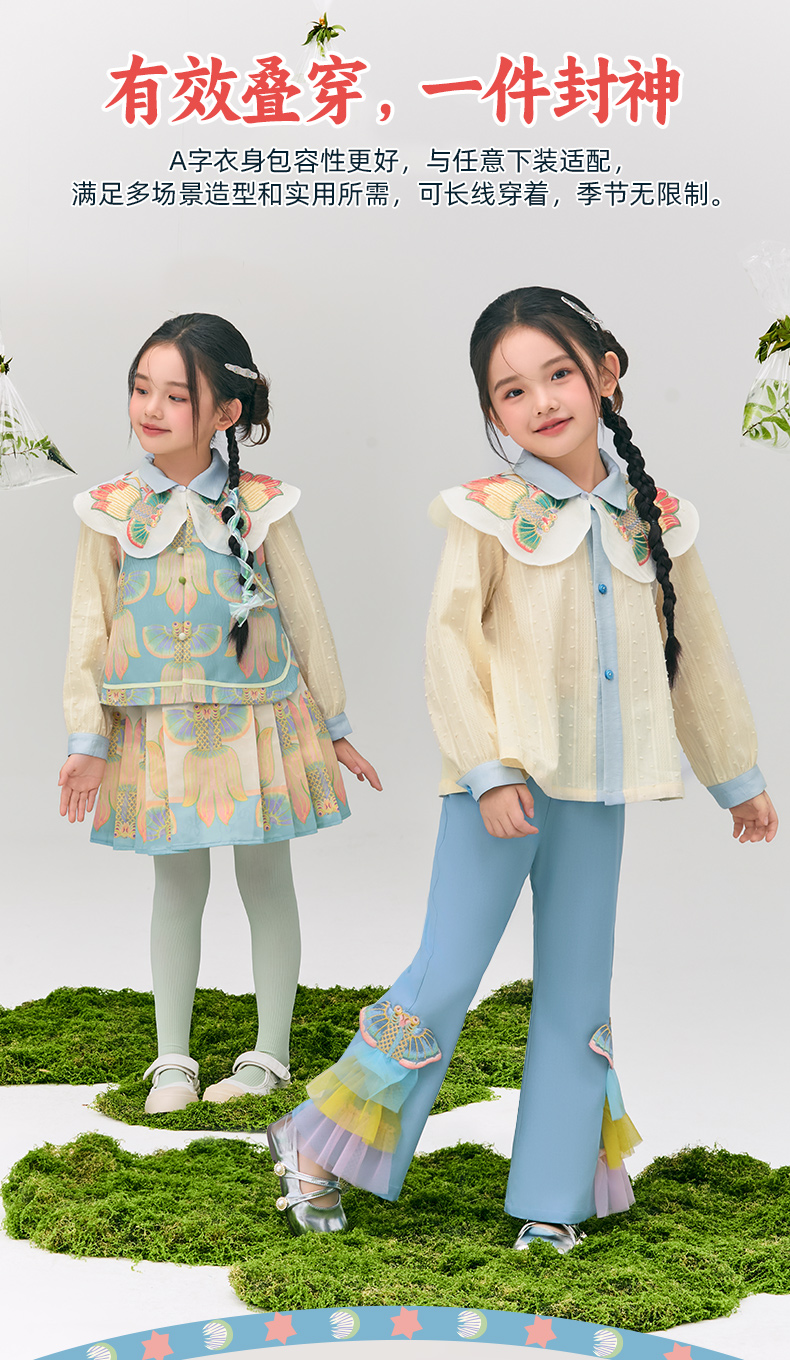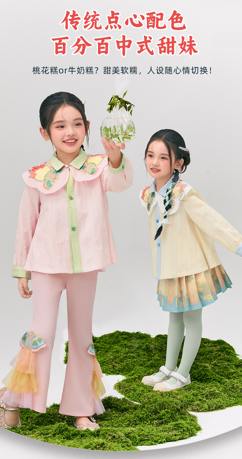 【童装服饰丨年衣 儿童国风汉服系列】衣身选用优质面料,微弹属性包容度高,质感丝滑细腻触感柔软,做工走线紧密, 款式设计潇洒灵动富有古典神韵,垂坠流畅更显优雅,上身挺括有型,可满足多场景造型需求