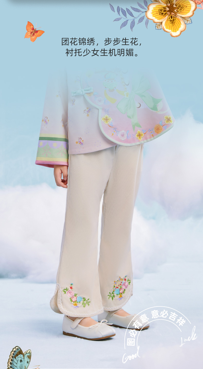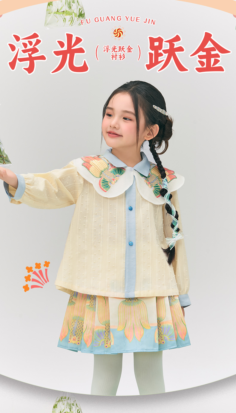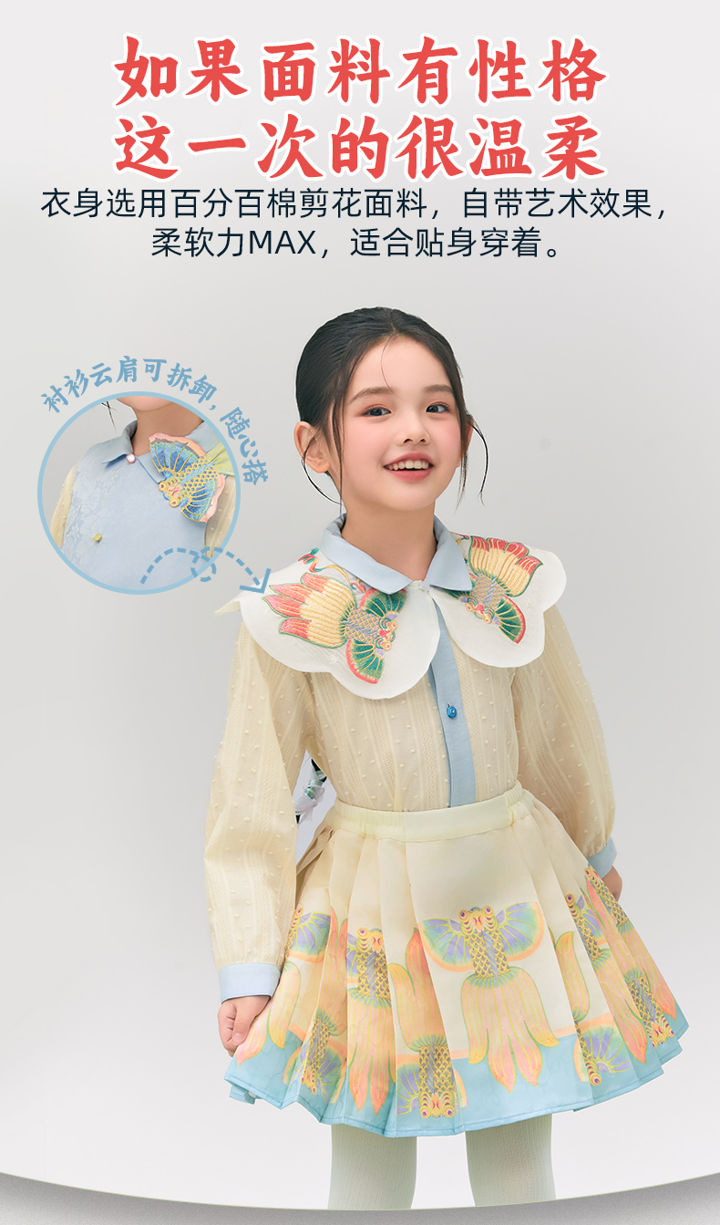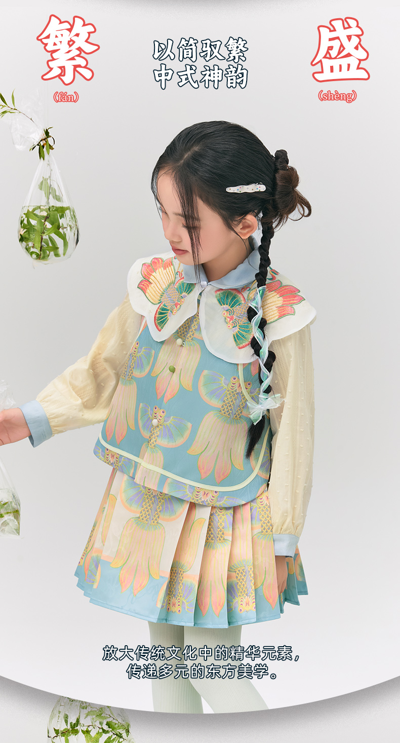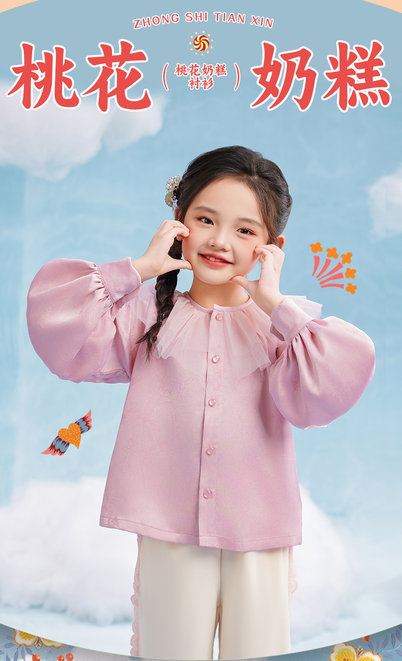 【童装服饰丨年衣 儿童国风汉服系列】衣身选用优质面料,微弹属性包容度高,质感丝滑细腻触感柔软,做工走线紧密, 款式设计潇洒灵动富有古典神韵,垂坠流畅更显优雅,上身挺括有型,可满足多场景造型需求
