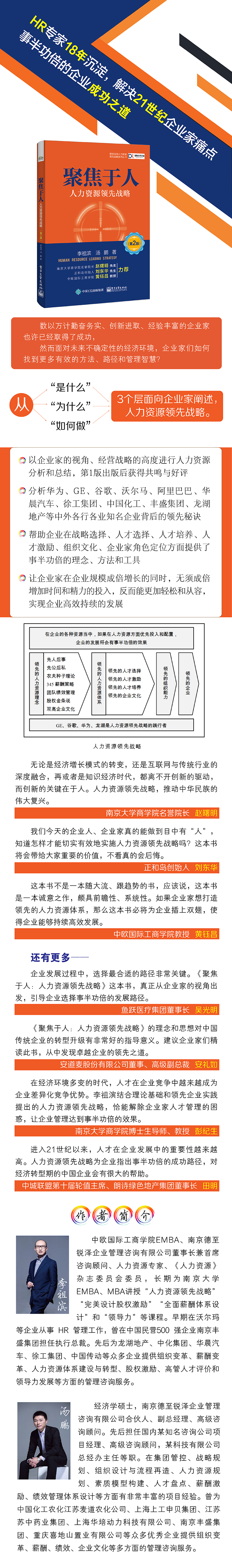 这是一本写给中国企业家的人力资源管理书籍。本书为企业家实现高效和持续发展提供了**路径——聚焦于人,践行人力资源&先战略。人力资源&先战略帮助企业在战略选择、人才选择、人才培养、人才激励、组织文化、企业家角色定位方面提供了事半功倍的理念、方法和工具,让企业家在企业规模成倍增长的同时,无须成倍增加时间和精力的投入,反而能更加轻松和从容,实现企业高效持续的发展。