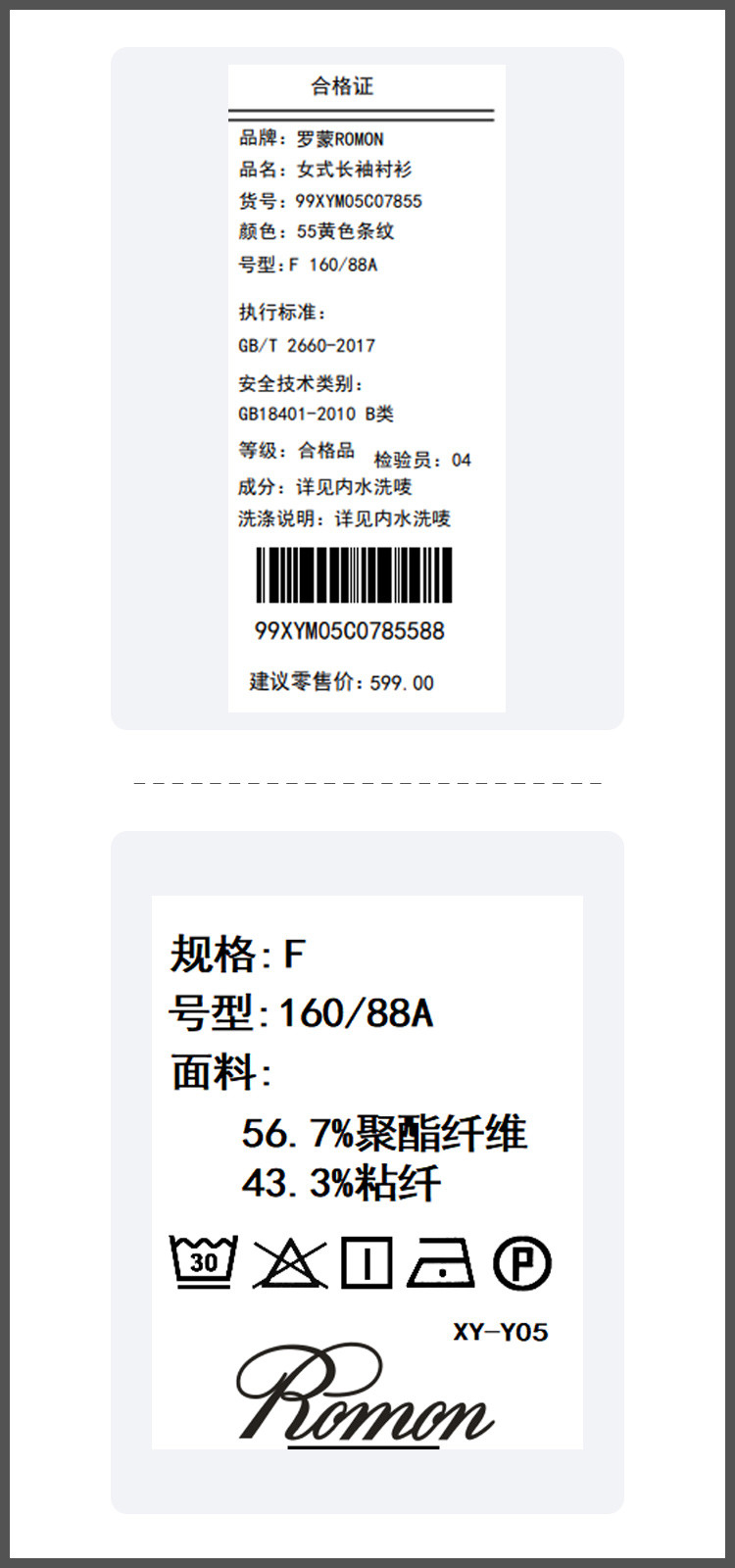 面料:56.7%聚酯纤维43.3%粘纤