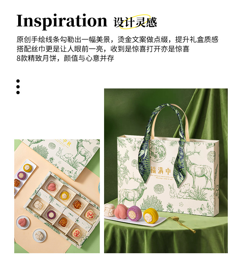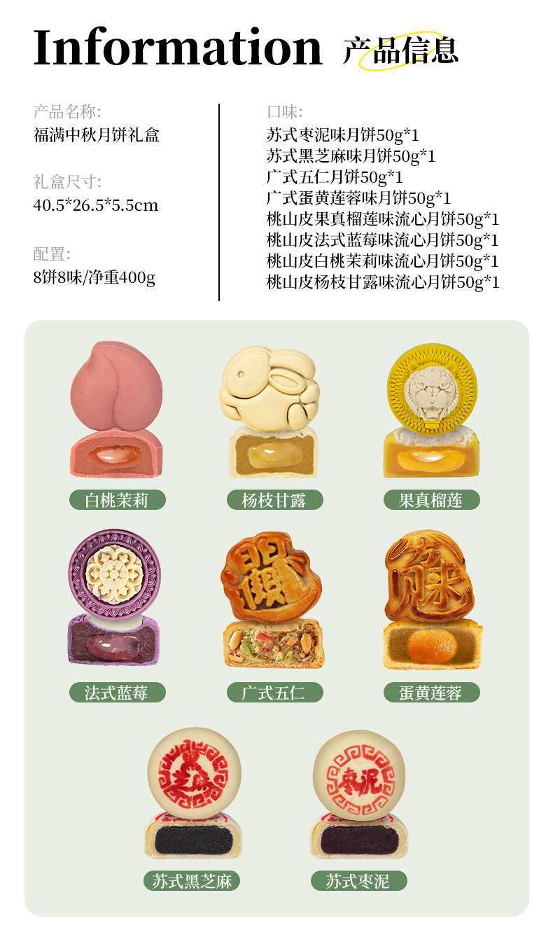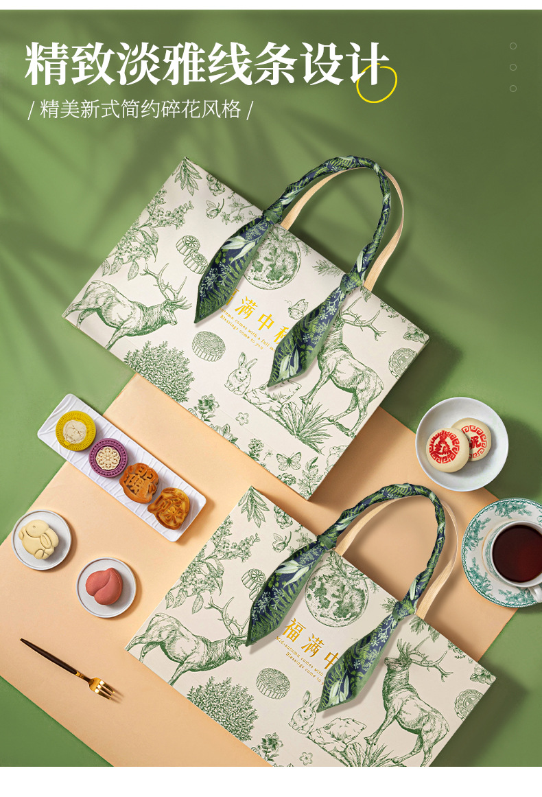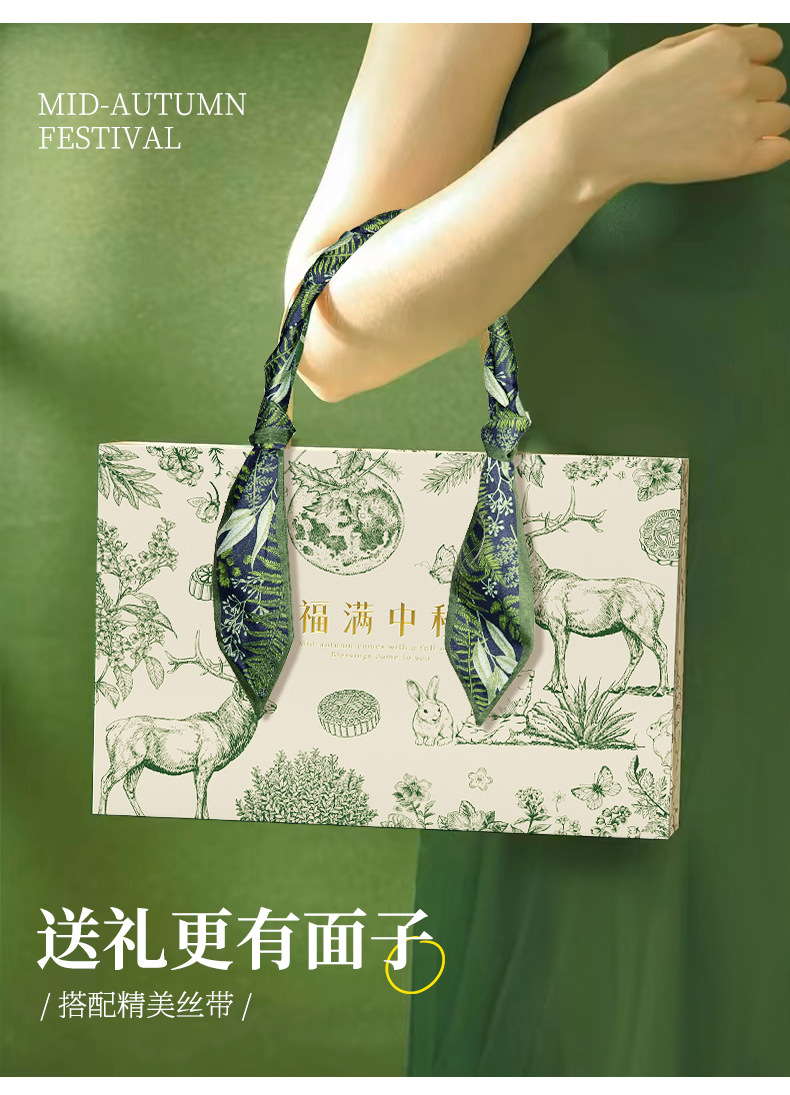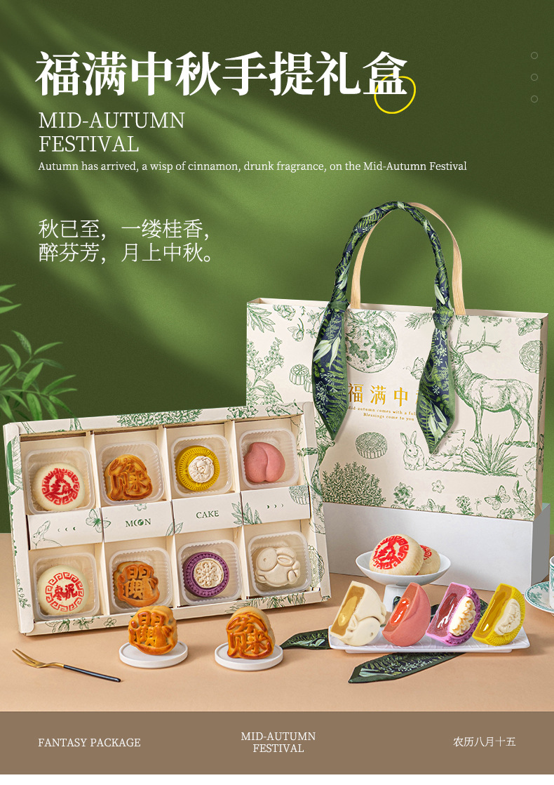 【月圆人团圆,佳节送月饼】中秋送礼,精选八款月饼,包含广式苏式、五仁冰皮、流心奶黄、蛋黄、莲蓉桃山皮口味,搭配精美丝带,福满中秋手提礼盒,精致好礼包装带。亲友团中秋团圆,幸福暖心意!