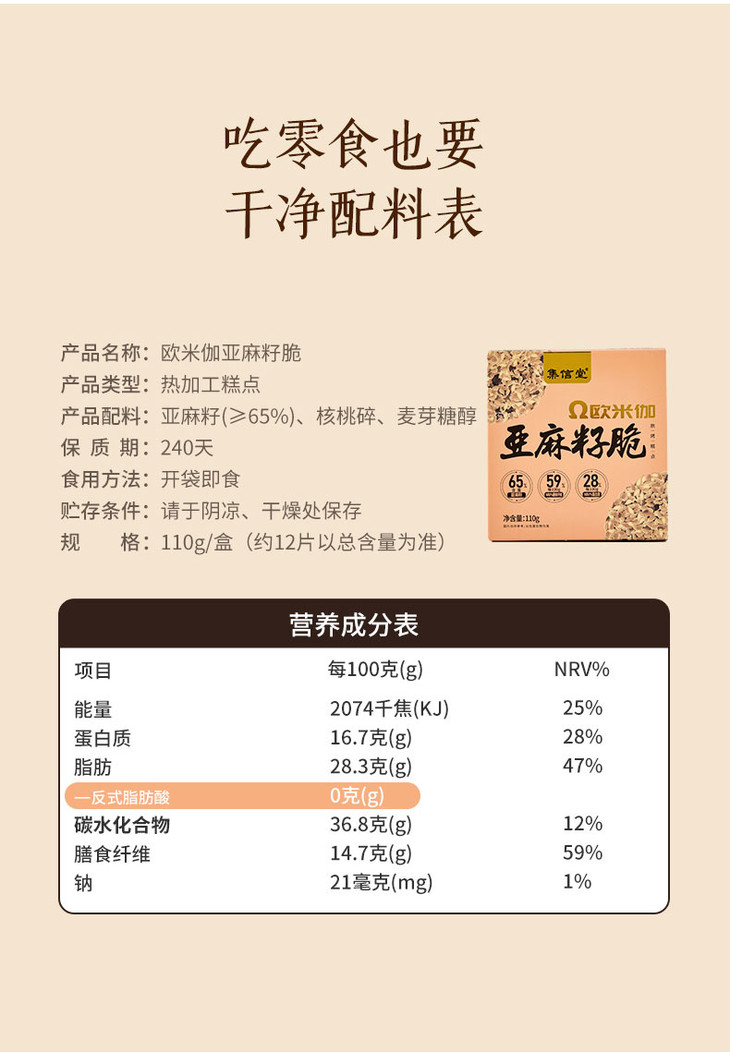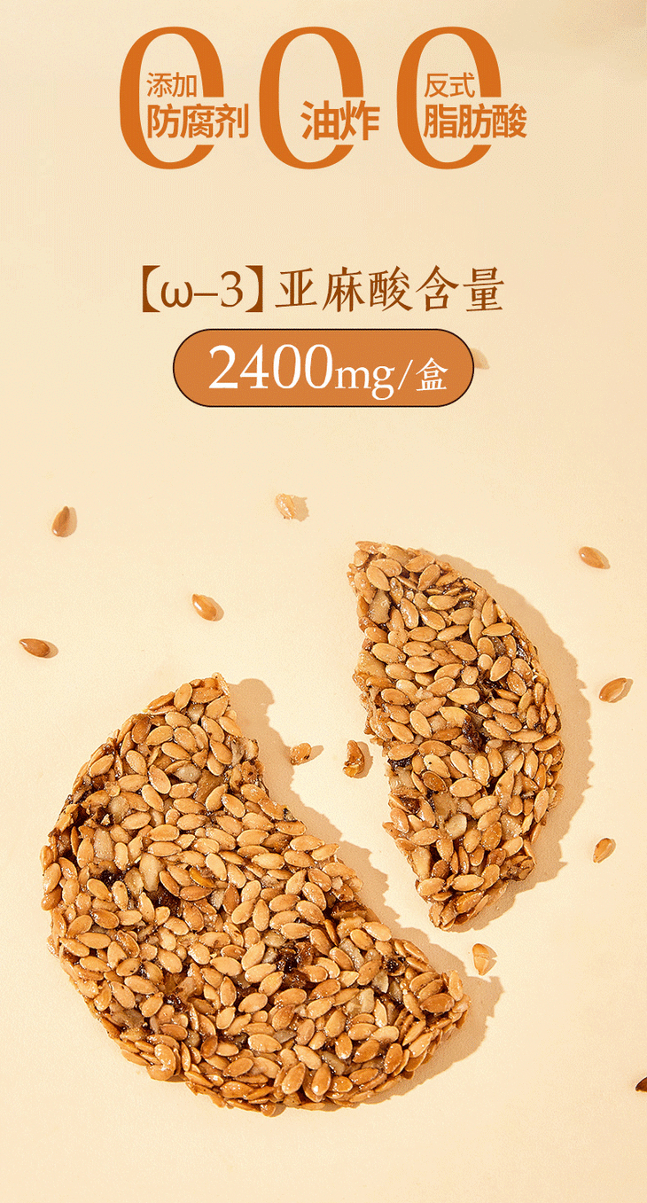 欧米伽亚麻籽脆110g/盒 添加65%亚麻籽含量 含亚麻酸(ω-3) 口感酥脆 轻甜不腻 独立袋装