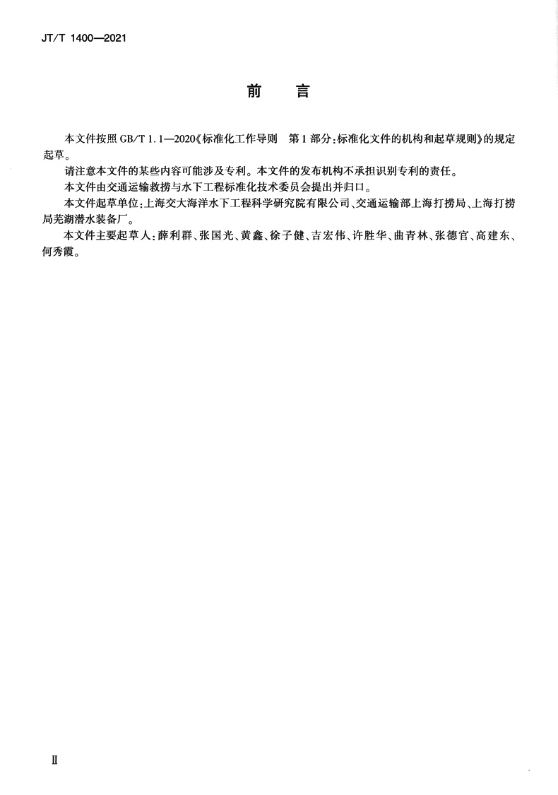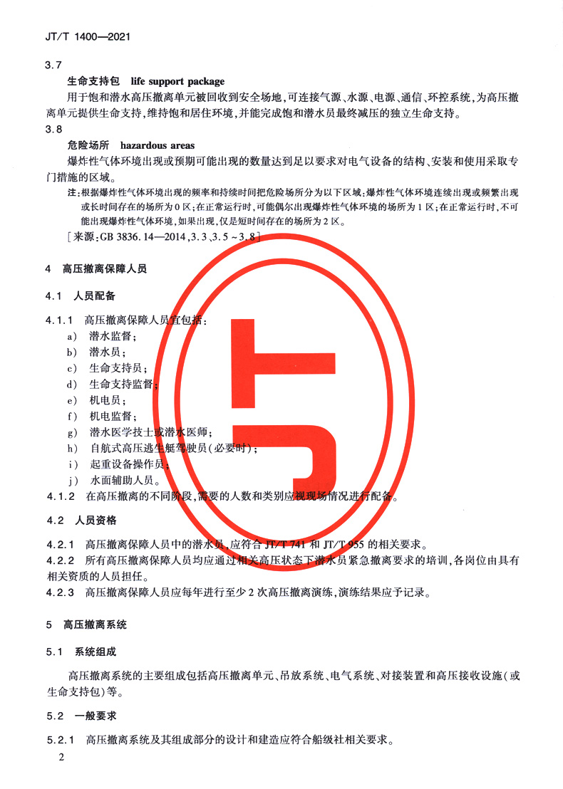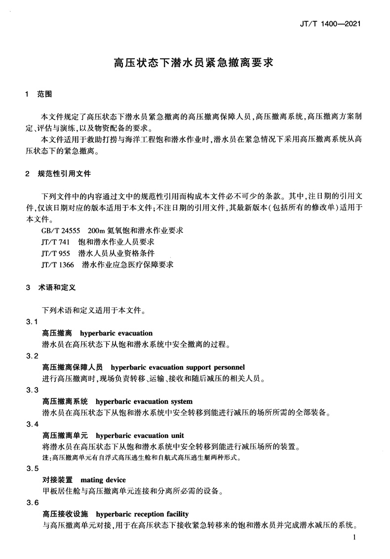 书名:高压状态下潜水员紧急撤离要求(JT/T 1400—2021)