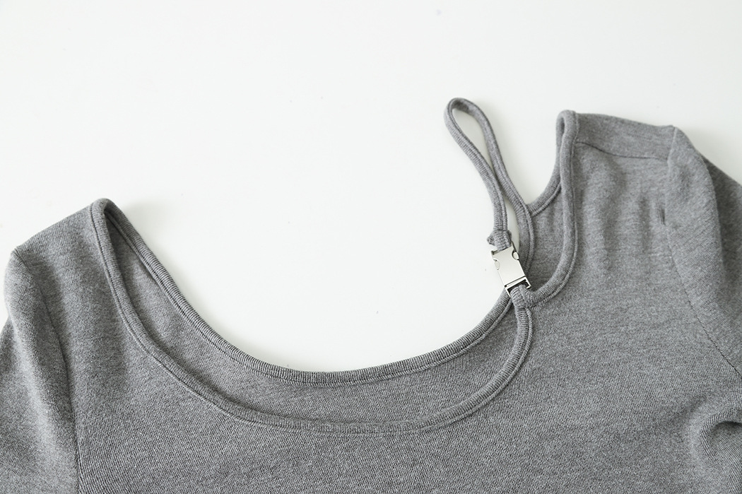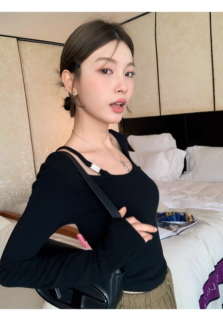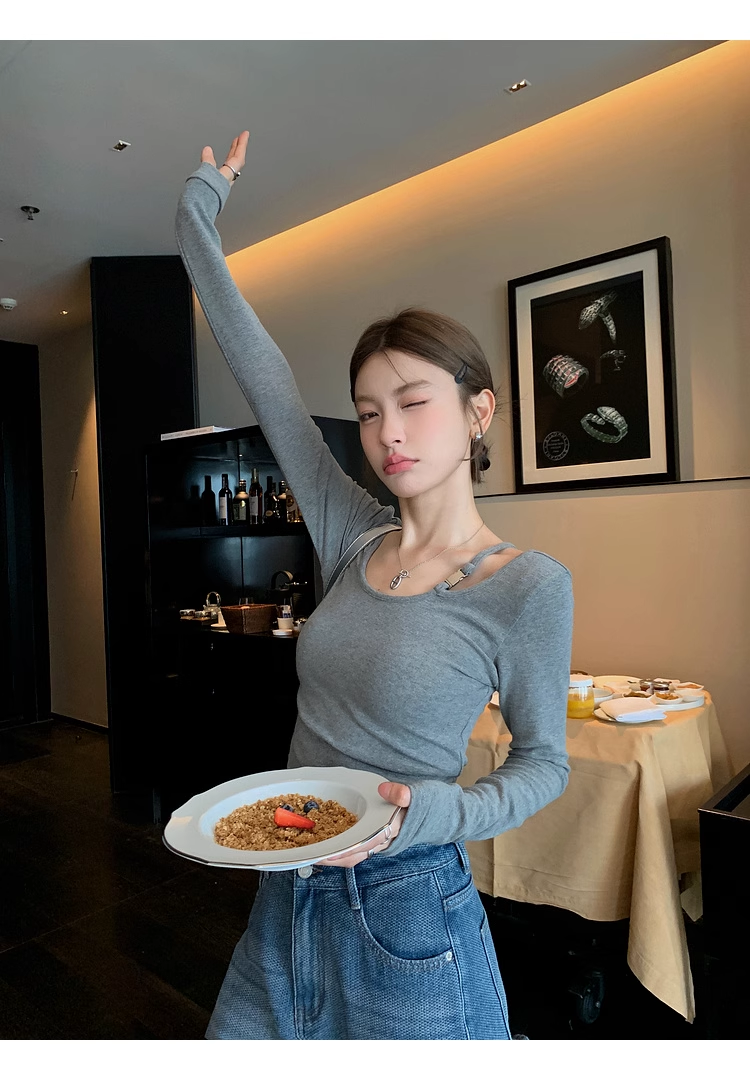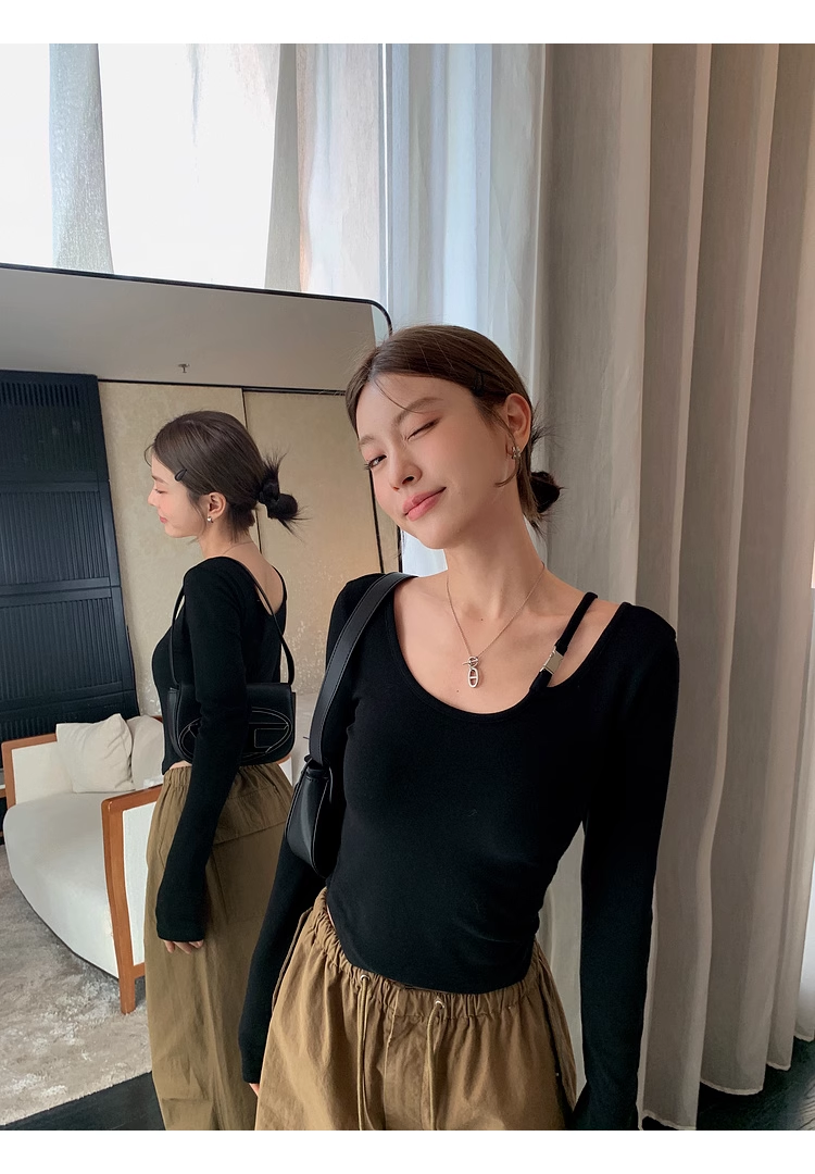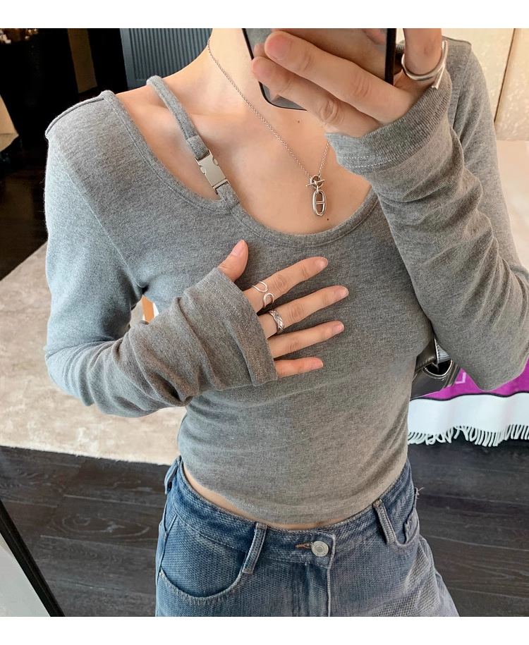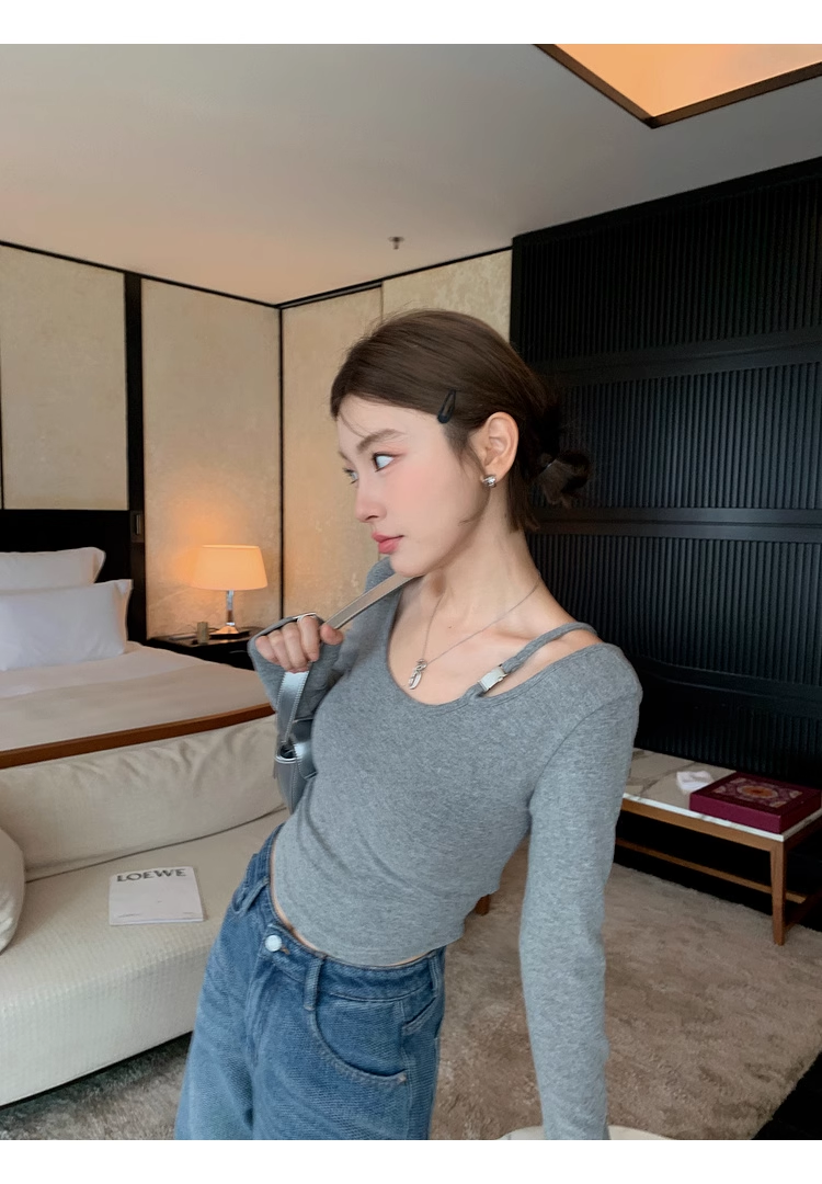 ✨高密轻柔金属扣短款T女设计感简约修身不对称长袖上衣 小众设计感露肩修身T恤打底衫2025新款