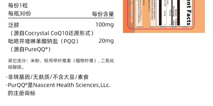 还原型超级辅酶Q10泛醇+PQQ 美国原装进口30粒NS倍能适