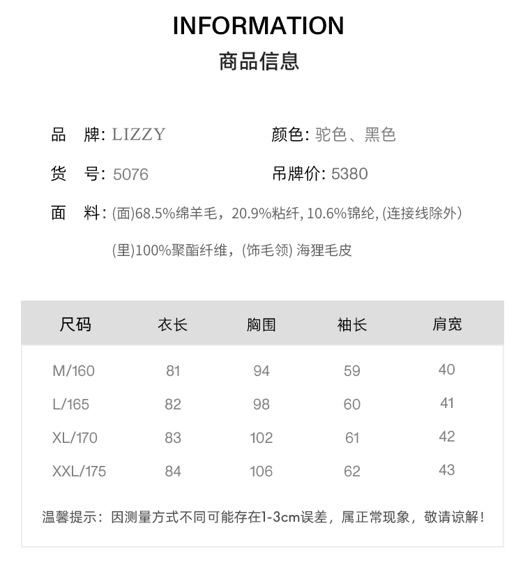 LIZZY 秋冬新款绵羊毛纯手工双面呢大衣外套可脱卸海狸毛领5076