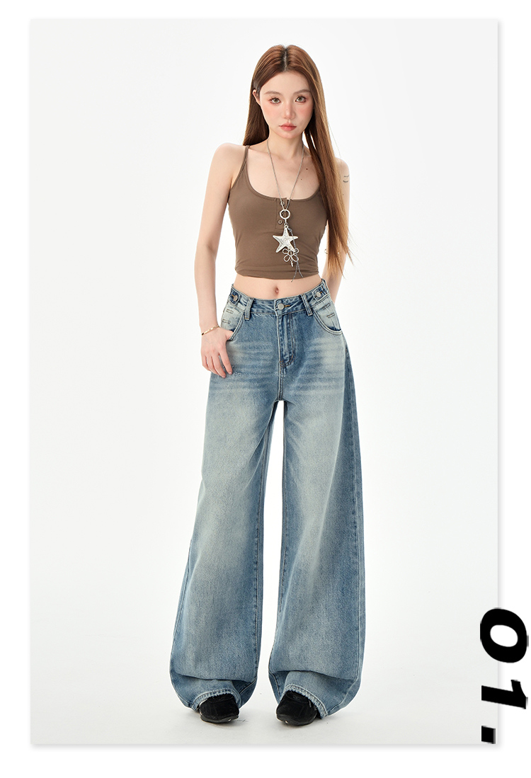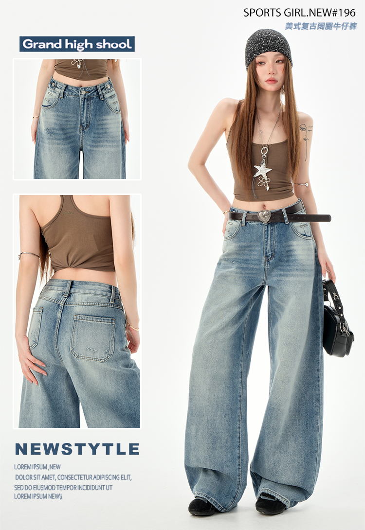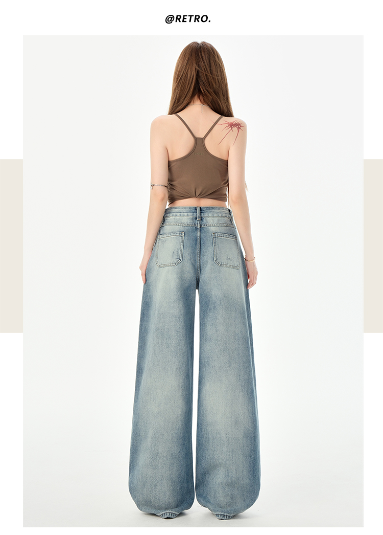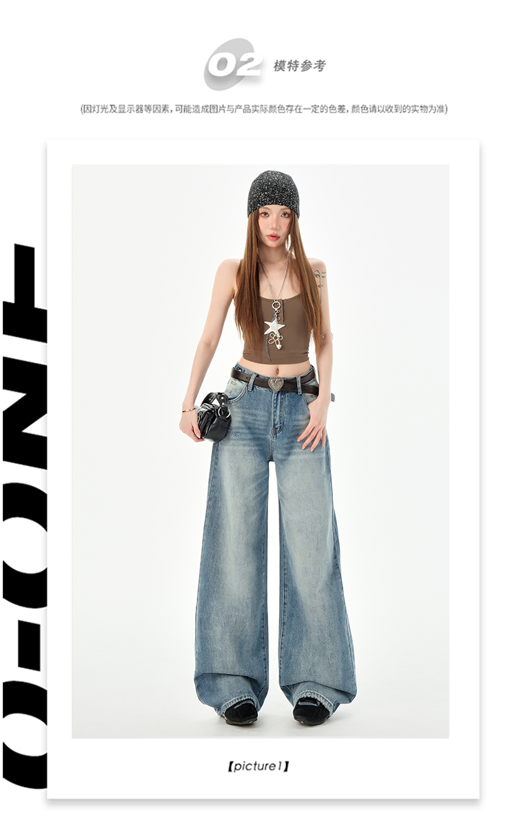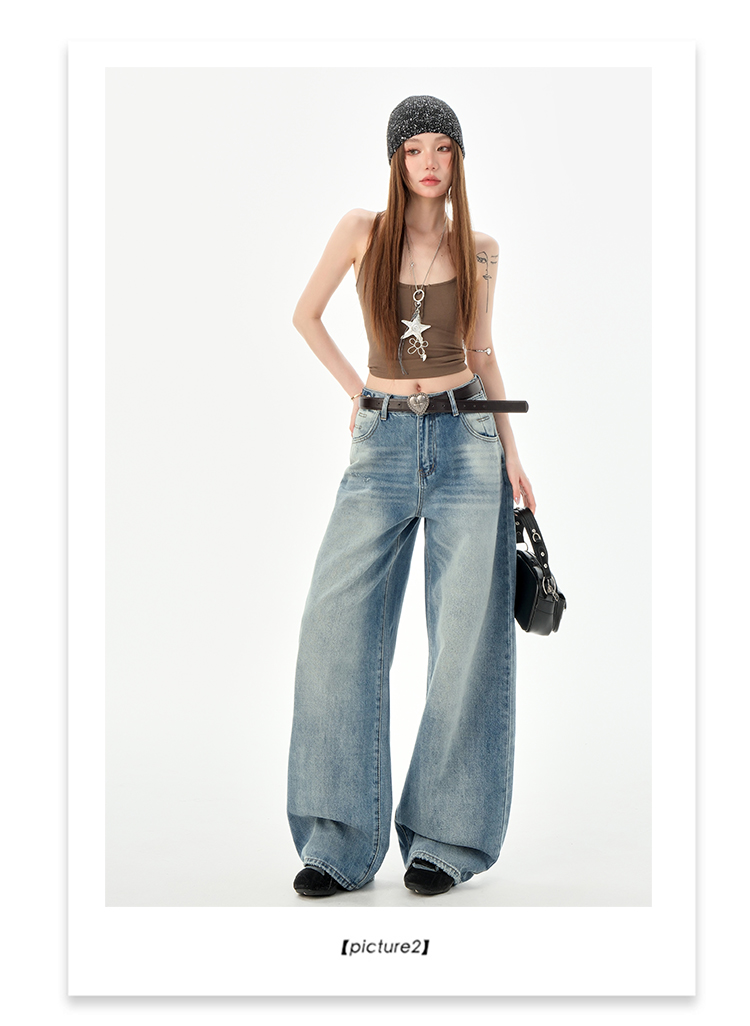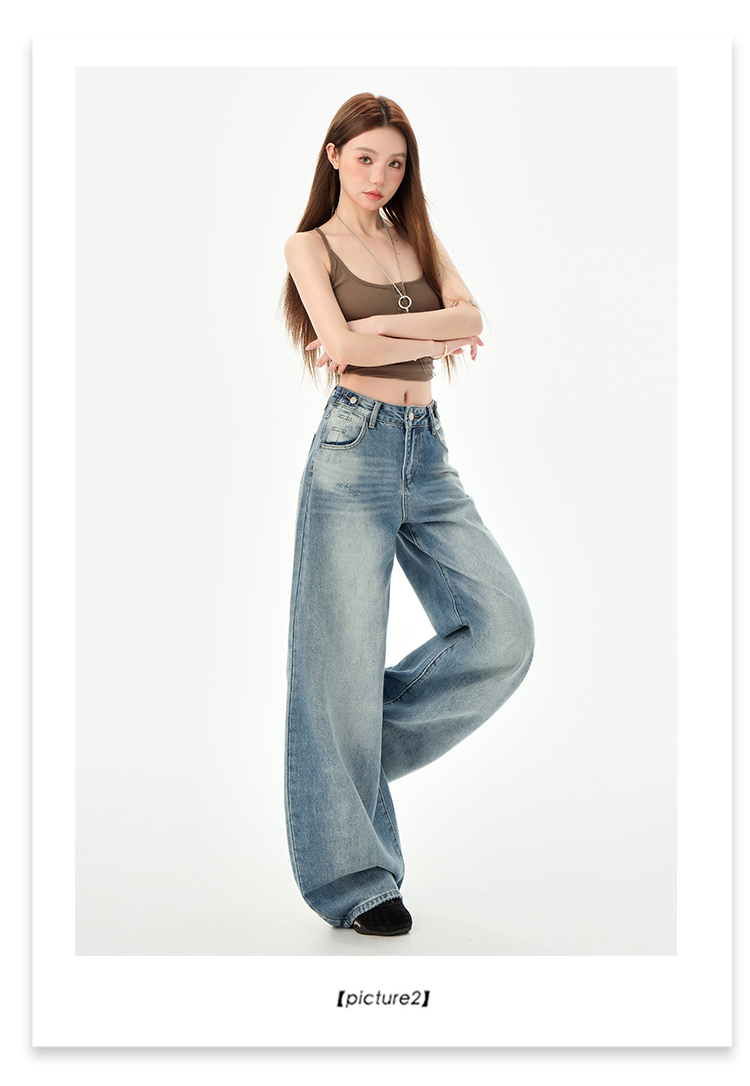 罗蒙女士高腰百搭阔腿牛仔裤女春夏浅蓝复古宽松显瘦时尚百搭直筒裤子