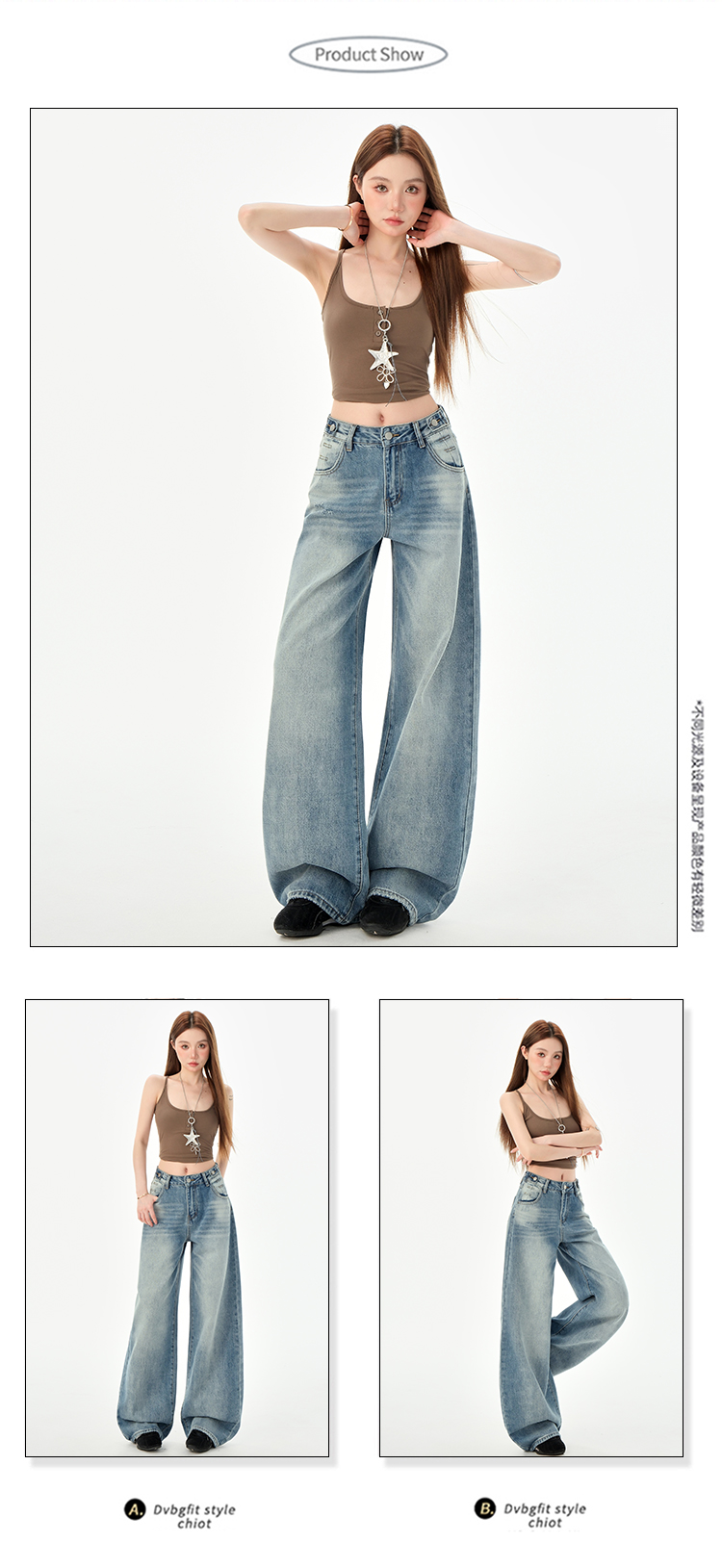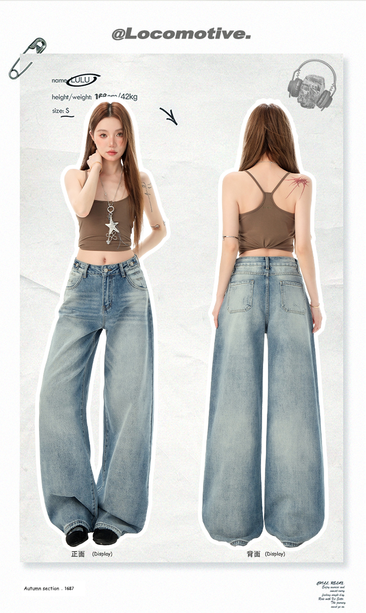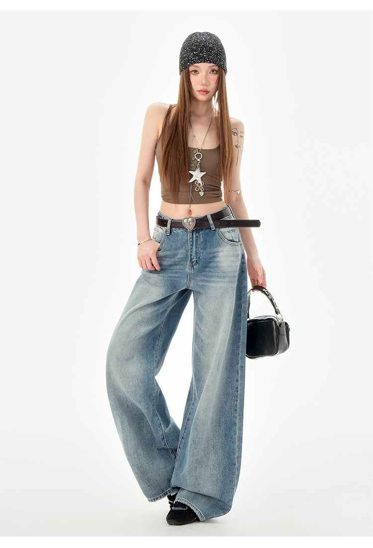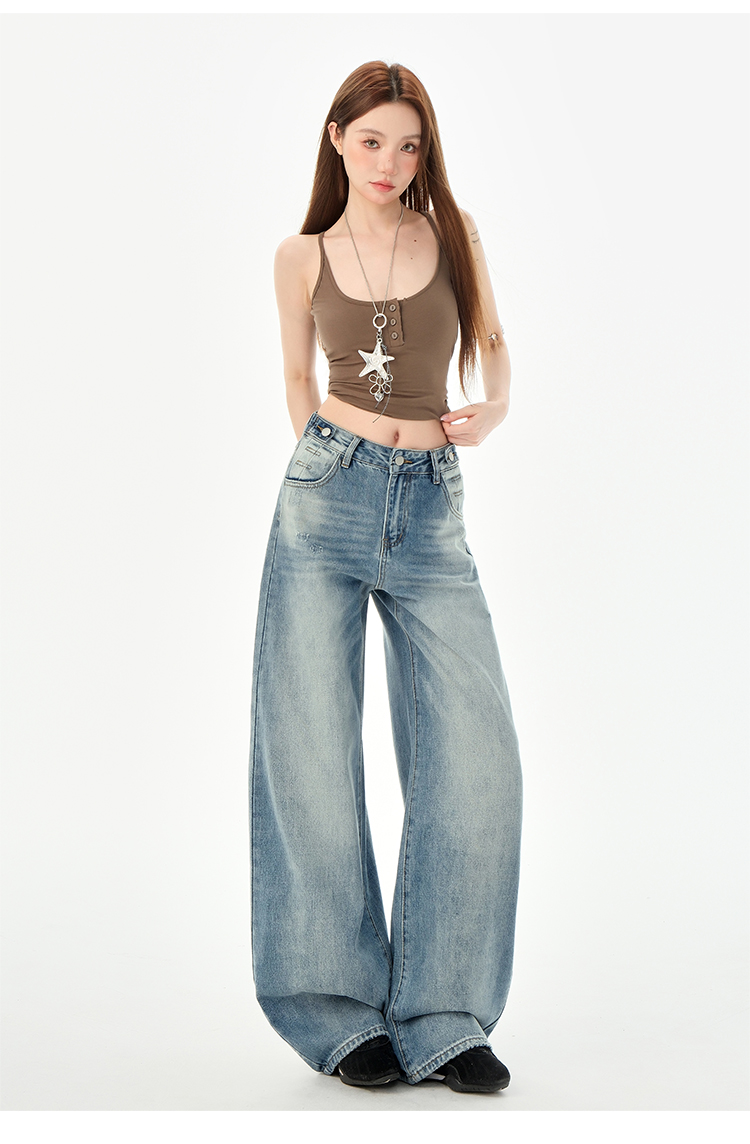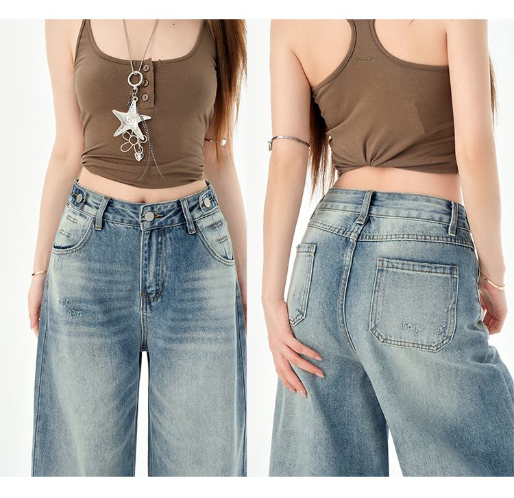 罗蒙女士高腰百搭阔腿牛仔裤女春夏浅蓝复古宽松显瘦时尚百搭直筒裤子