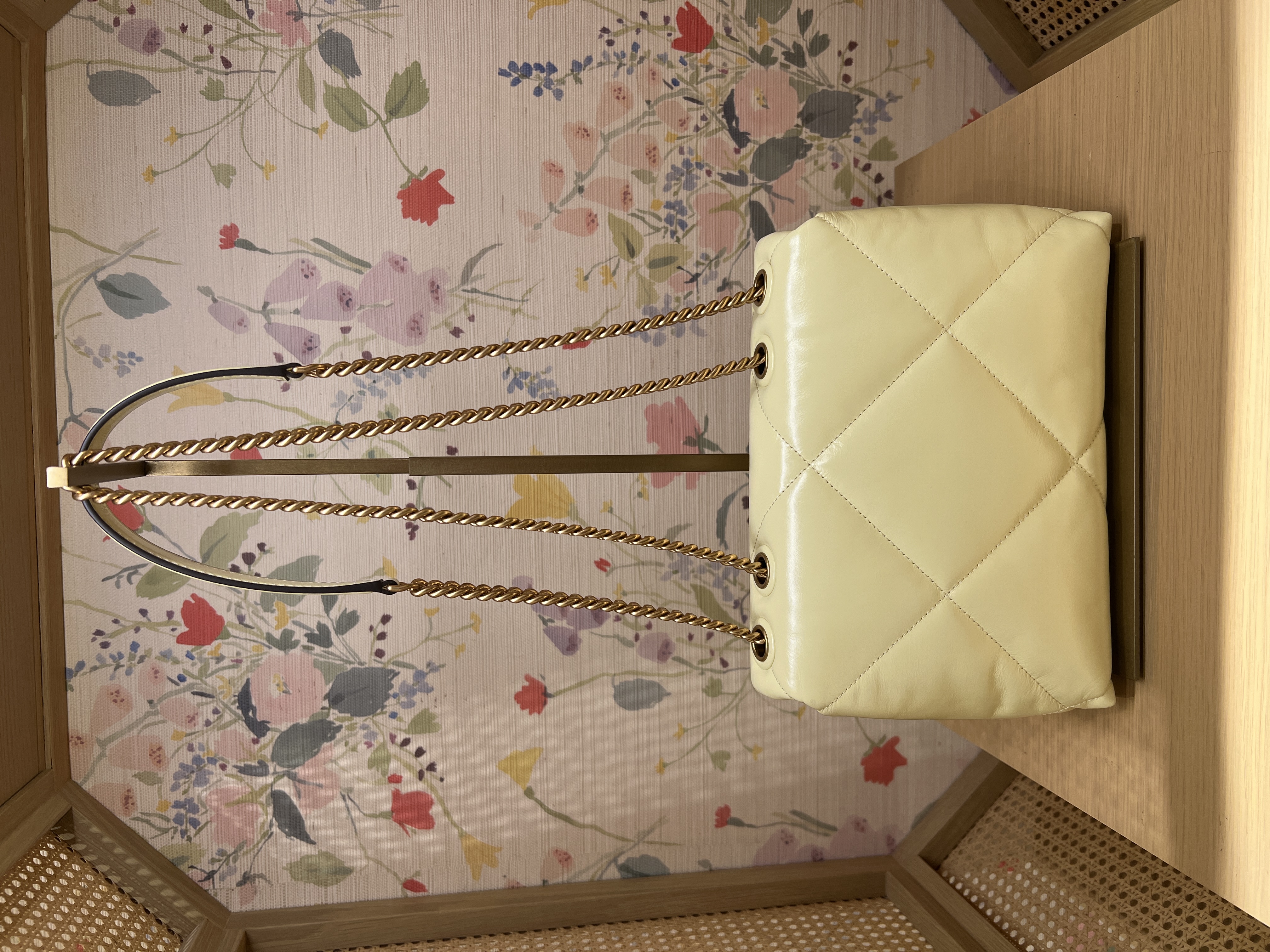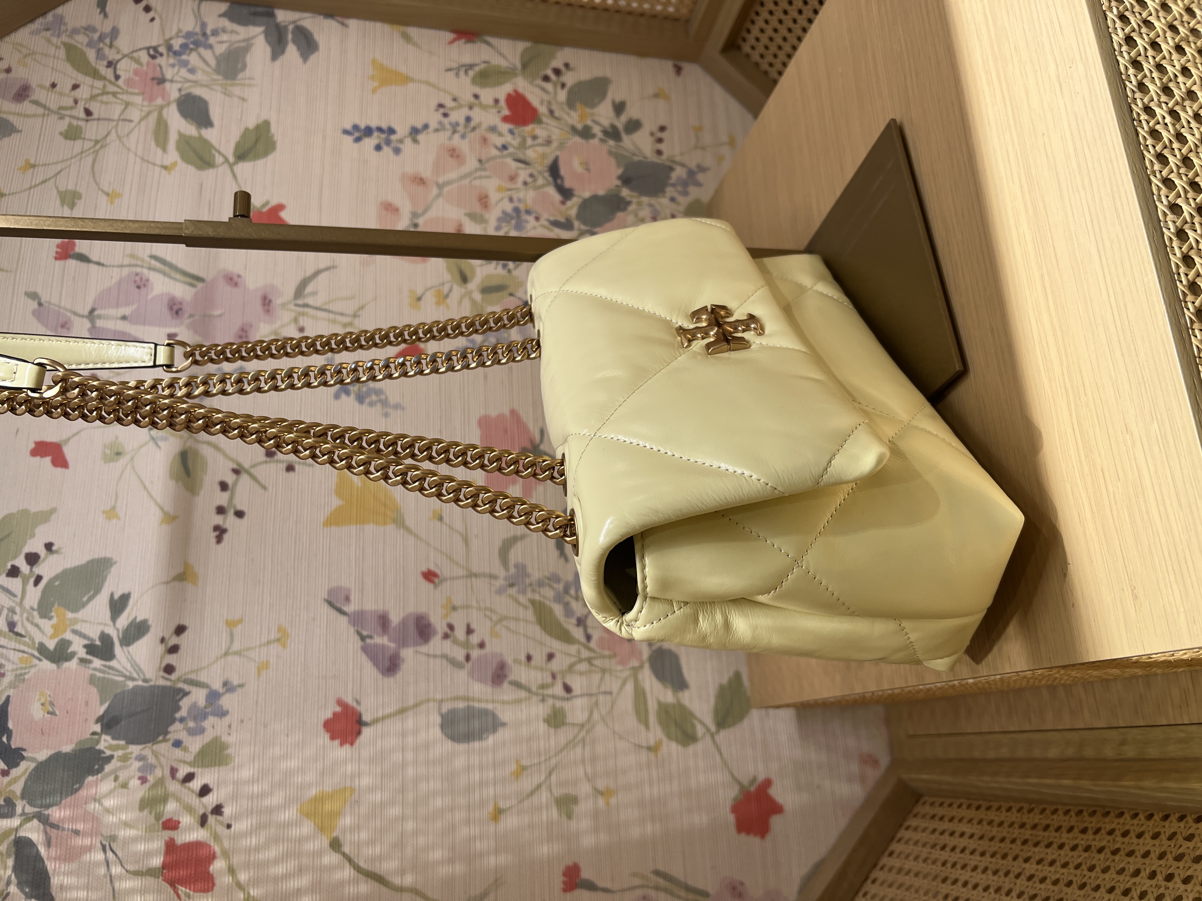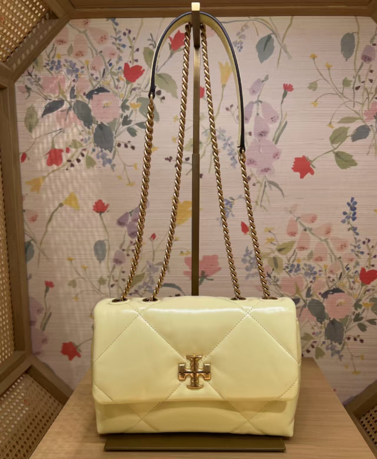 Kira 菱格纹绗缝链条钱夹,柔韧皮质,纵延菱格纹理。蓬松如云,勾勒多元廓形,搭配斜面双 T Logo 饰件。
