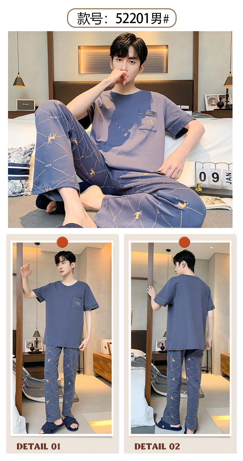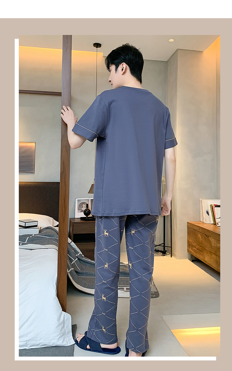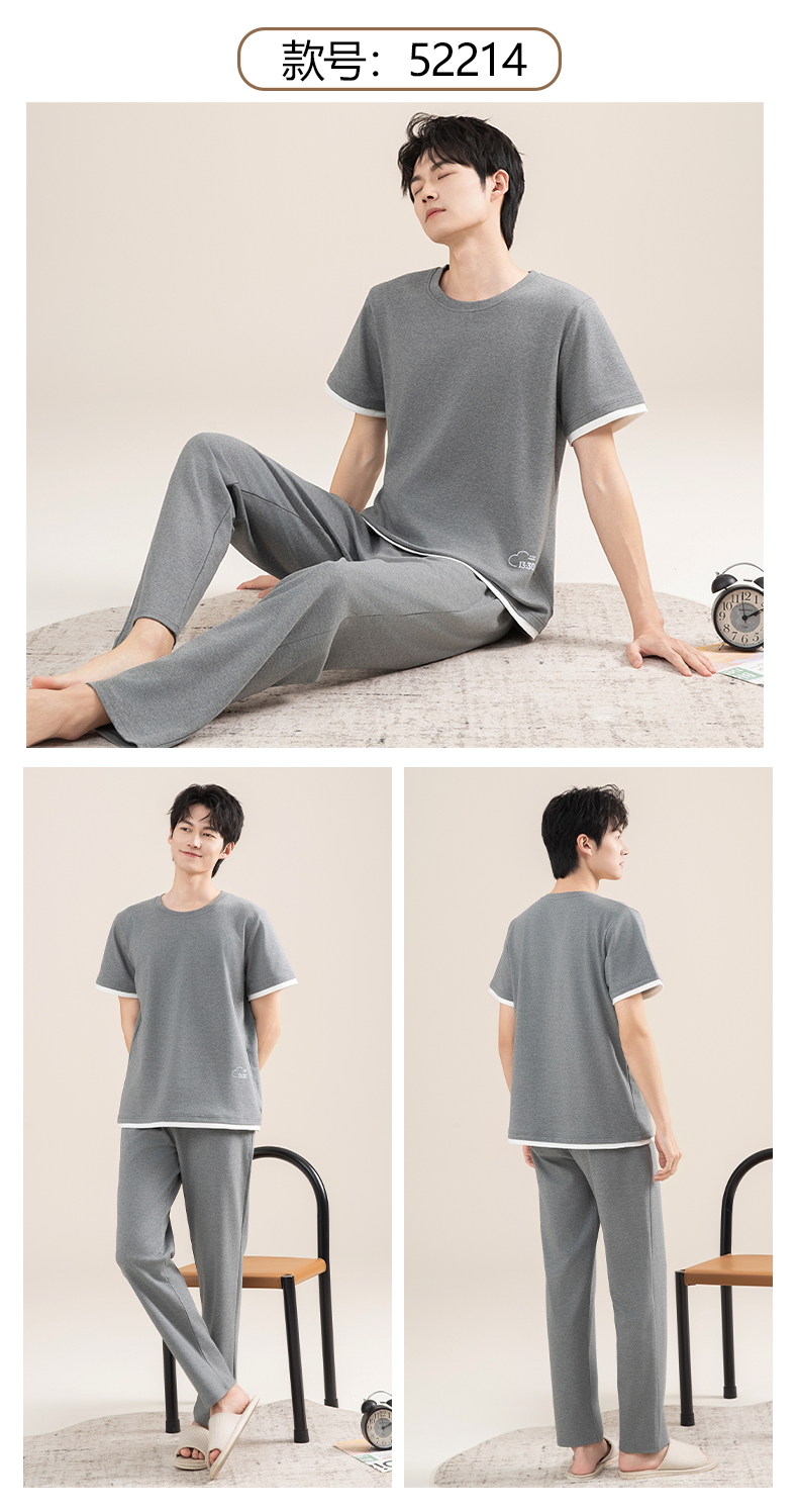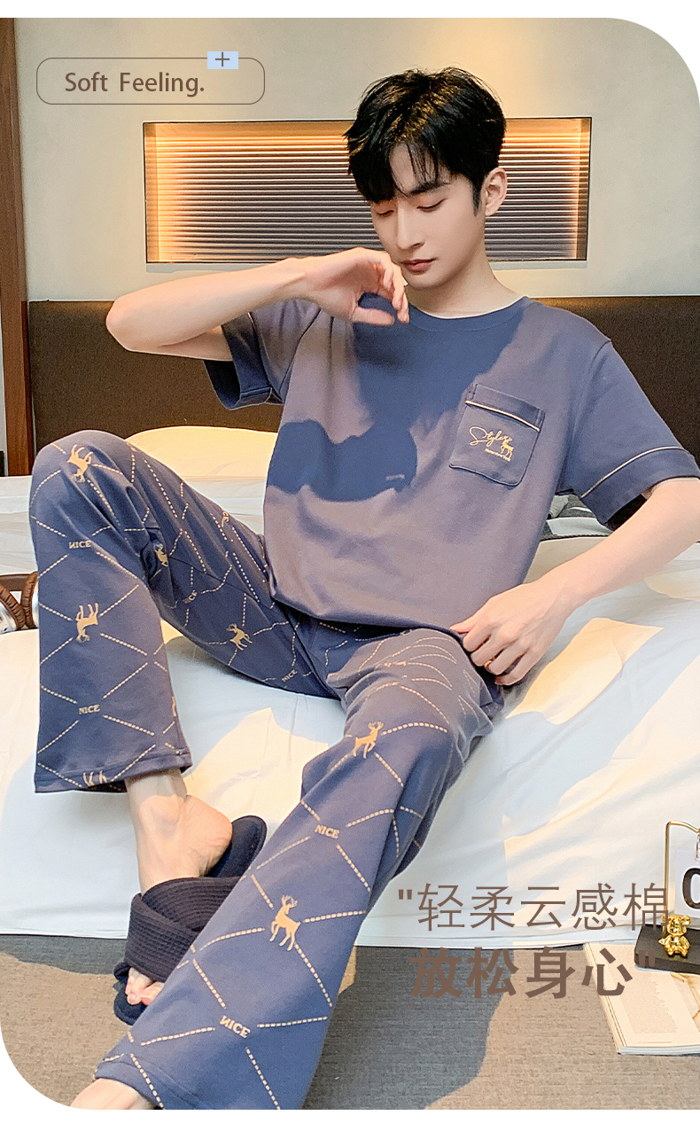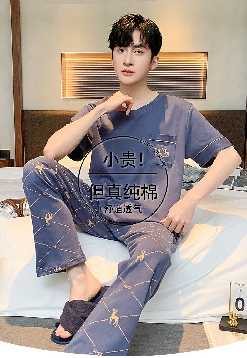自然醒浮云家居服睡衣男士夏季纯棉薄款短袖长裤可外穿宽松大码家居服套装QH