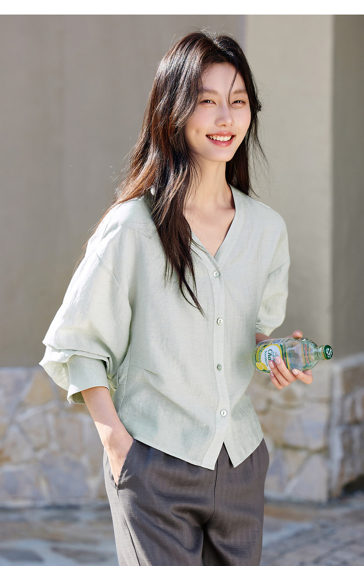 设计感捏褶收腰长袖衬衫693:23.5%锦纶、11.5%亚麻、65%人棉