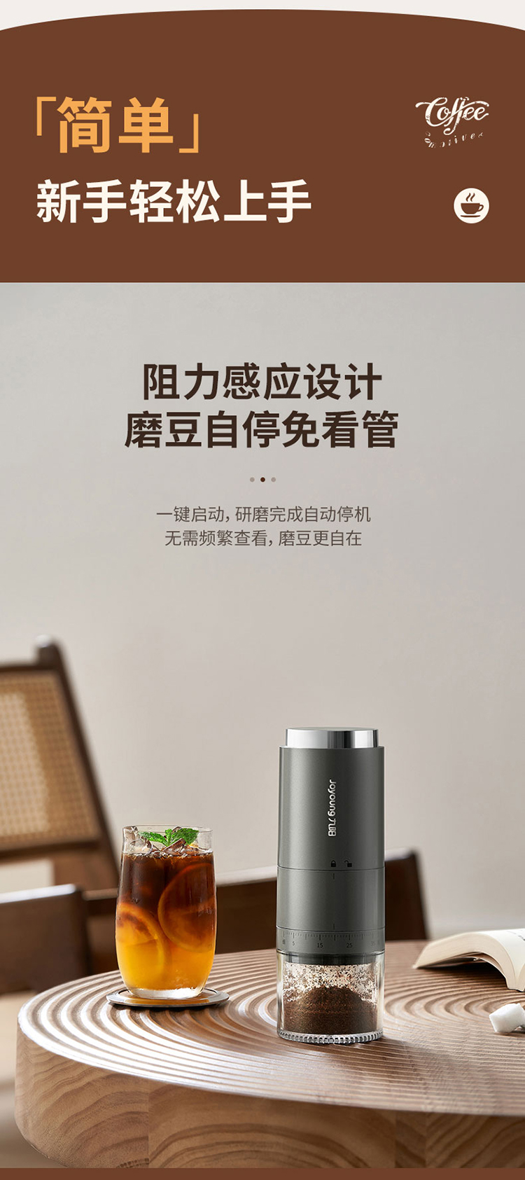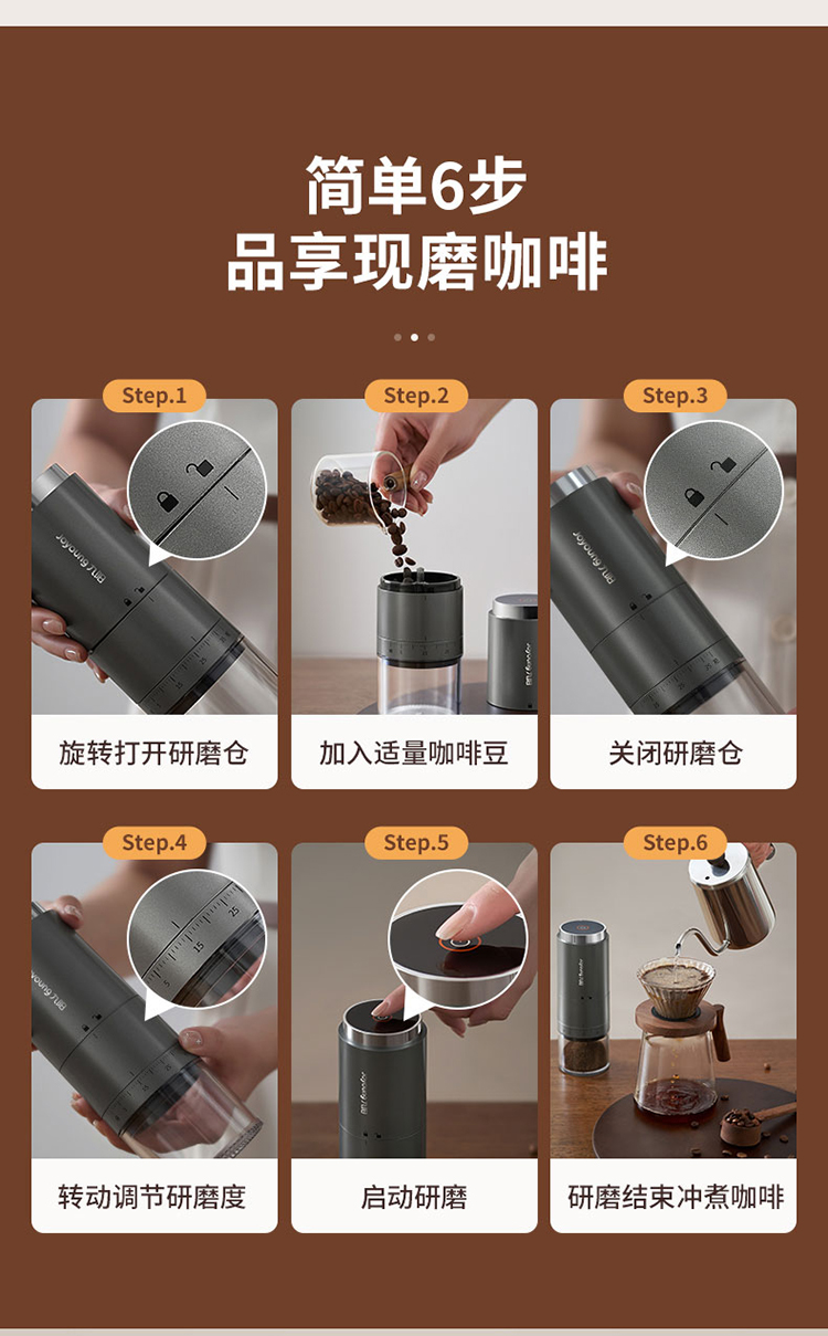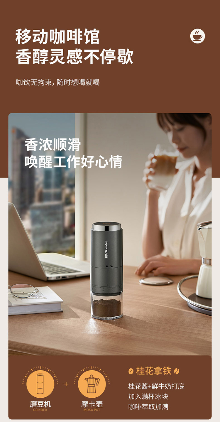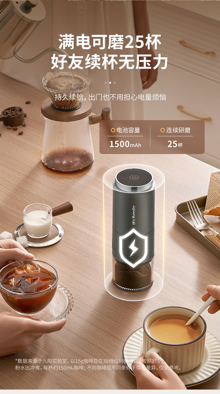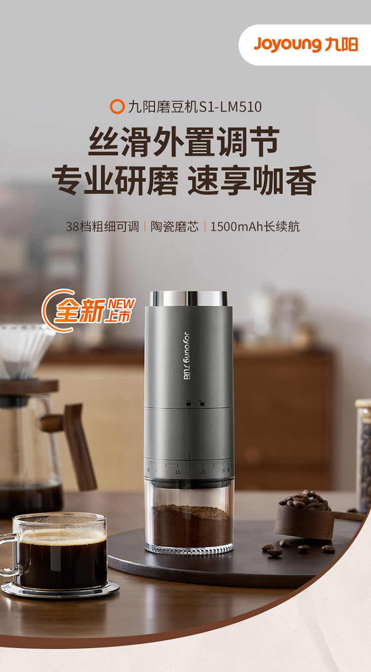 【自营】 九阳 咖啡磨粉机 38档粗细调节 无线使用长续航 锥形磨心