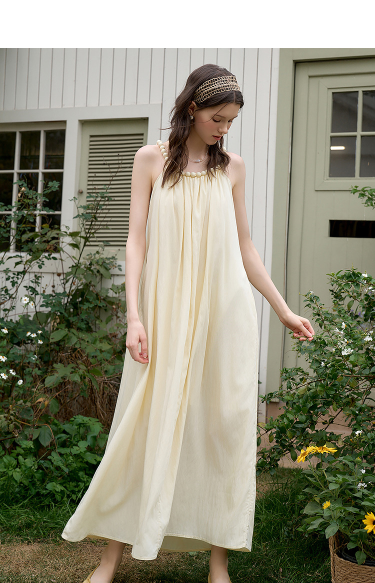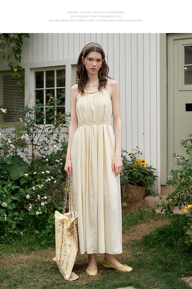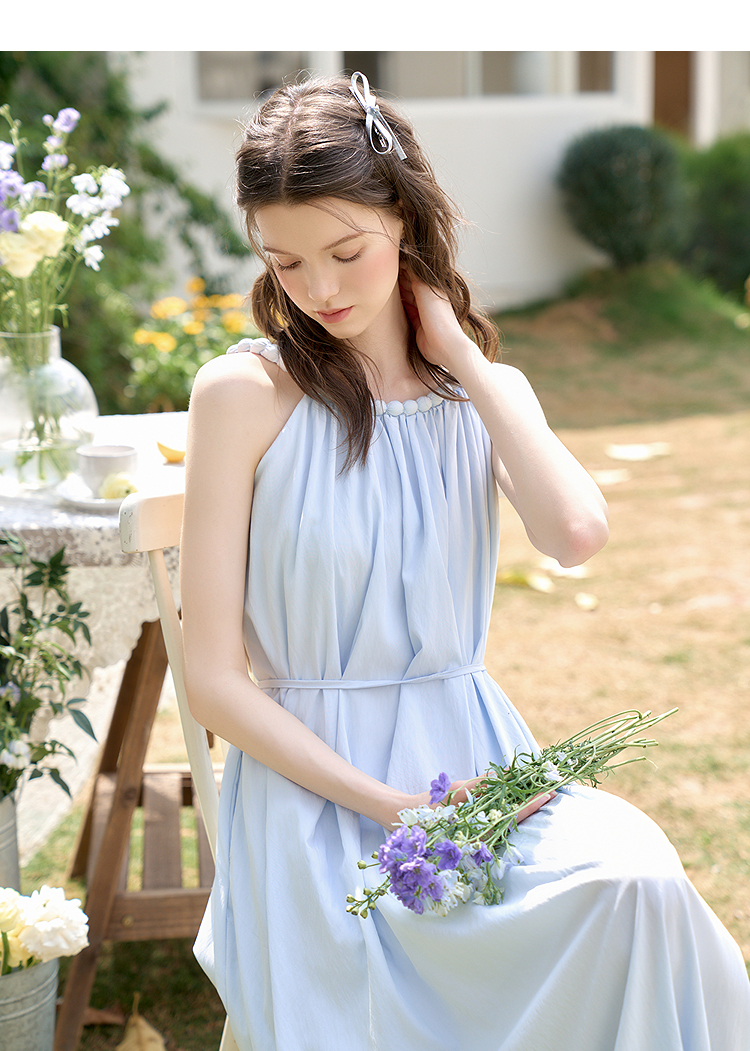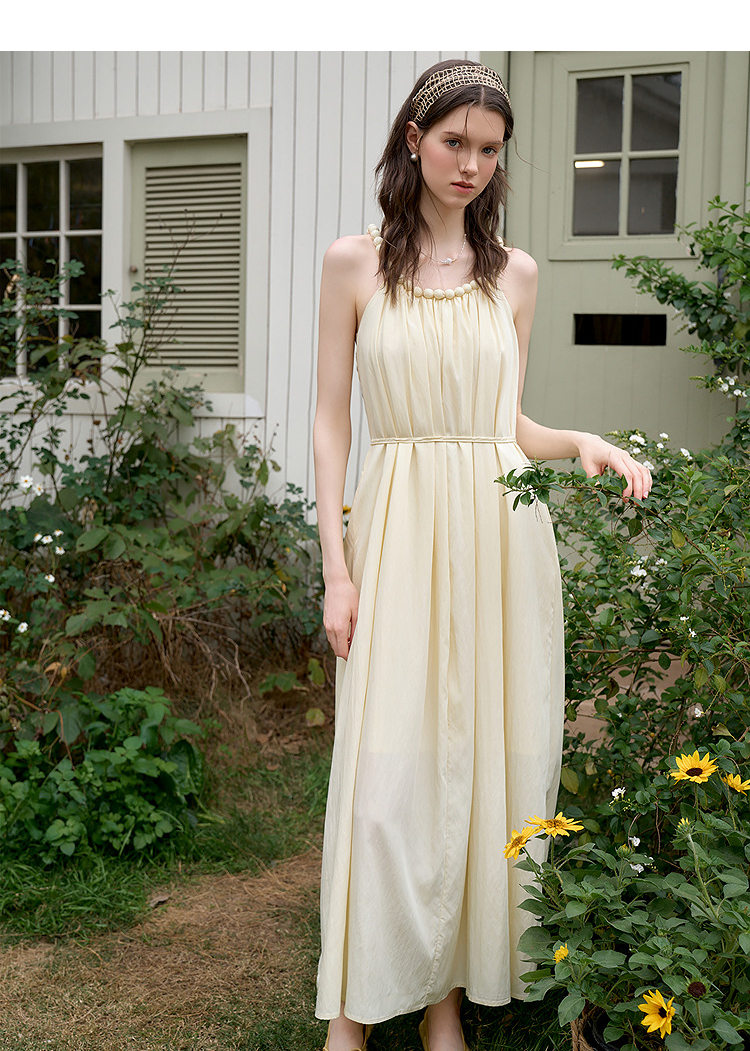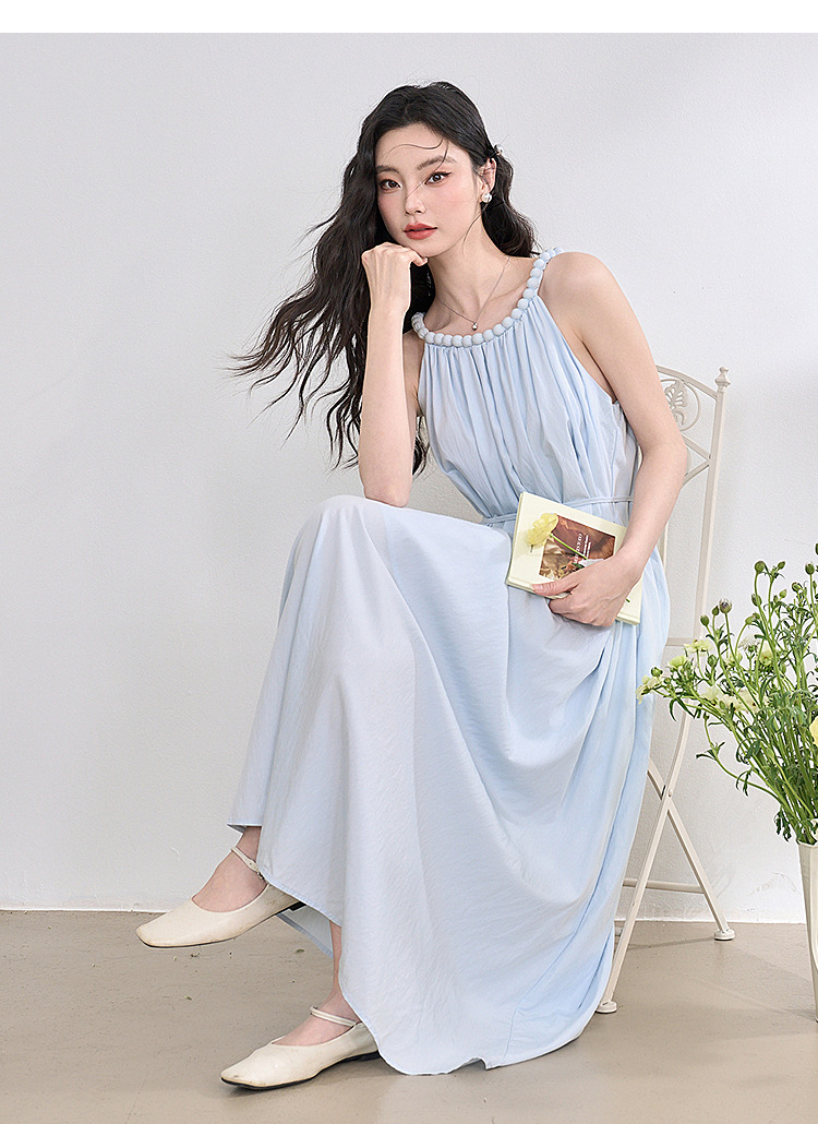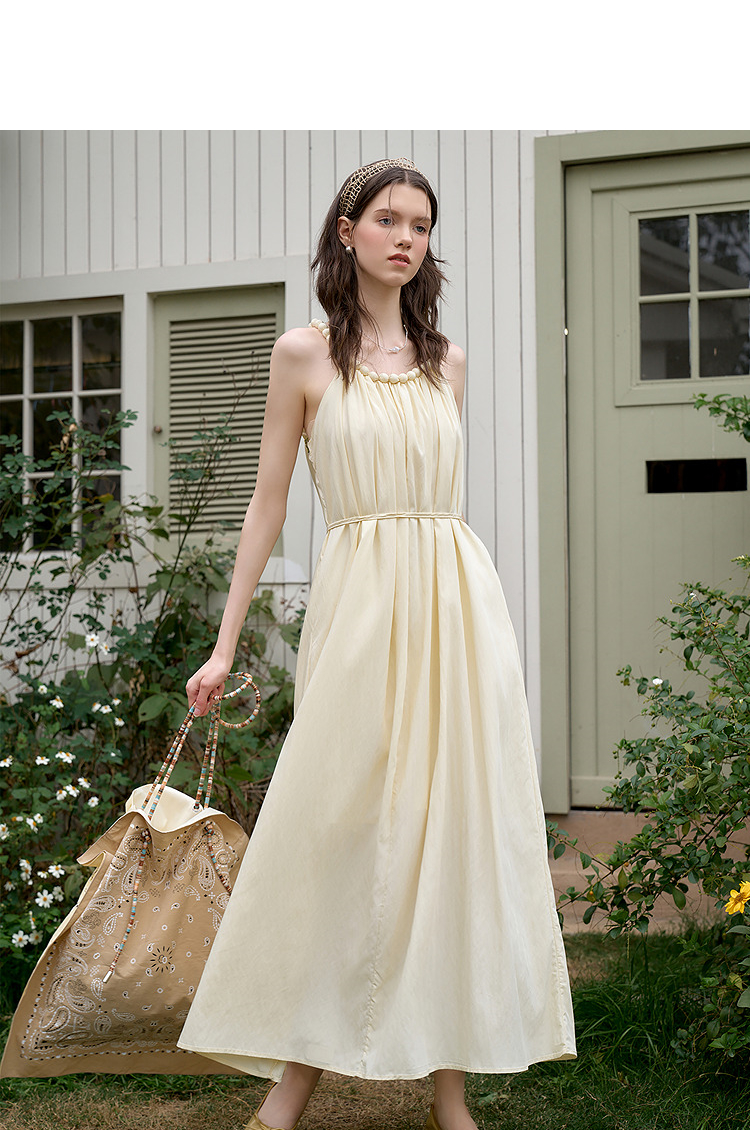 西遇法式挂脖连衣裙女新款海边沙滩度假风无袖收腰长裙D0050492