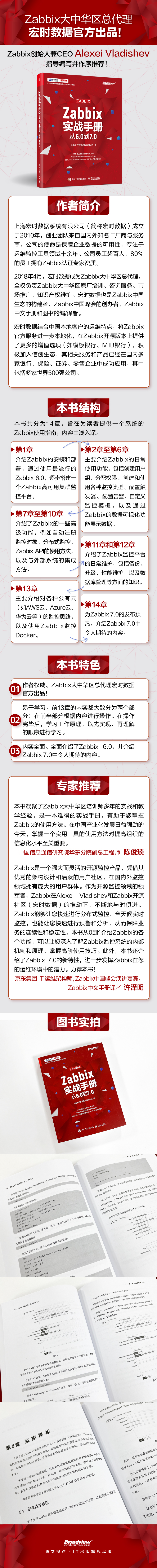 本书介绍了如何设置具有内置高可用的Zabbix、使用改进的业务服务监控、设置自动报告及创建*级触发器。Zabbix提供了有关基础设施性能和故障的有效洞察,并能够利用其强大的功能增强监控。本书提供了易于遵循的操作步骤,用于使用Zabbix 6.0有效地监控网络设备和应用程序的性能。本书首先介绍了安装Zabbix 6.0,并构建了可扩展且易于管理的环境,也介绍了为不同类型的监控构建模板和使用代理构建项目与触发器的操作步骤。然后,本书使用Zabbix 6.0 API进行定制,并有效地管理Zabbix 6.0服务器和数据库。*后,本书介绍了在Zabbix 6.0监控工作中可能遇到的问题的快速解决方案。