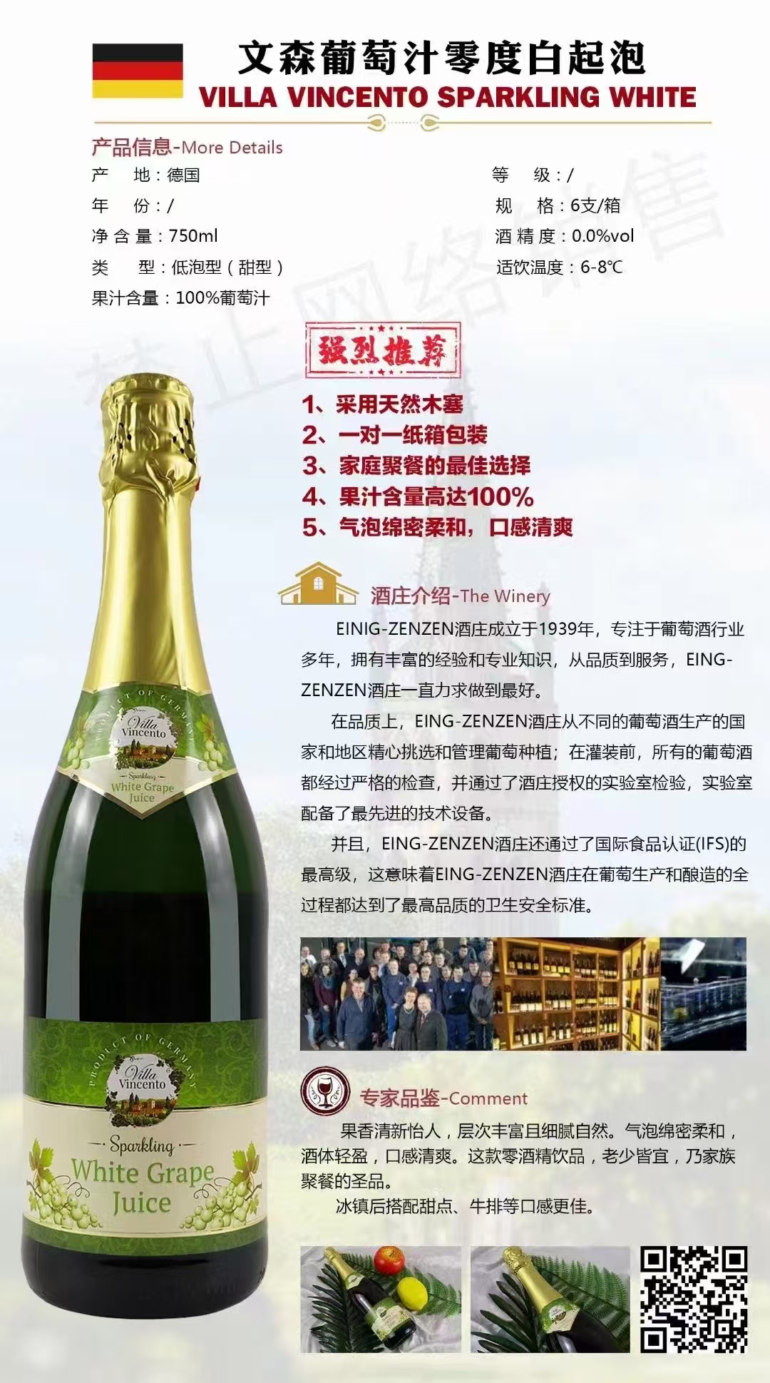 德国进口文森无醇气泡白葡萄汁 整箱750ml*6瓶包邮
