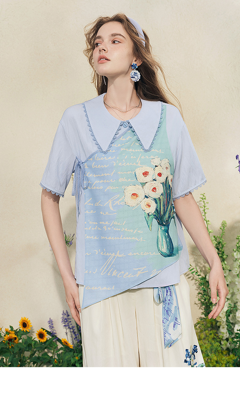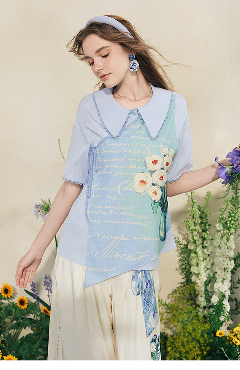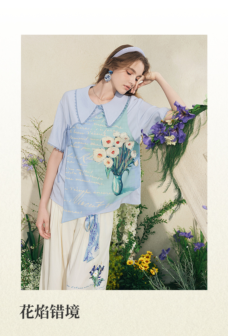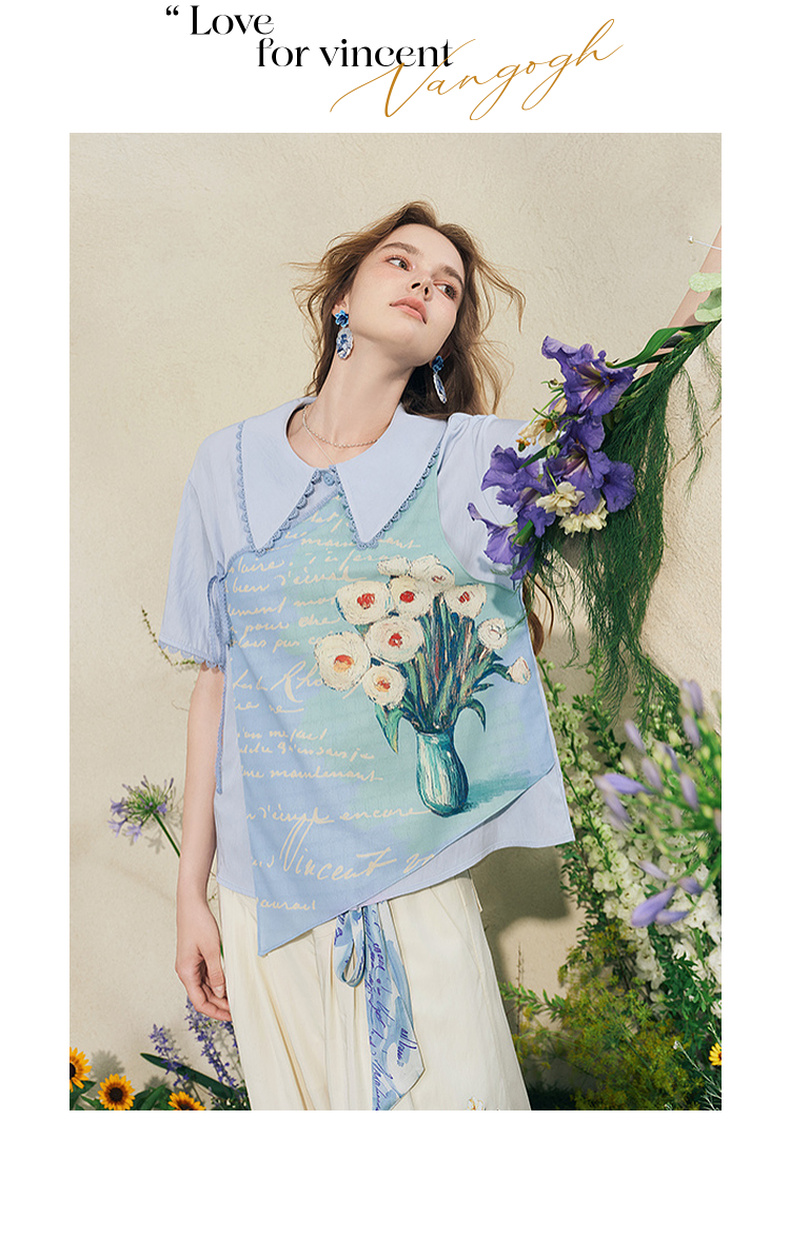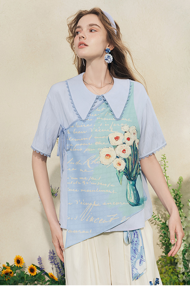 两三事梵高文艺花焰错境2025夏季新款文艺风印花布绑带短袖衬衫女