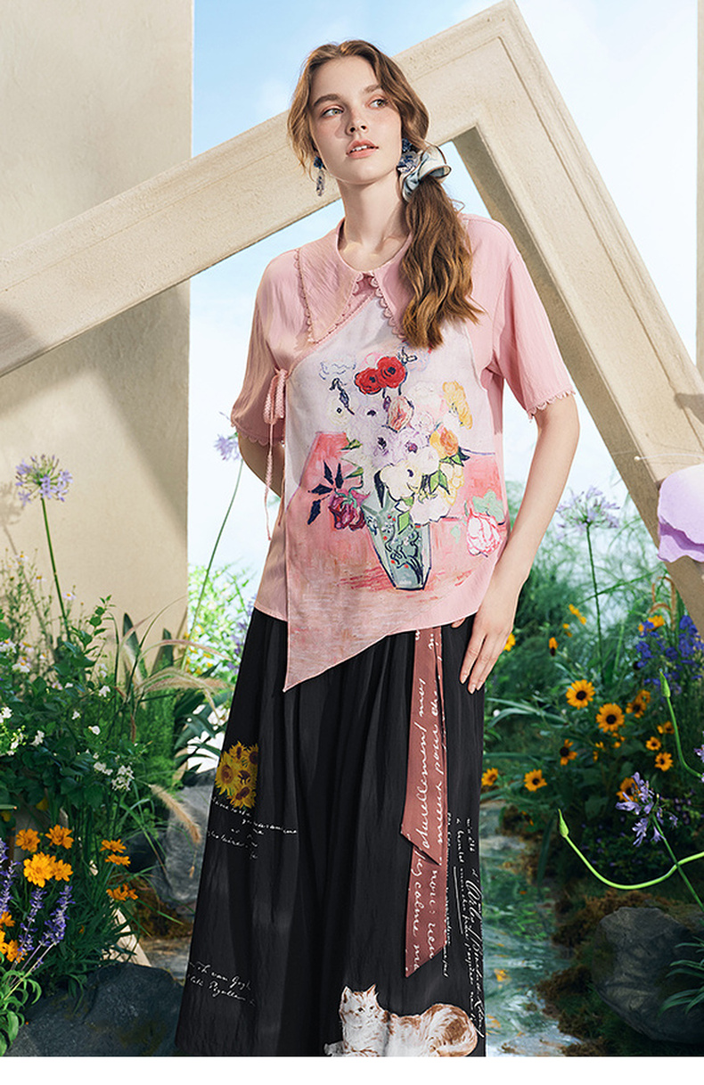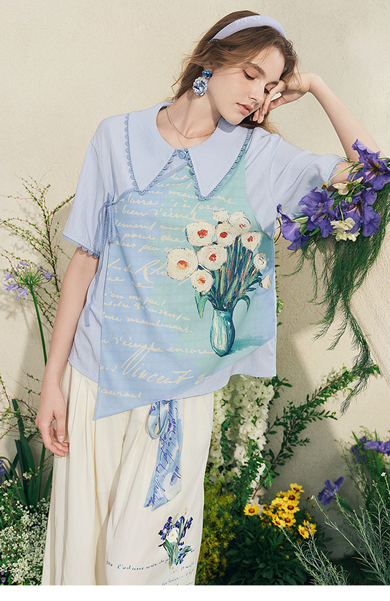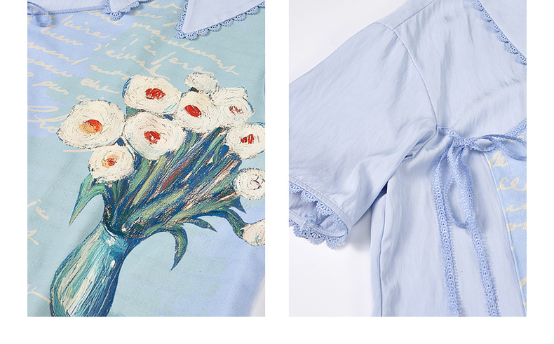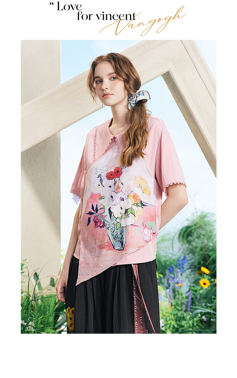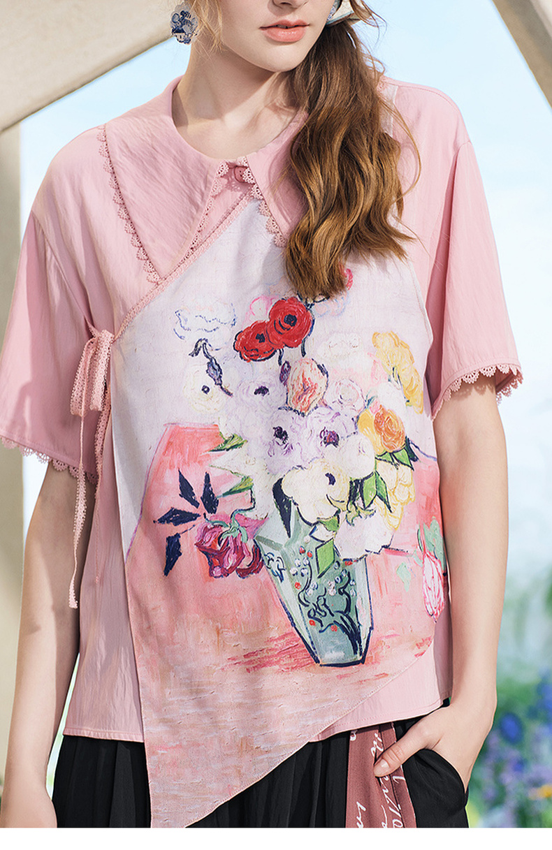 两三事梵高文艺花焰错境2025夏季新款文艺风印花布绑带短袖衬衫女