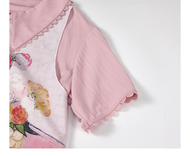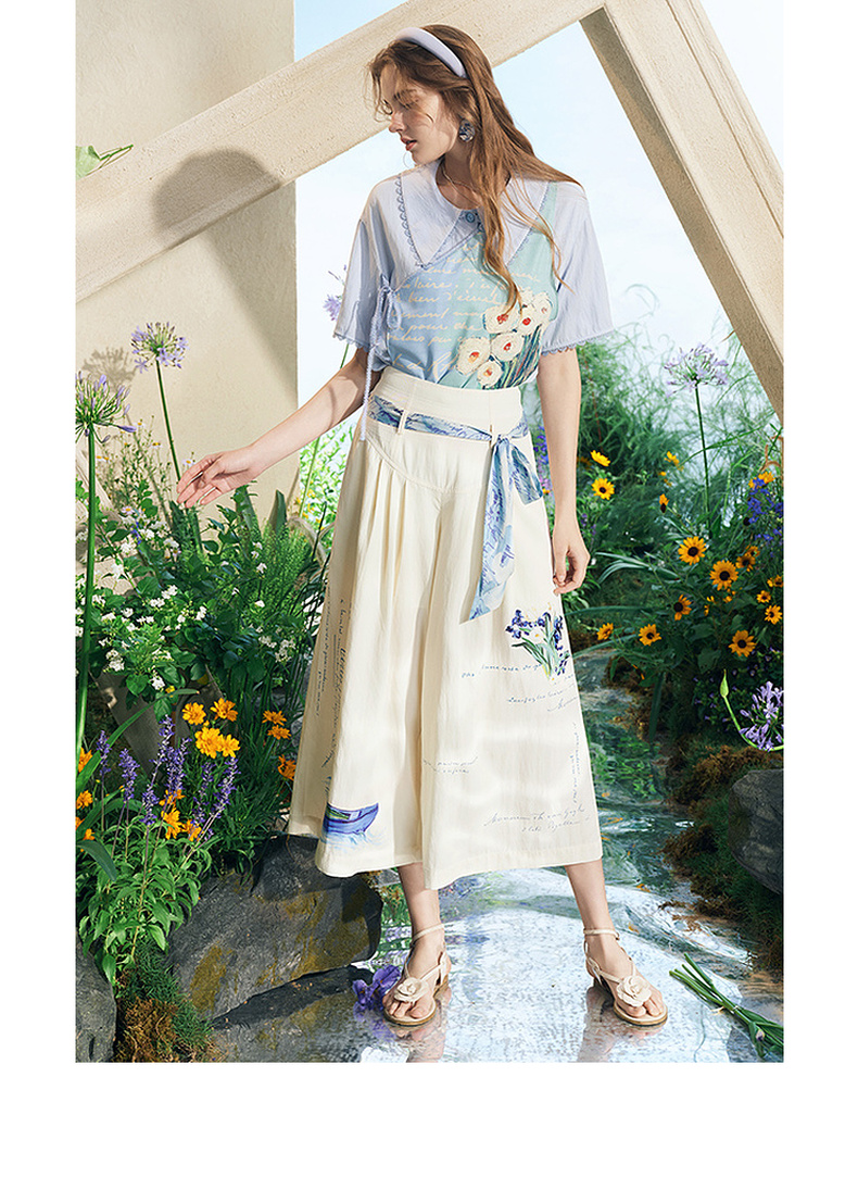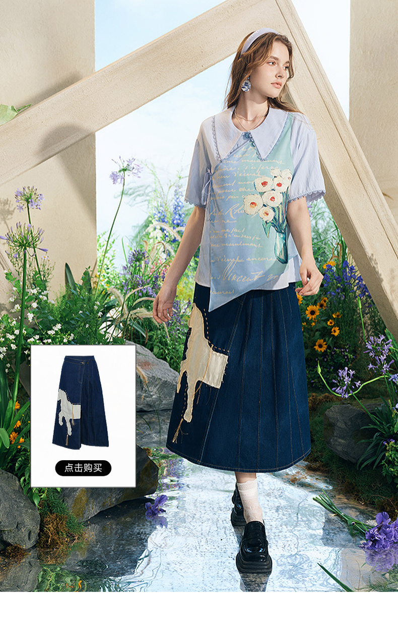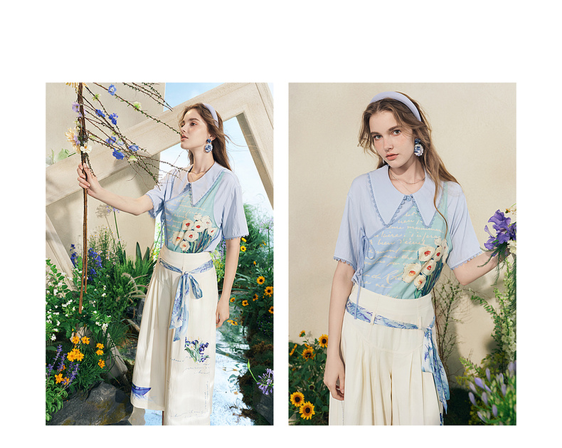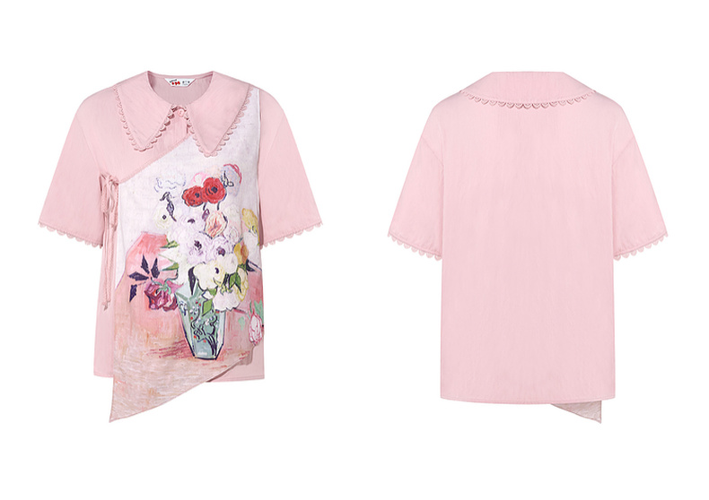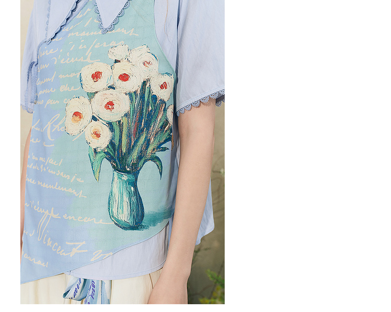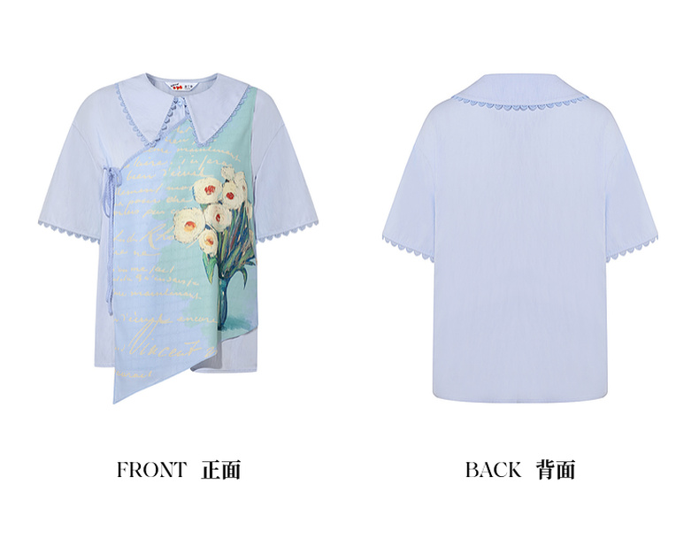 两三事梵高文艺花焰错境2025夏季新款文艺风印花布绑带短袖衬衫女