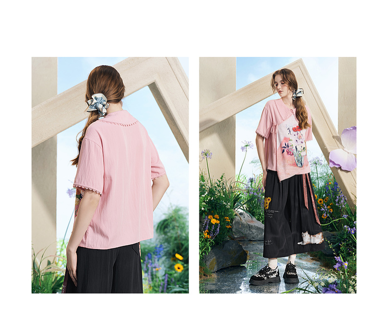 T恤 两三事迷蝶把戏 夏季新款时尚印花蝴蝶结拼接纯棉短袖t恤女