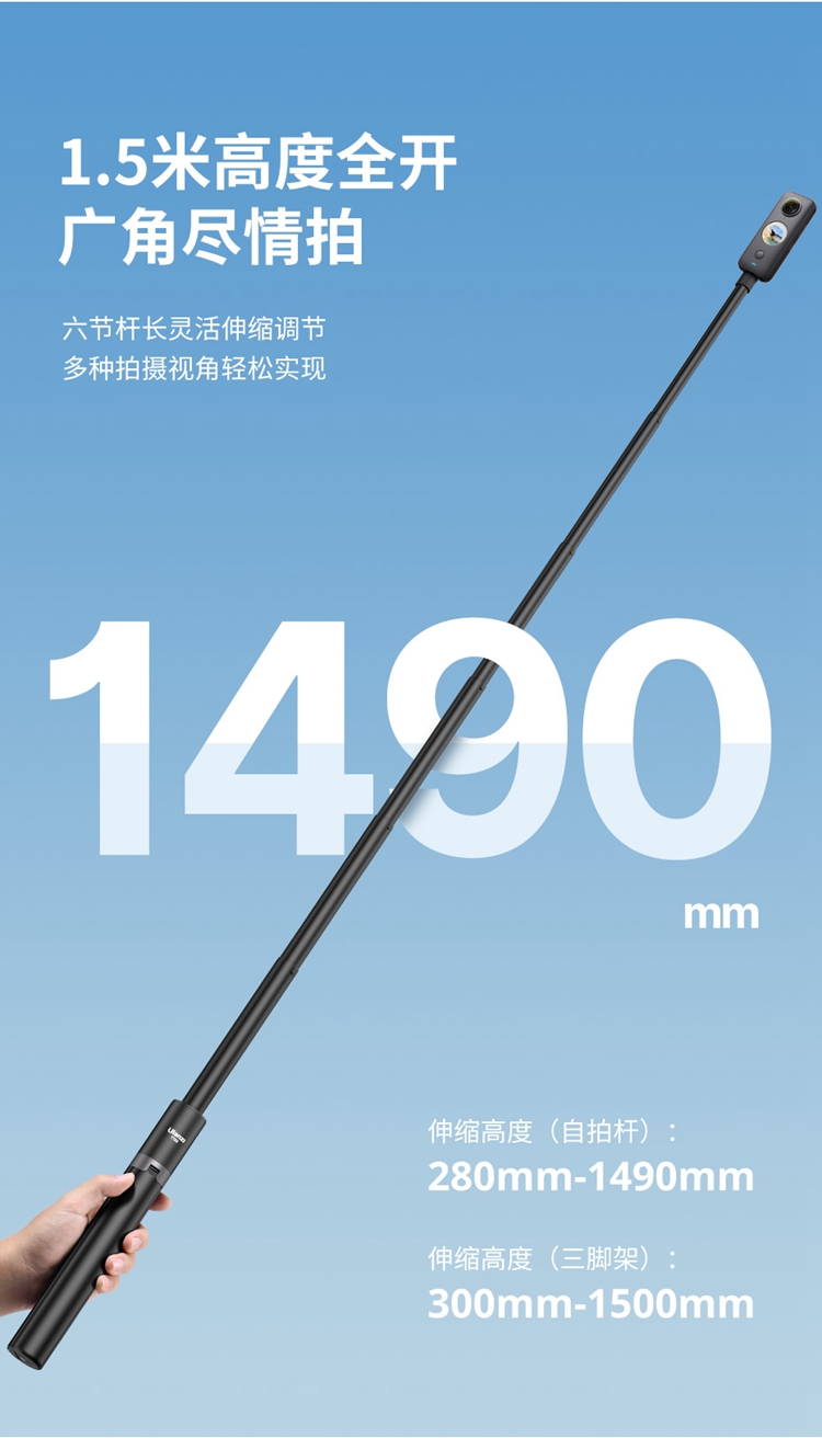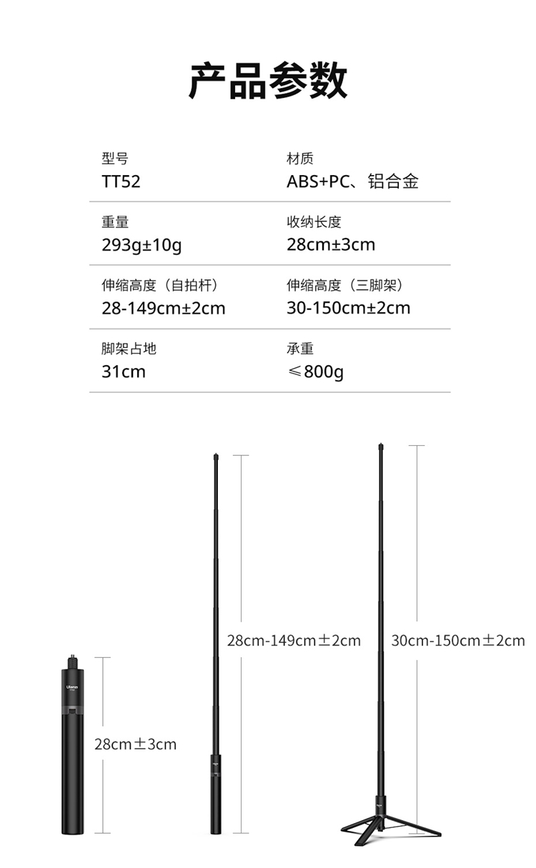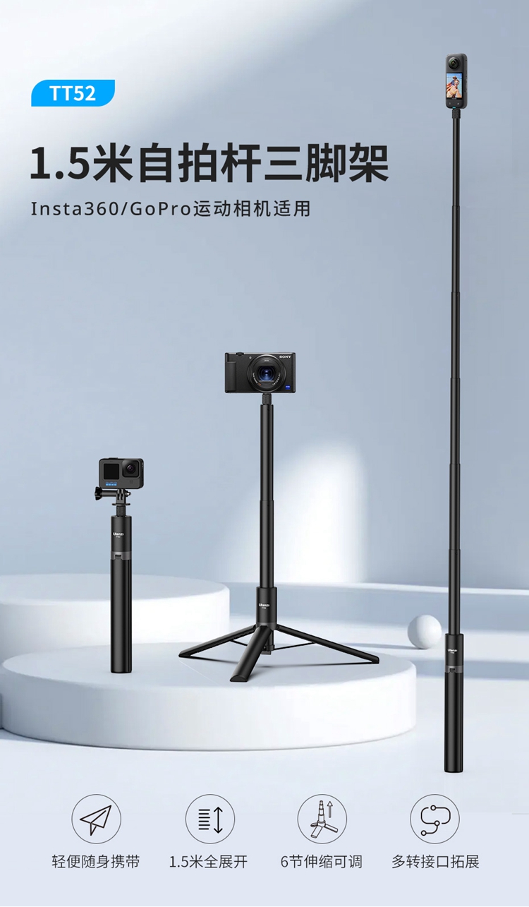 Ulanzi优篮子TT52 运动相机insta360自拍杆三脚架1.5m长