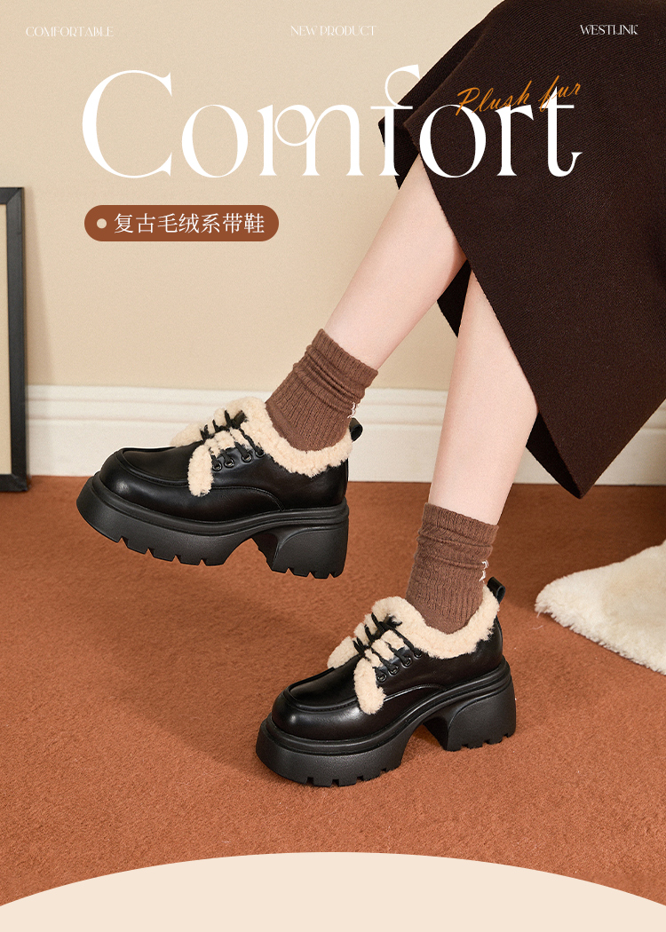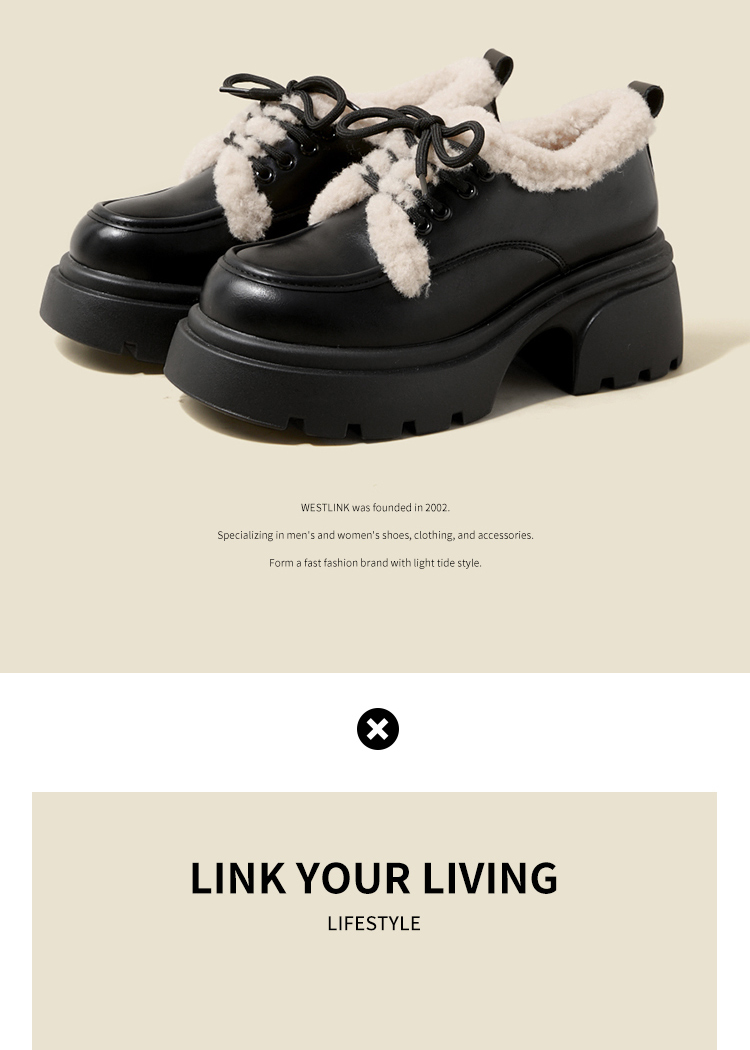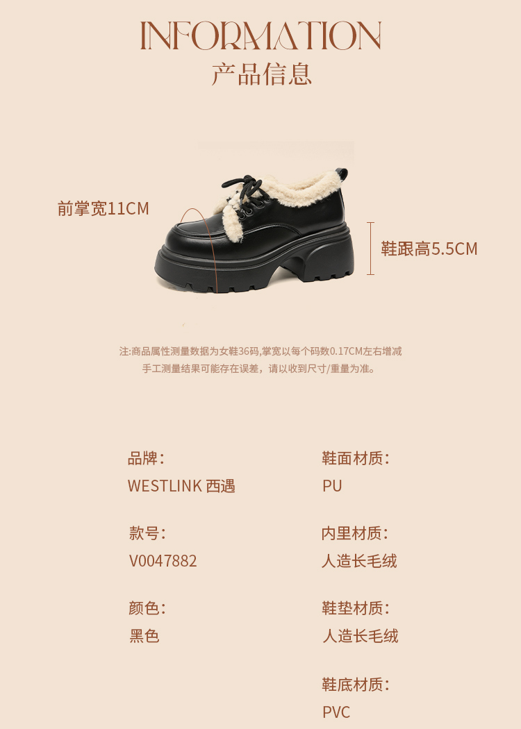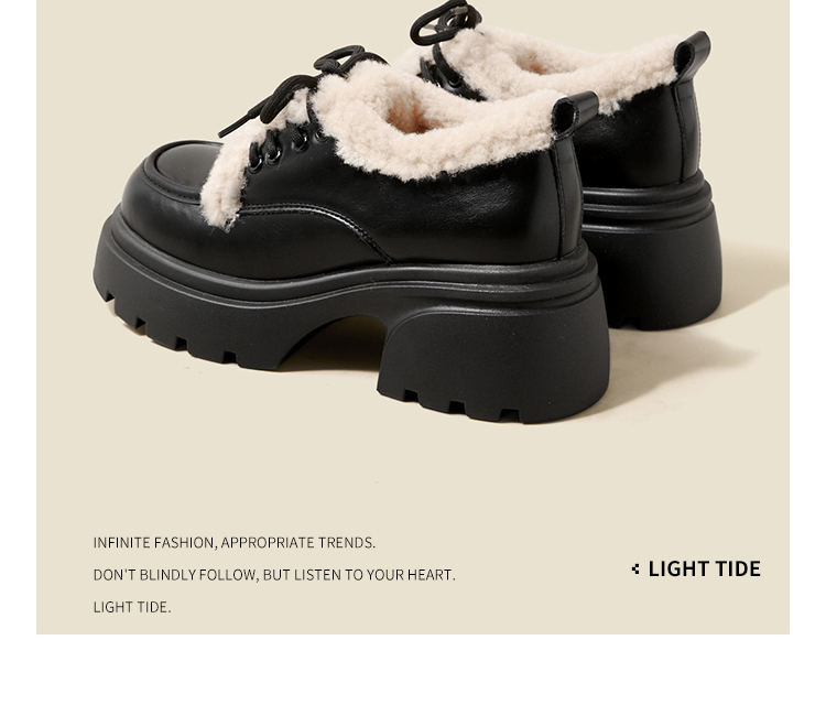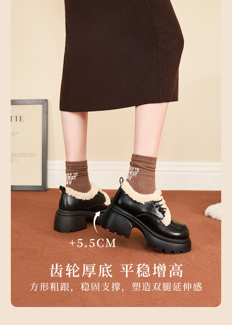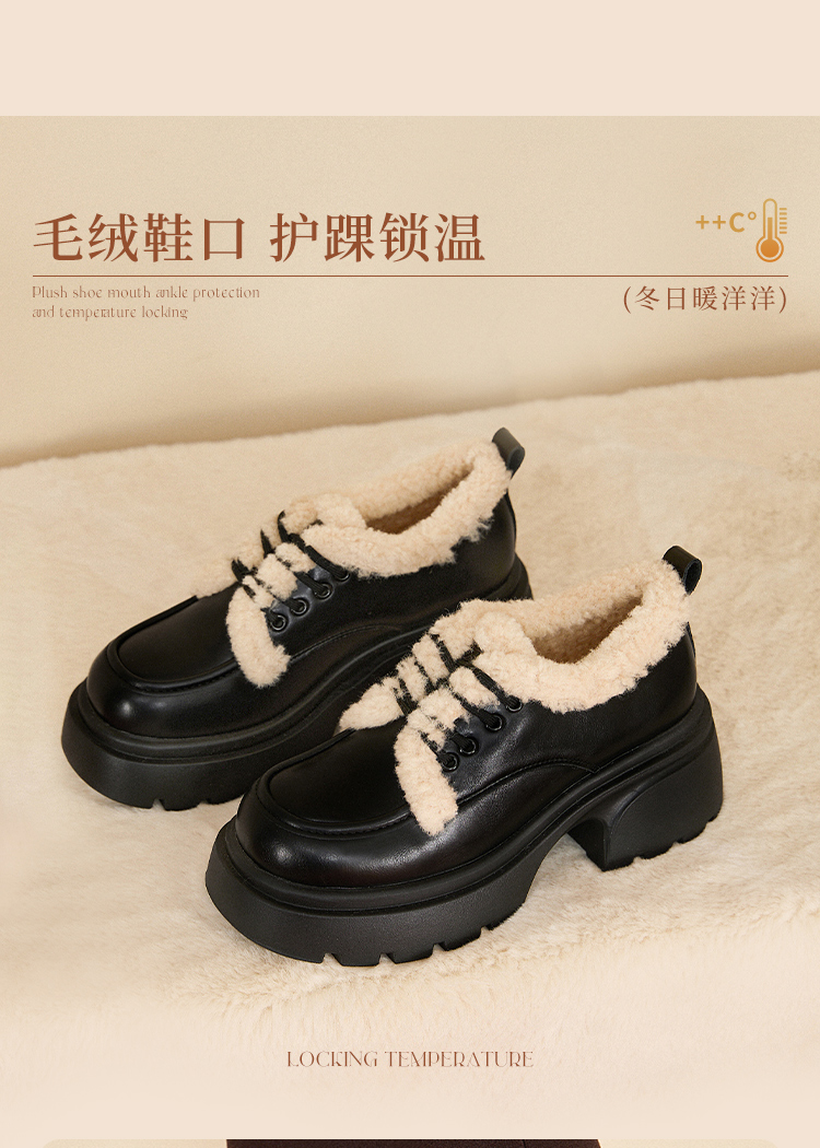 西遇加绒小皮鞋女冬季新款英伦风系带保暖棉鞋增高厚底乐福鞋V0047882