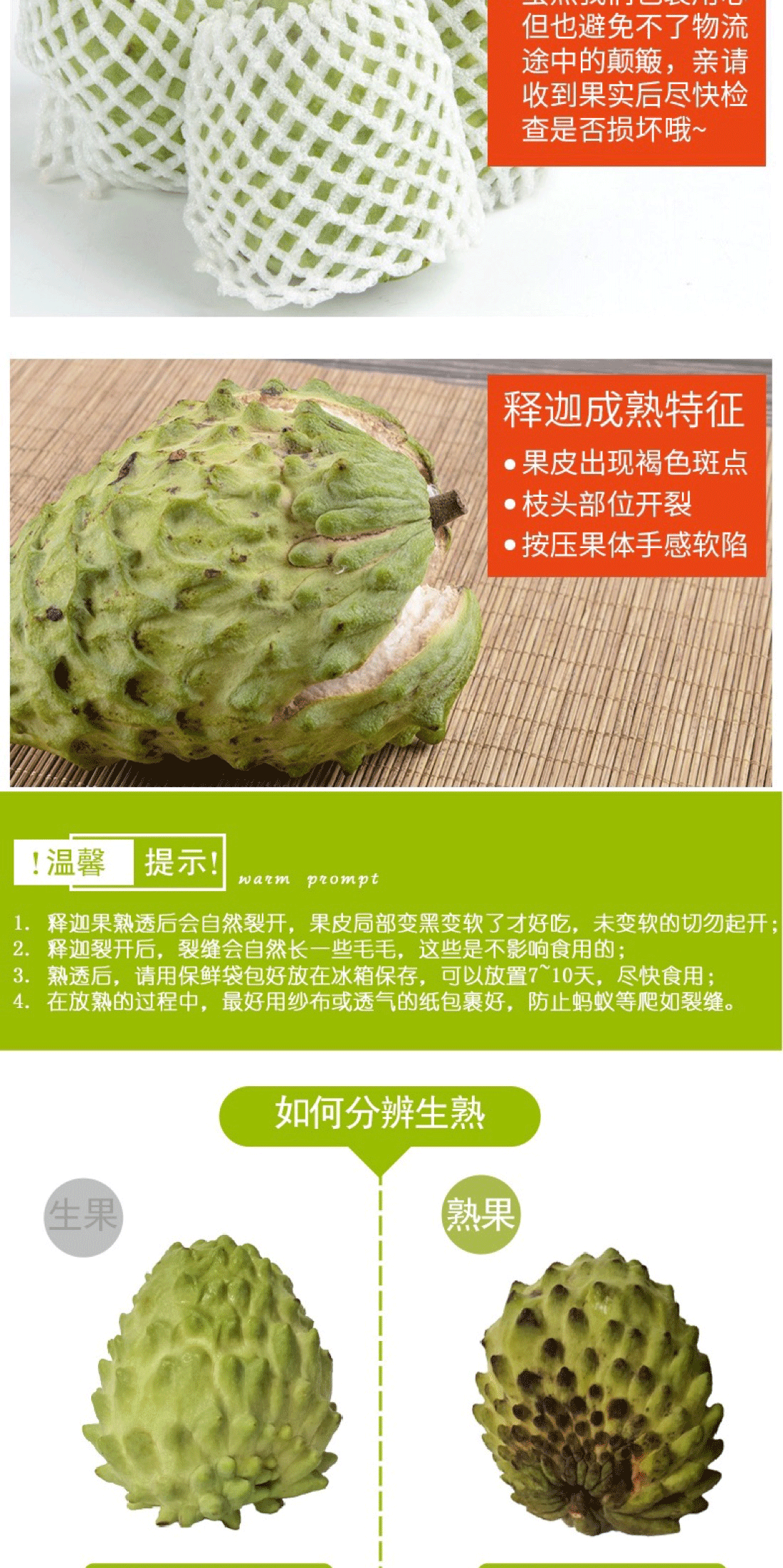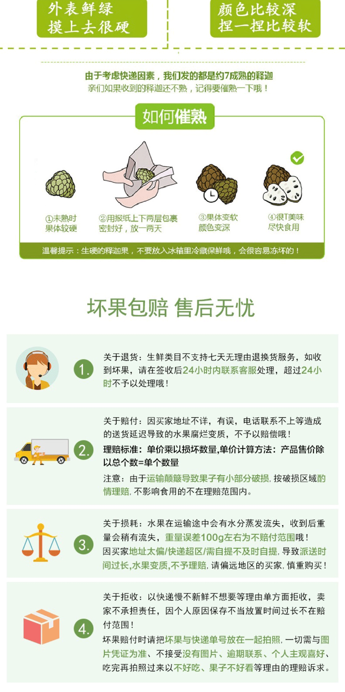 1.到货时,请不要打开原包装,让释迦放在我们发货的箱子里保持静置、自然捂熟。释迦已适应这里的温度,不要换环境,放置3-4天后再打开检查,有坏果请联系售后。