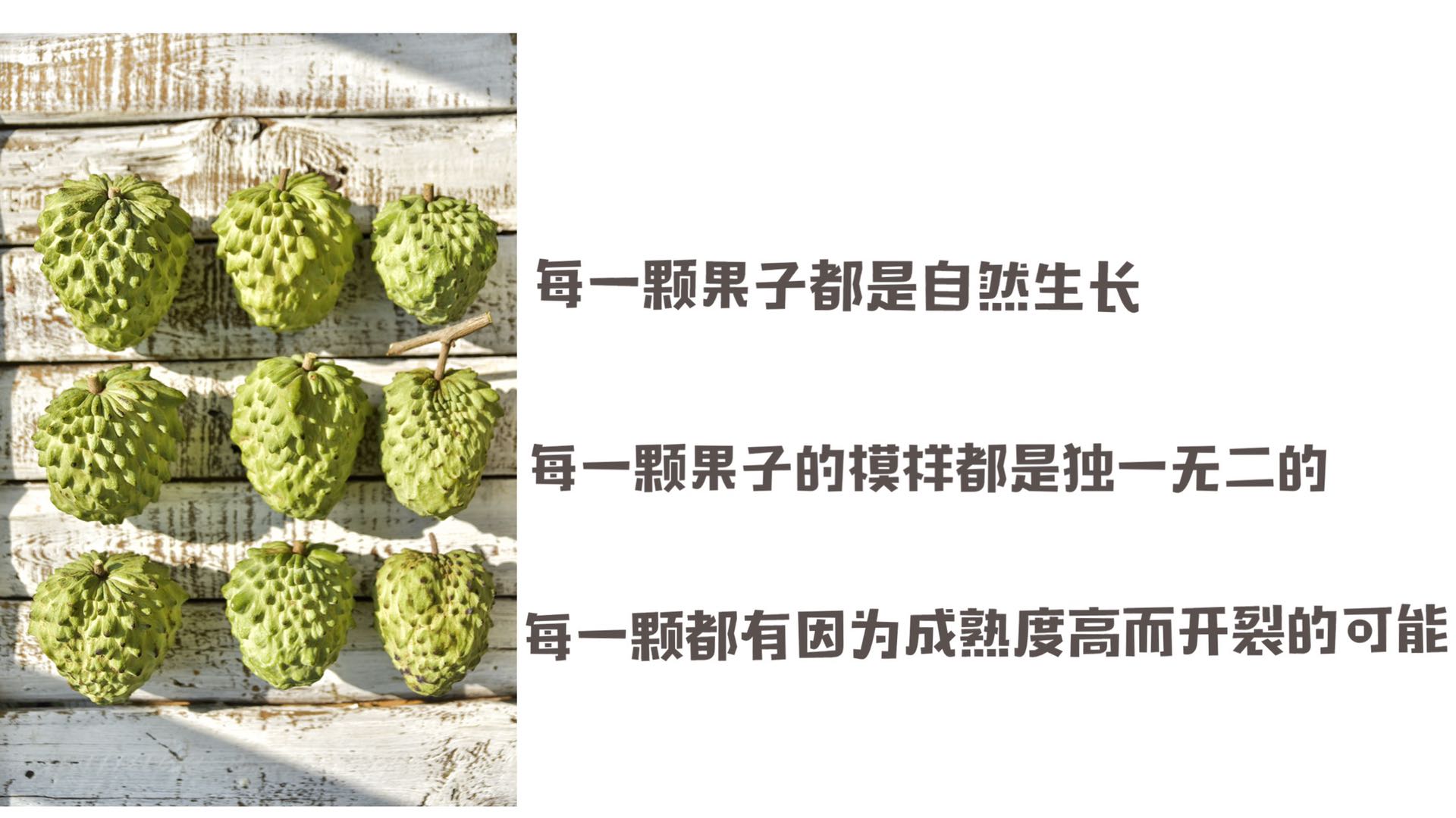 4.凤梨释迦果露天种植,经受风吹日晒、枝叶剐蹭,部分果子可属于正常现象,不影响口感,请放心食用,可能带有一些黑斑疤痕,不在售后范围内!