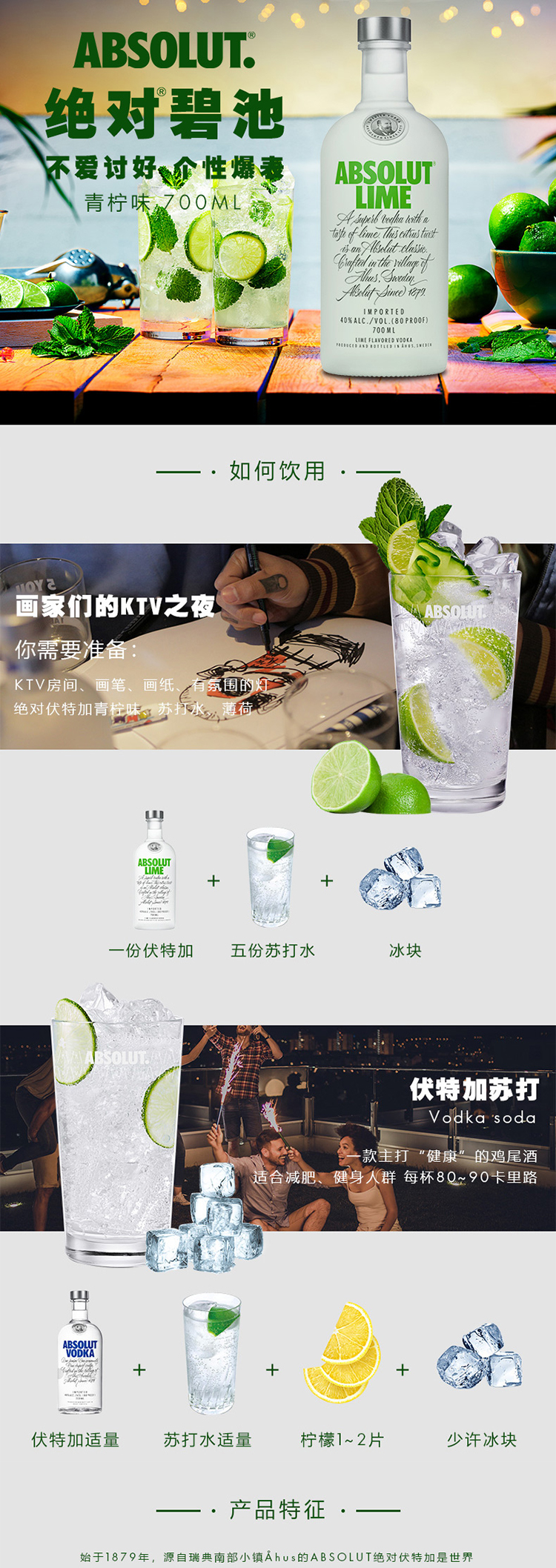 绝对(Absolut)伏特加 洋酒 40度 青柠味 700ml