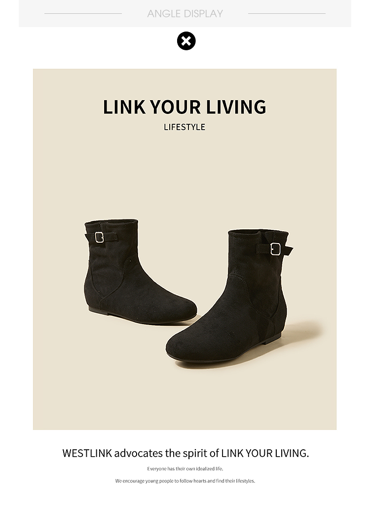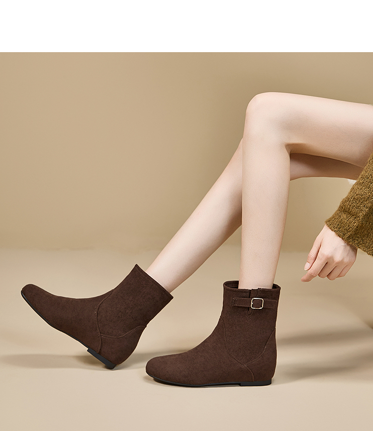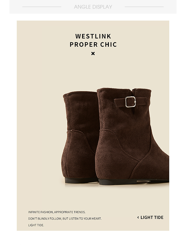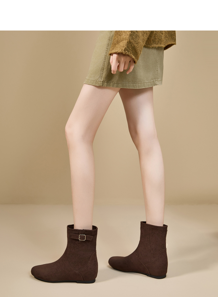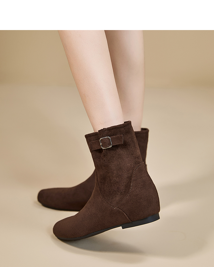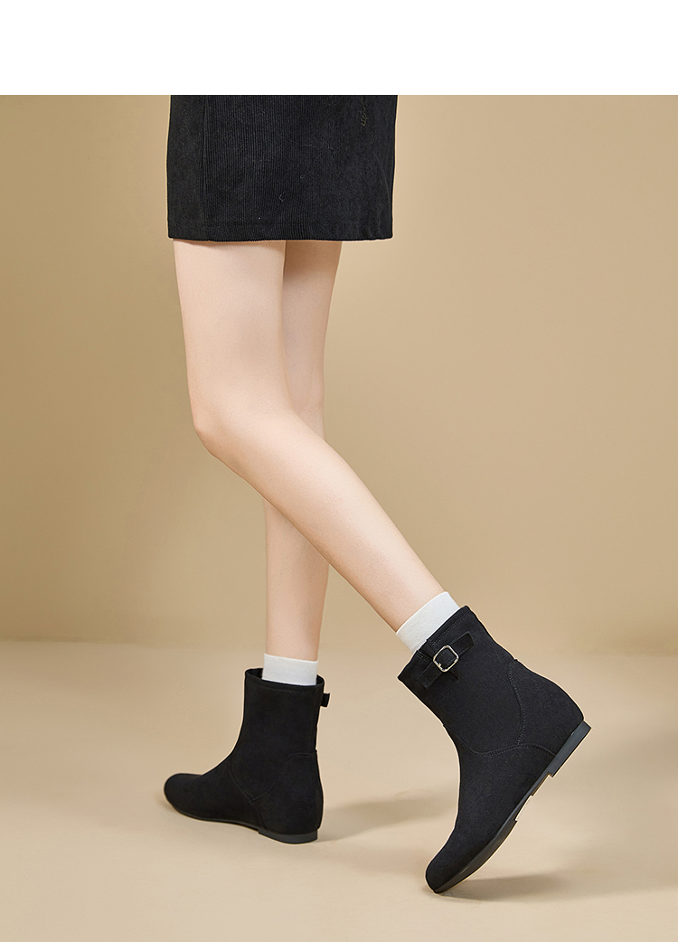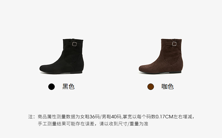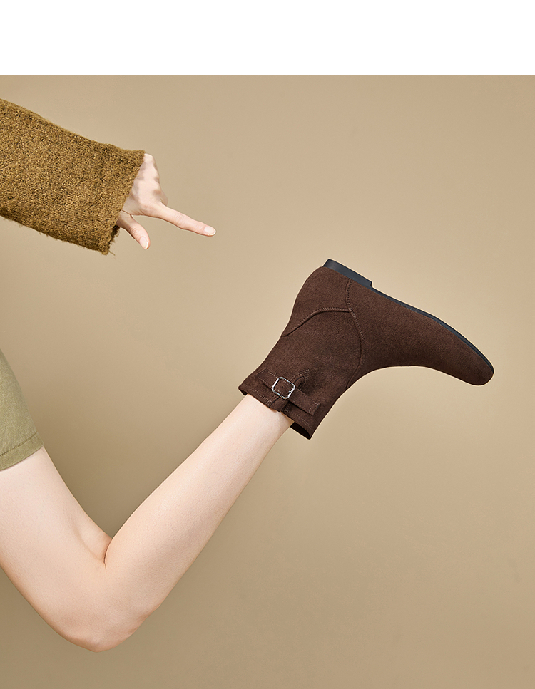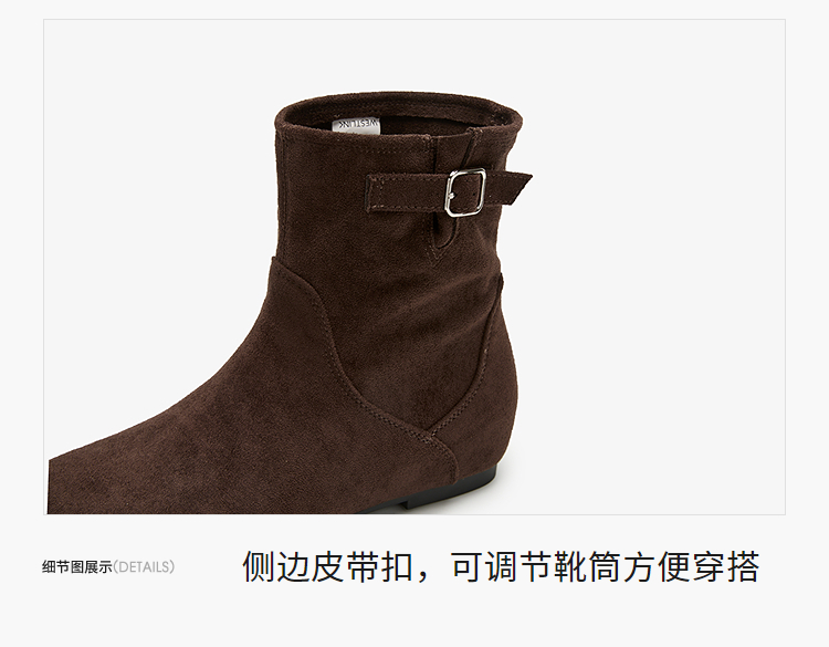 西遇平底短靴女新款秋冬复古绒面皮带扣马丁靴黑色圆头瘦瘦靴V2157196