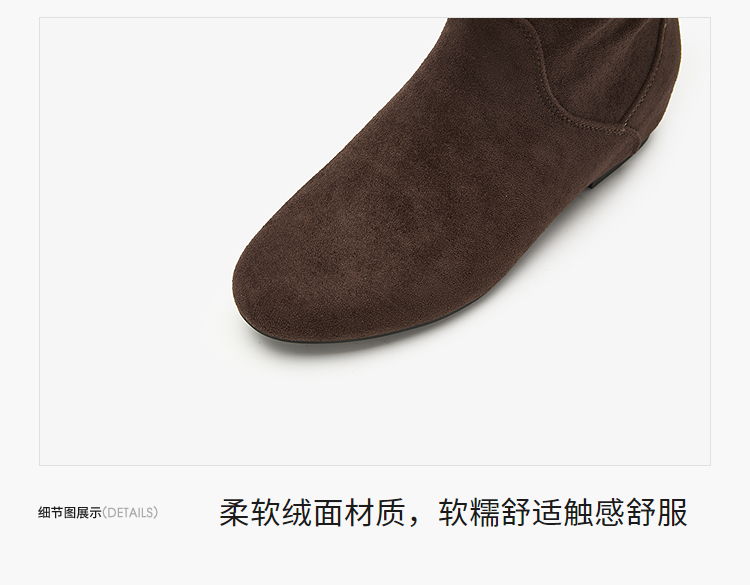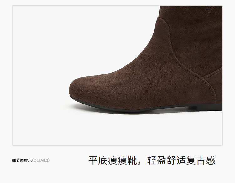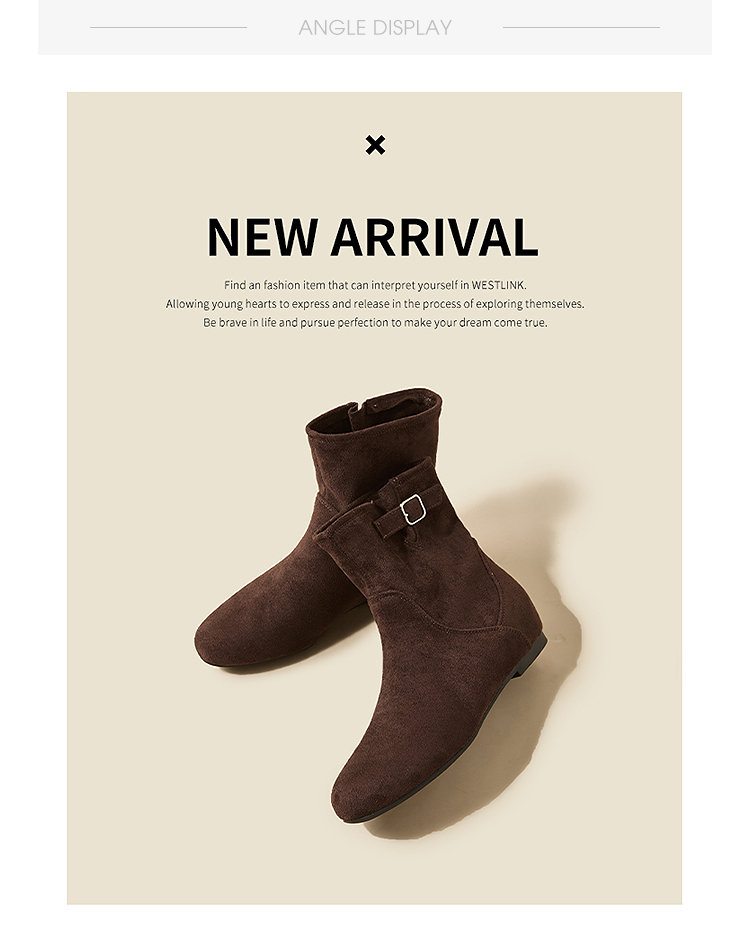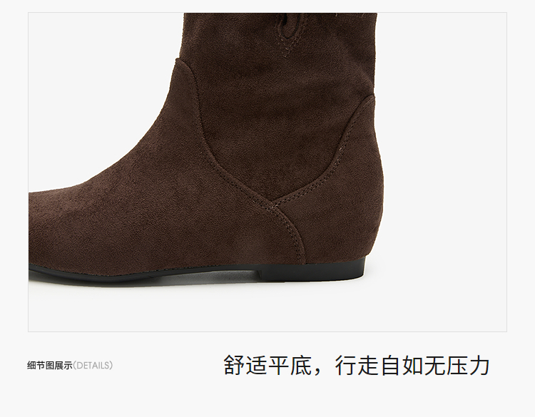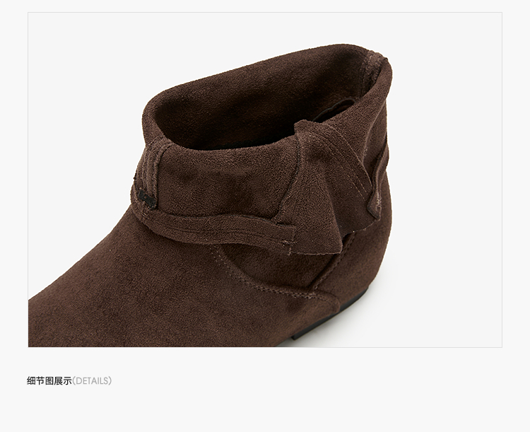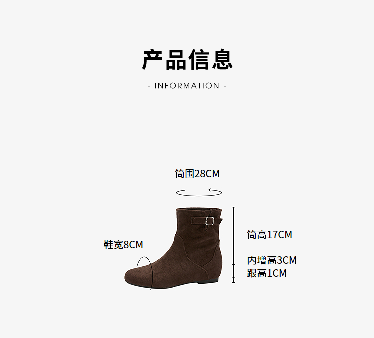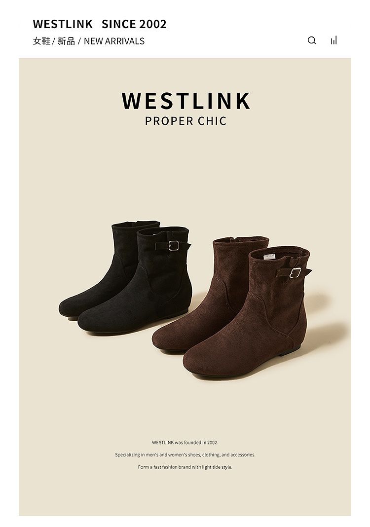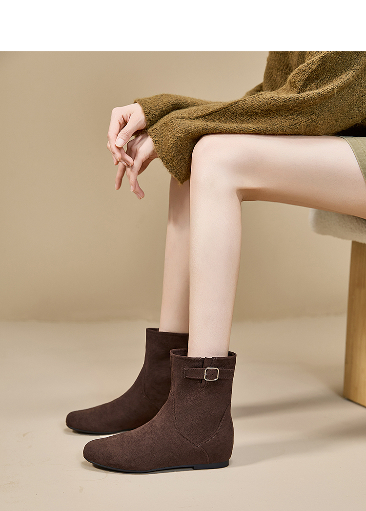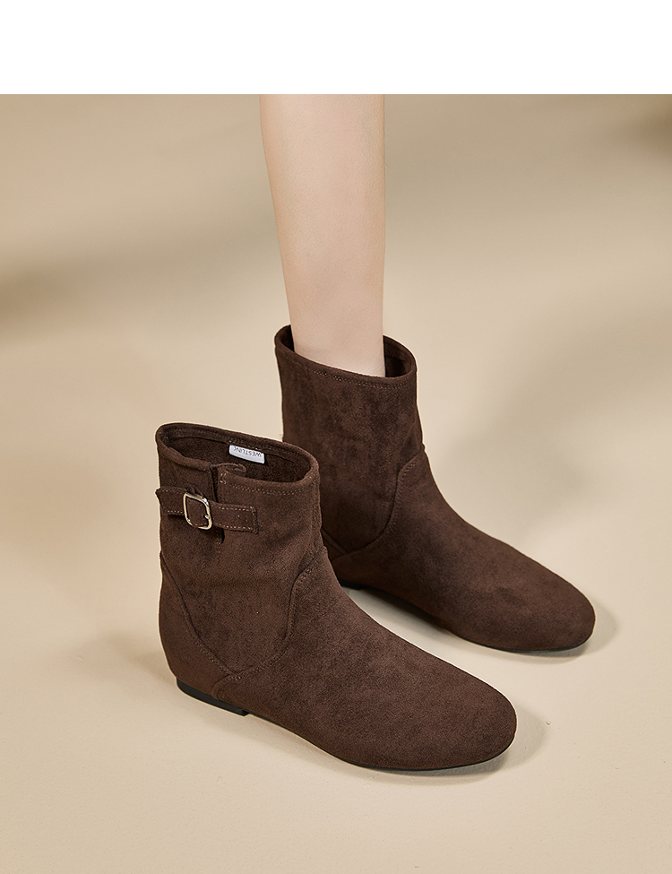西遇平底短靴女新款秋冬复古绒面皮带扣马丁靴黑色圆头瘦瘦靴V2157196
