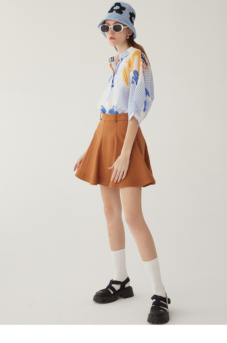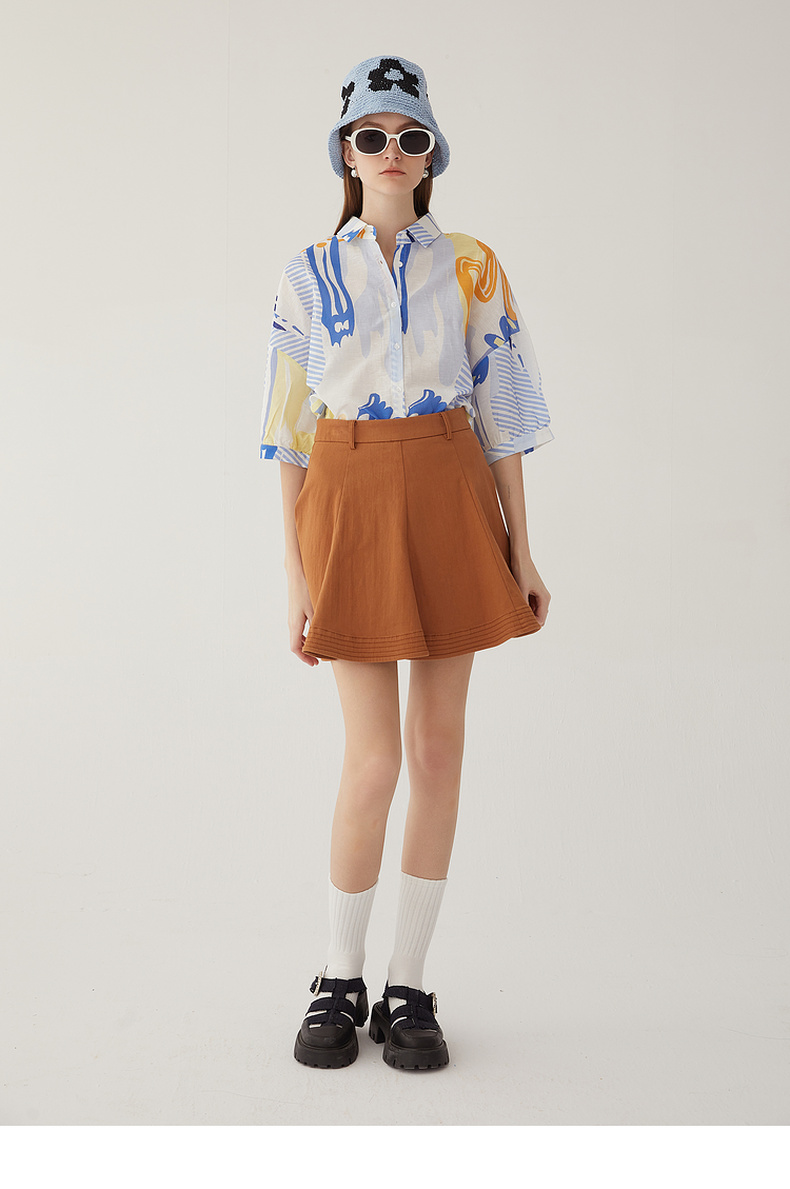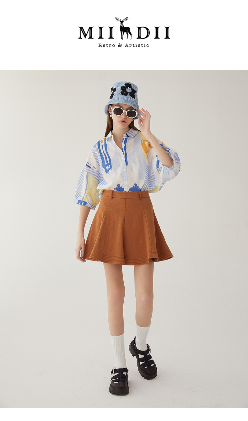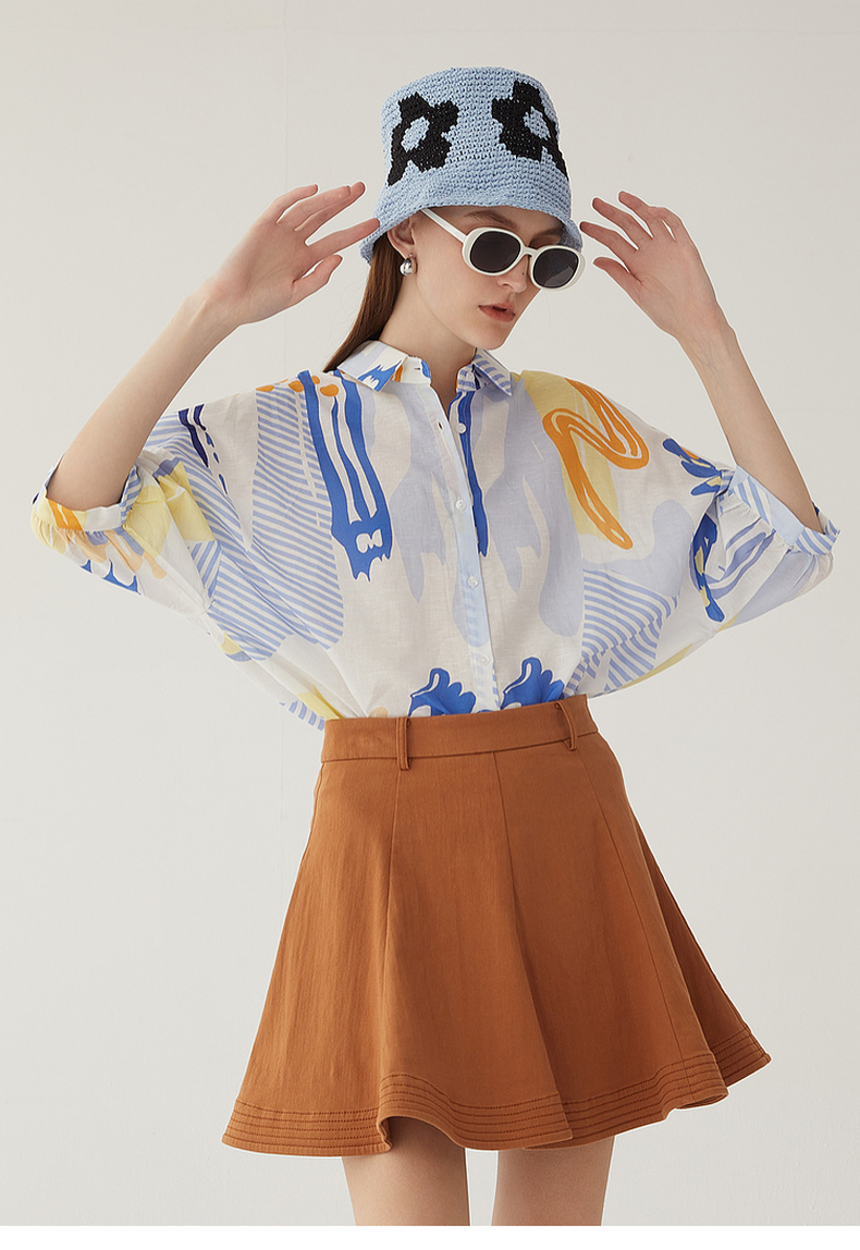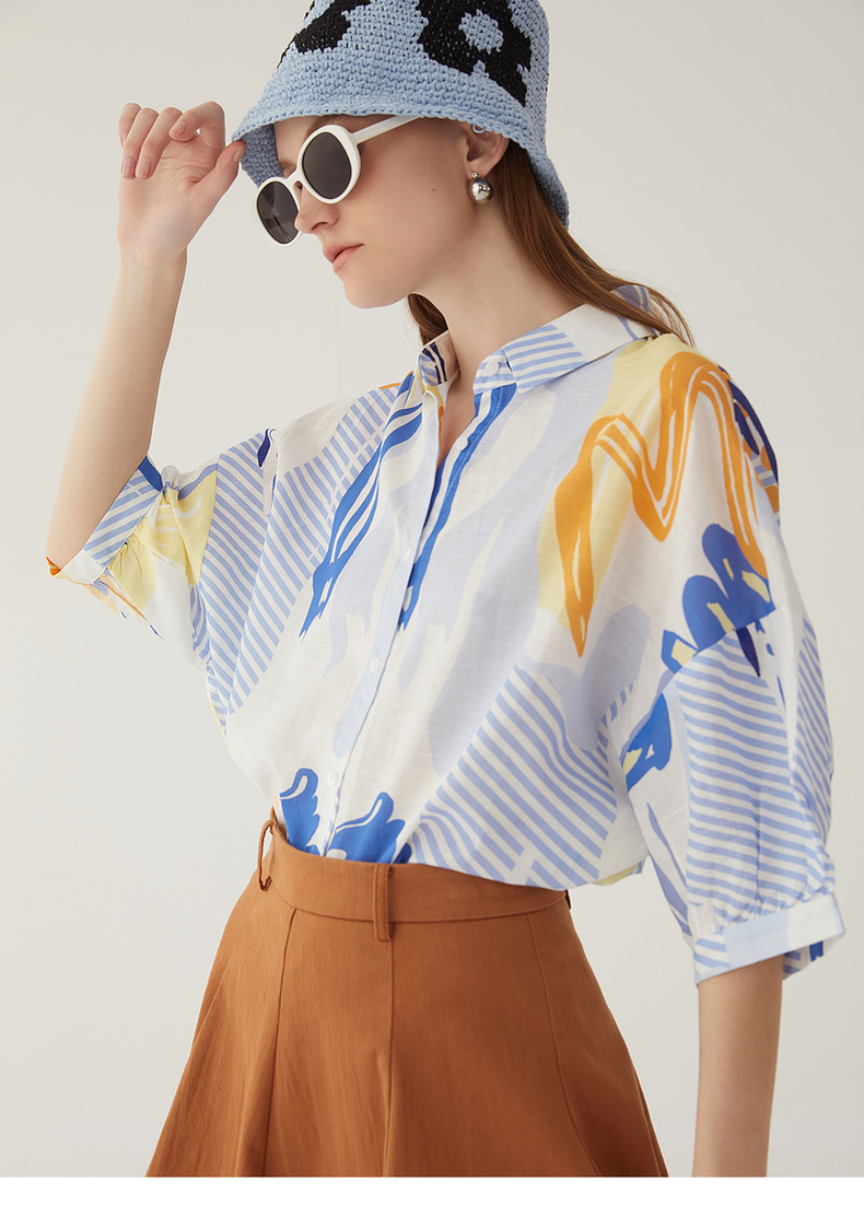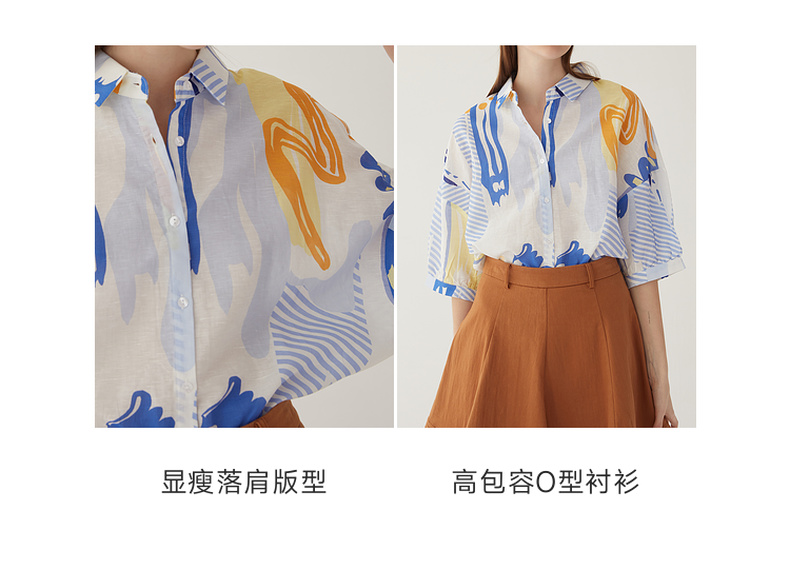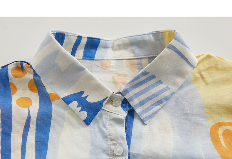 谜底棉麻衬衣2024夏季新款复古抽象印花宽松衬衫分袖女246MC7013