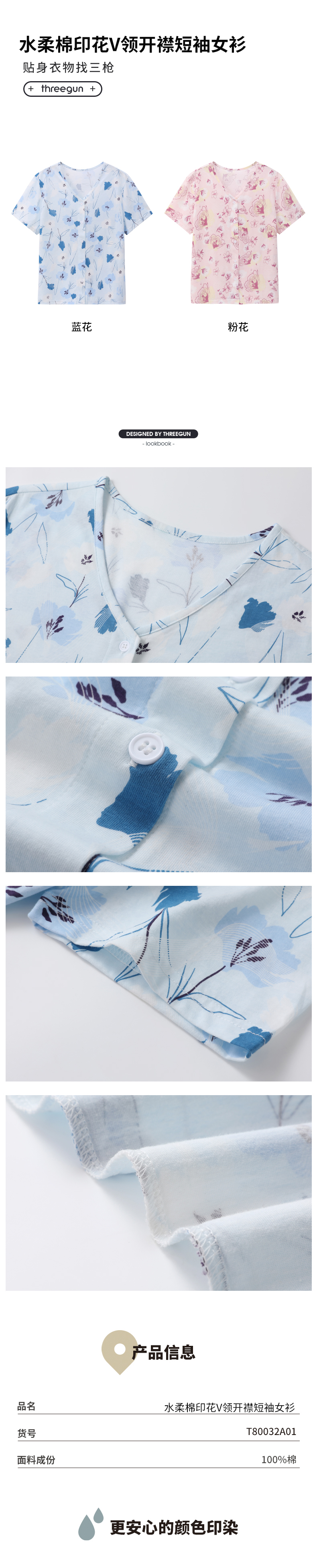 Threegun三枪 水柔棉印花V领开襟短袖女衫-T80032A01