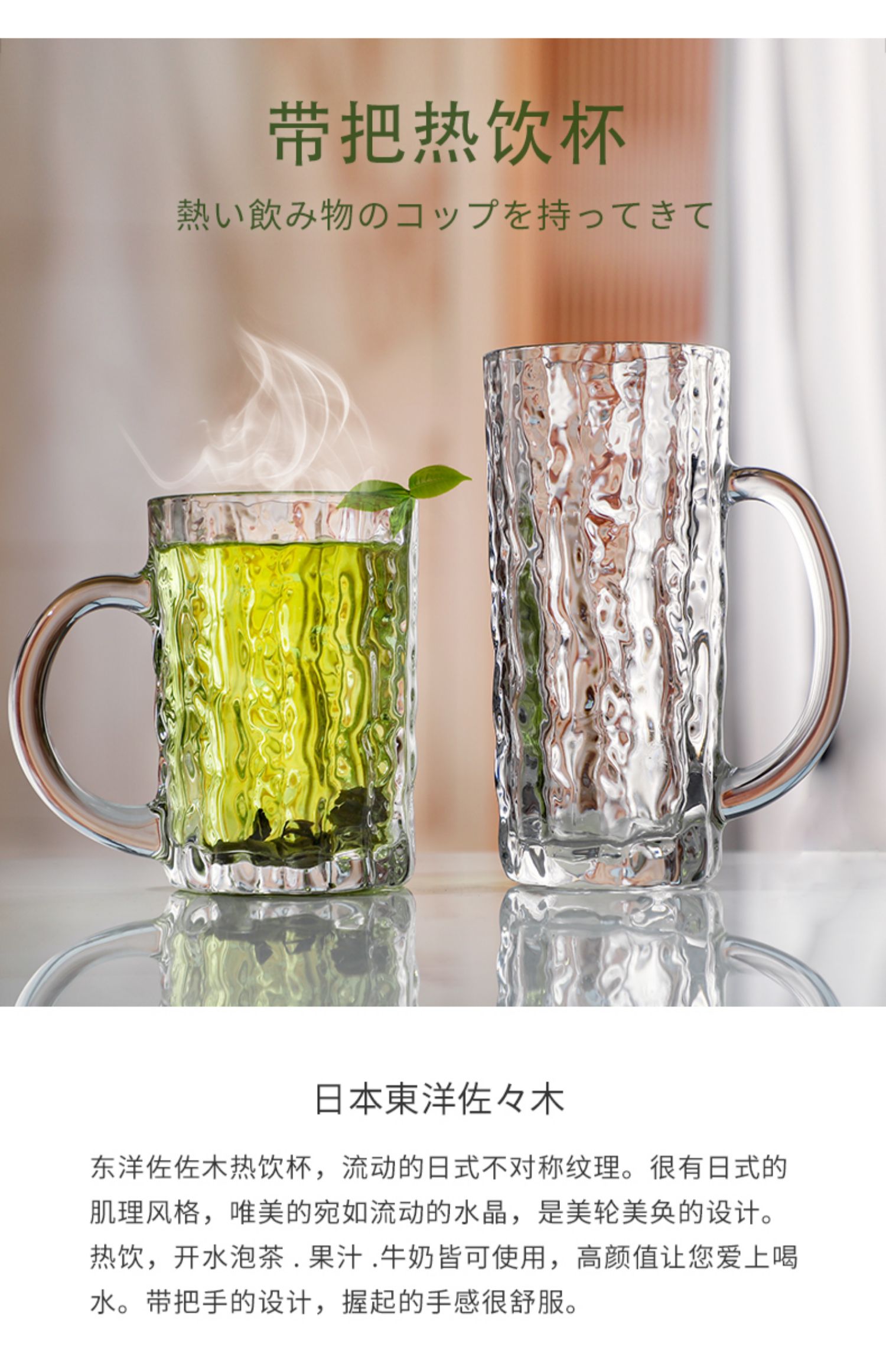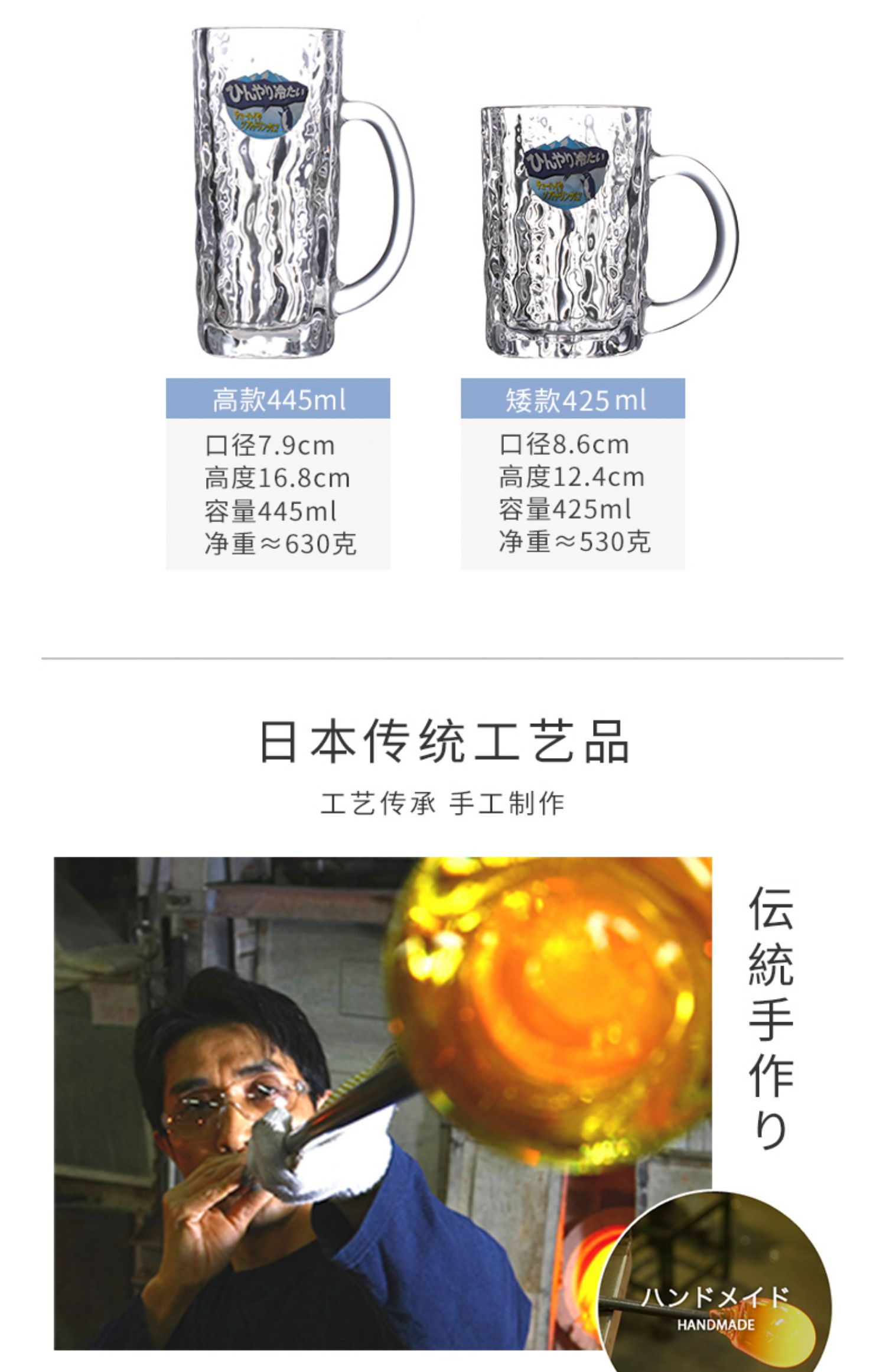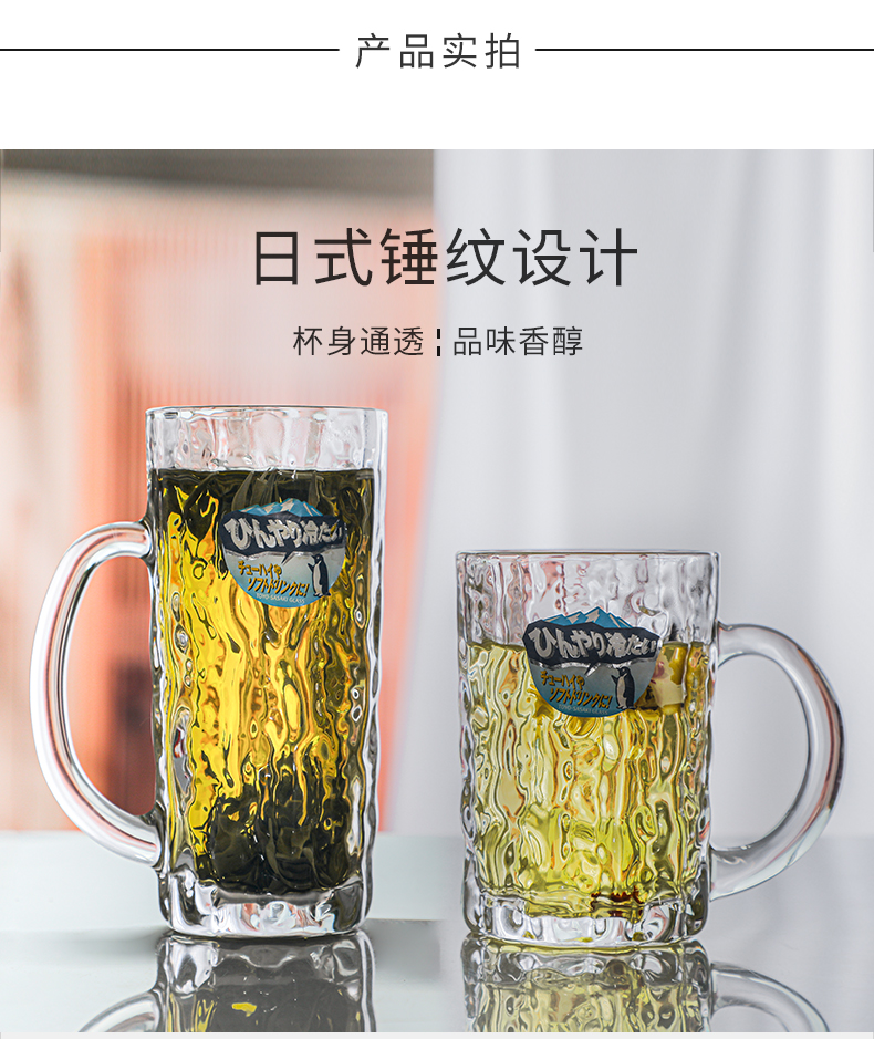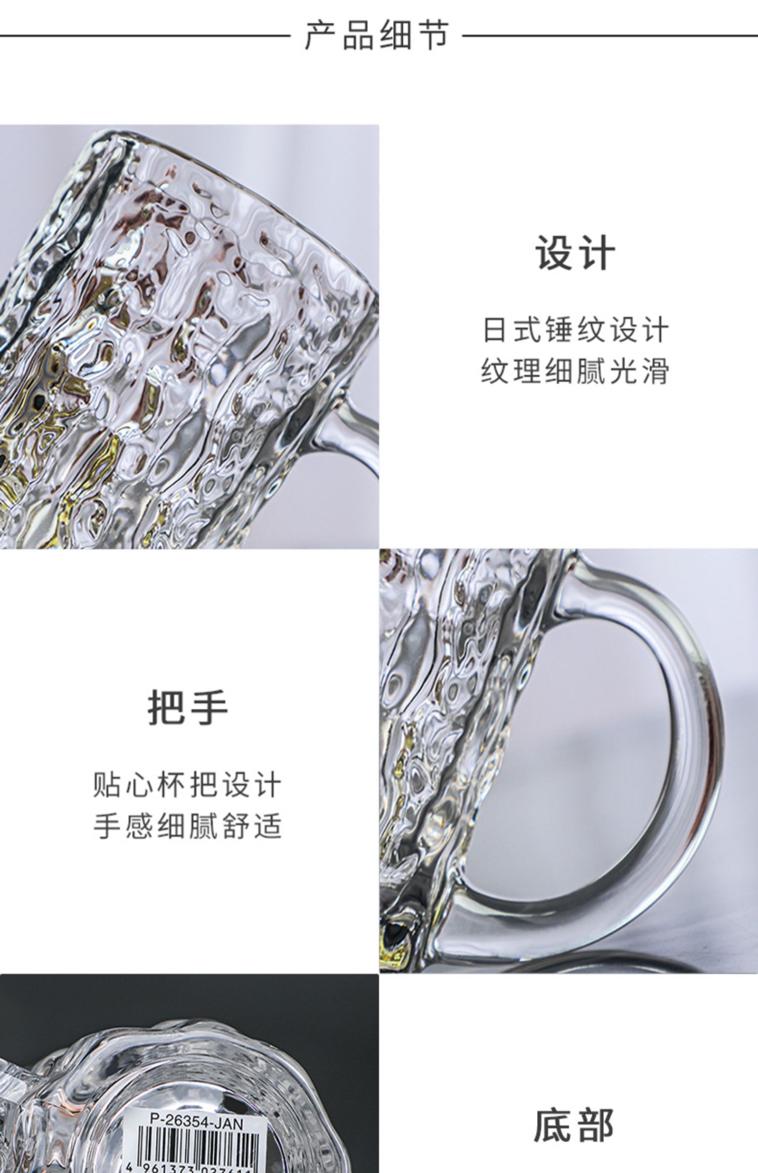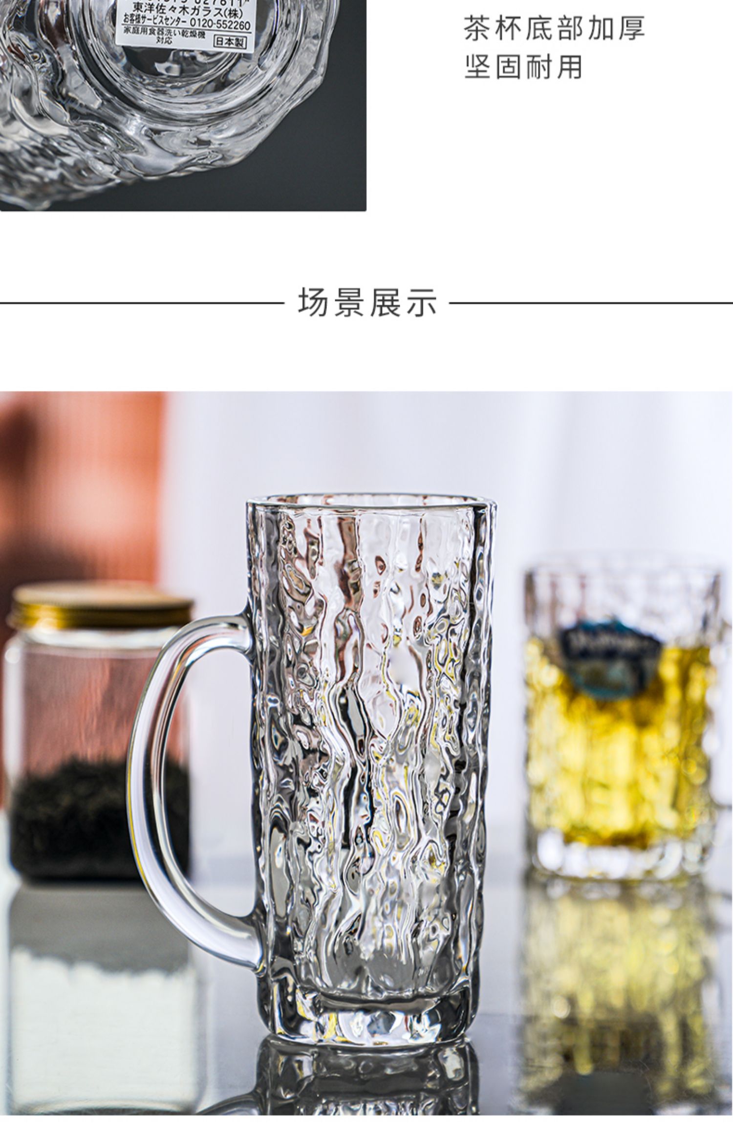 日本进口带把加厚水晶玻璃透明玻璃杯家用耐热泡茶杯牛奶杯啤酒杯佐佐木磨砂啤酒把杯425ml