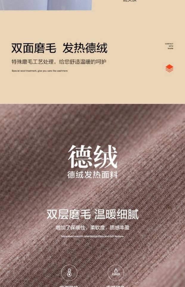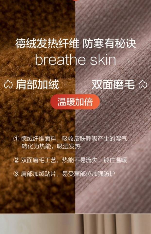 ——德绒发热黑科技,驱寒暖身,畅活养护,缓释微胶囊技术内含有远红外线分子,持久穿着,疏通筋络,具有温热效应