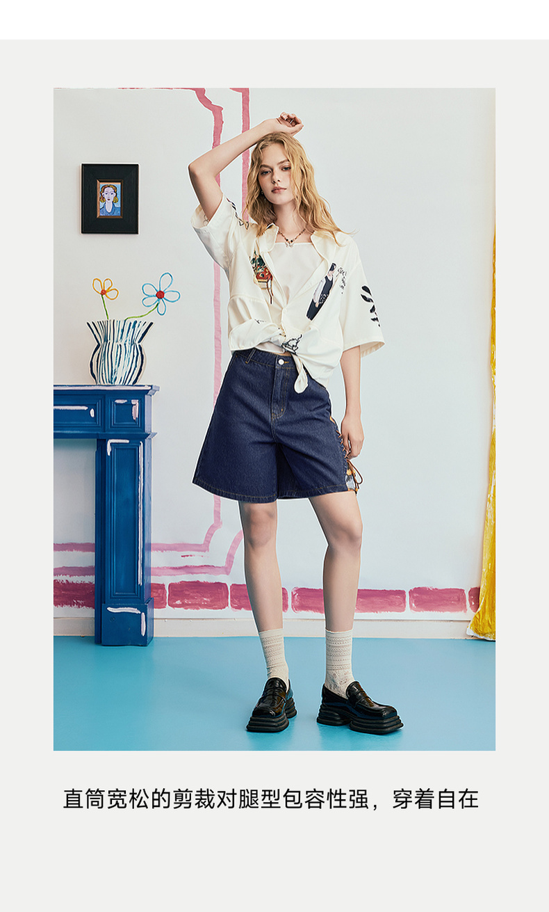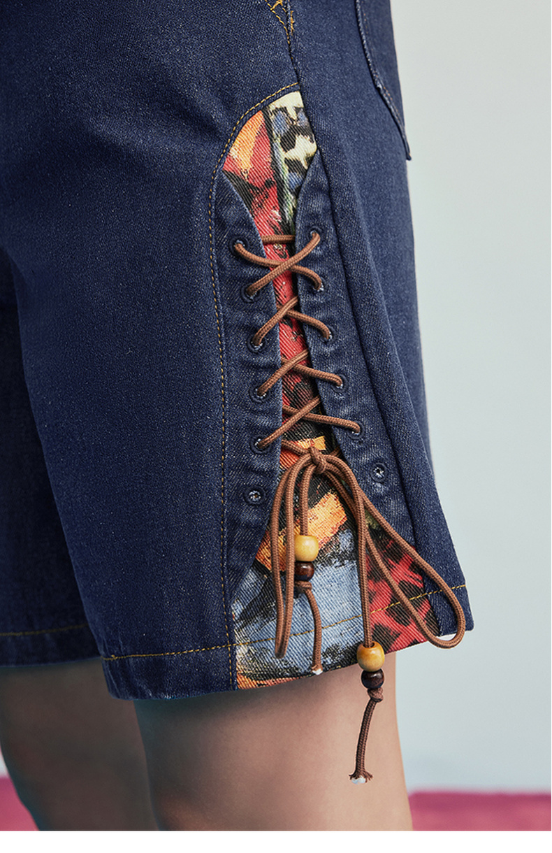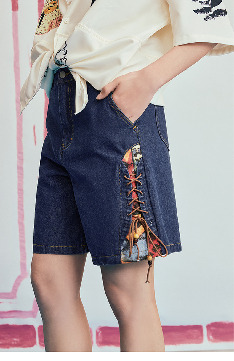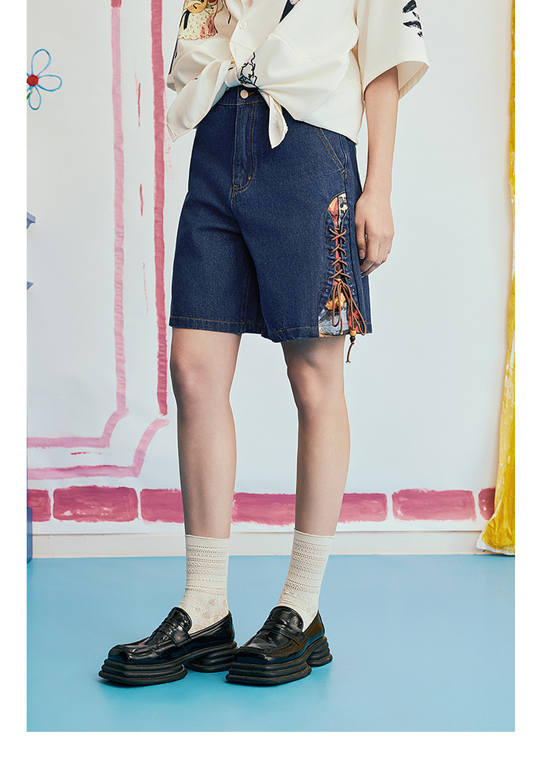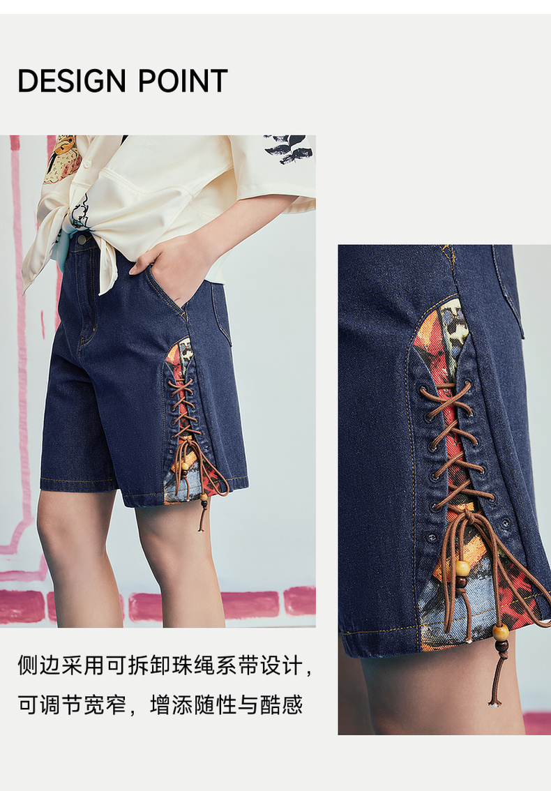 两三事 风漫星野 2025夏季新款休闲印花拼接绑带牛仔裤女宽松