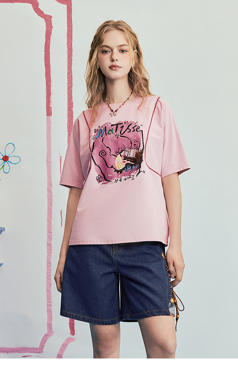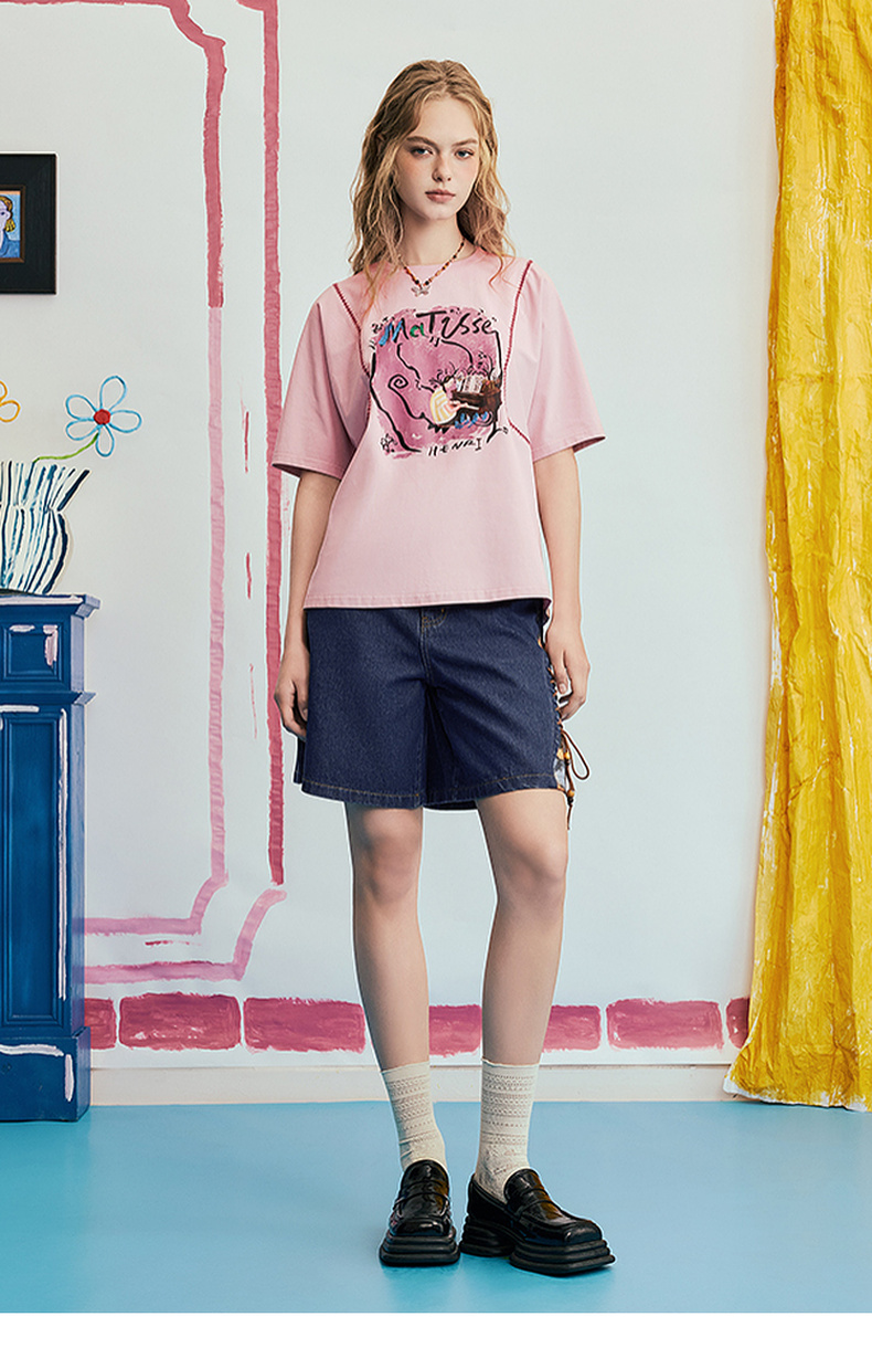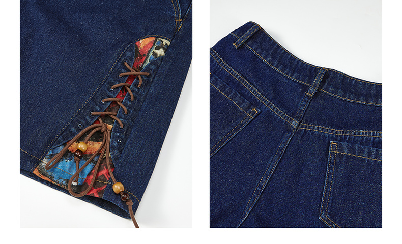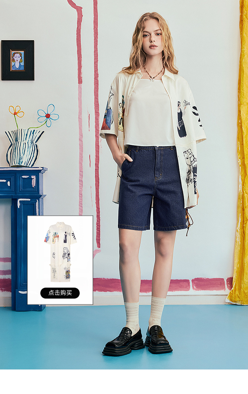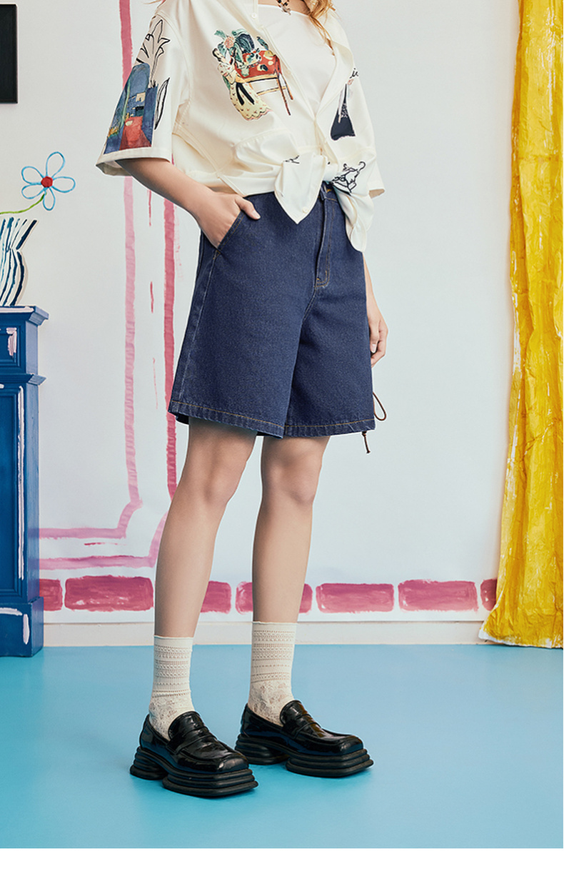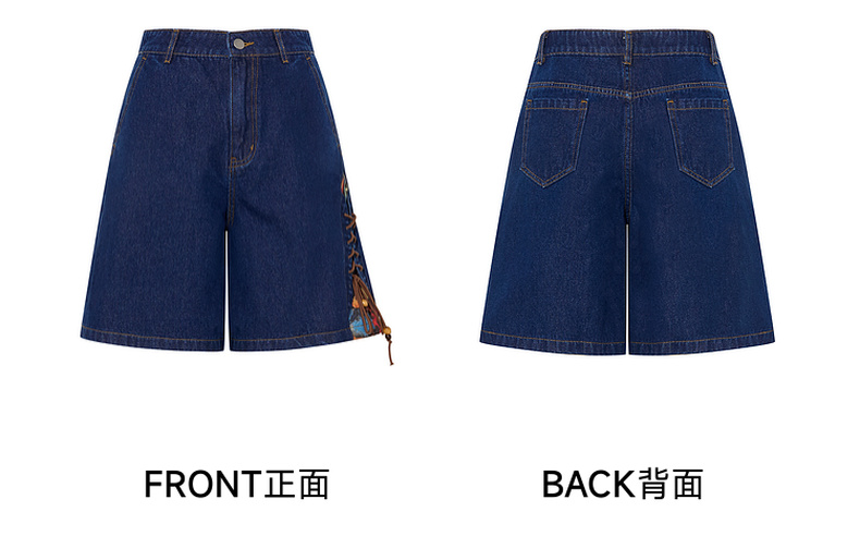 两三事 风漫星野 2025夏季新款休闲印花拼接绑带牛仔裤女宽松